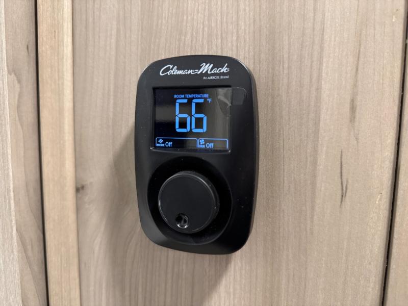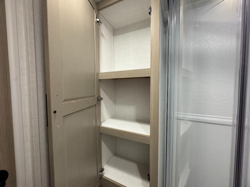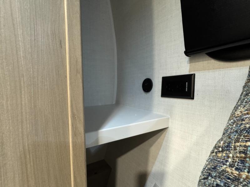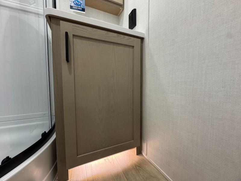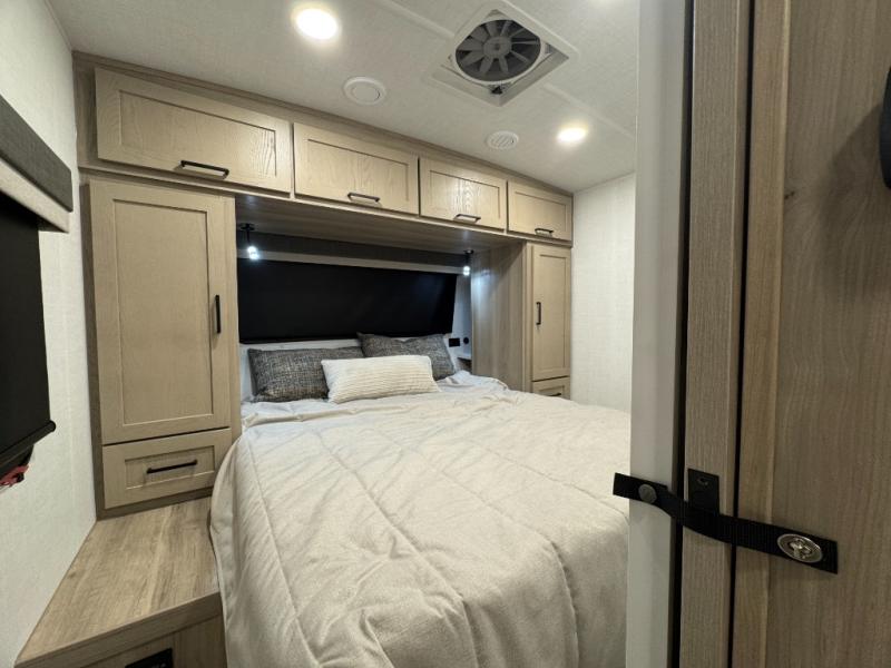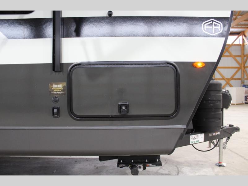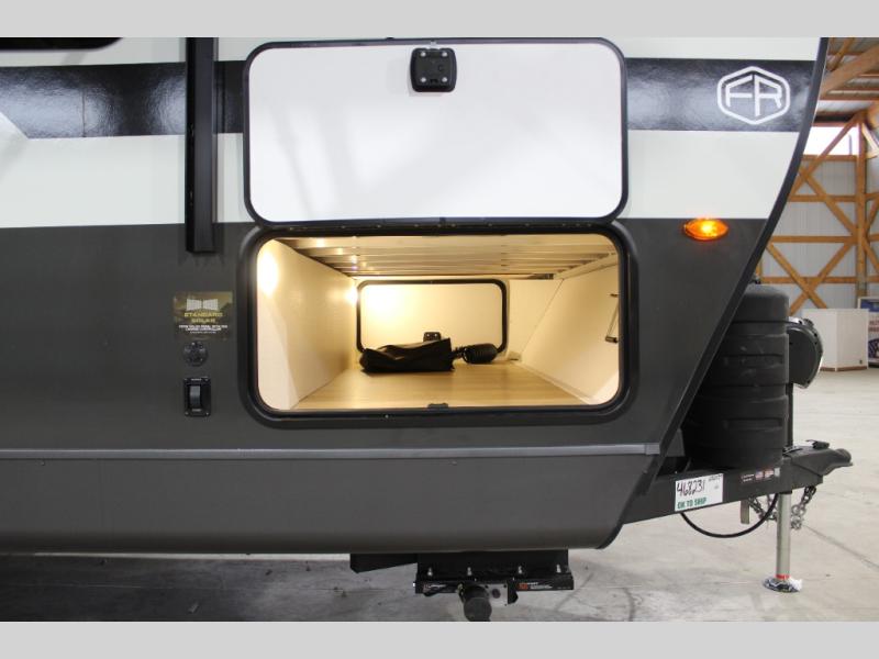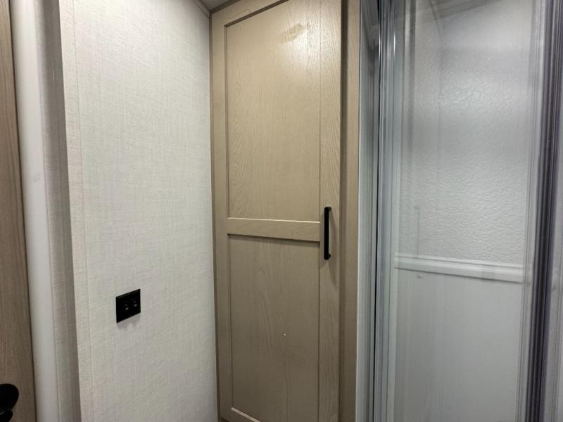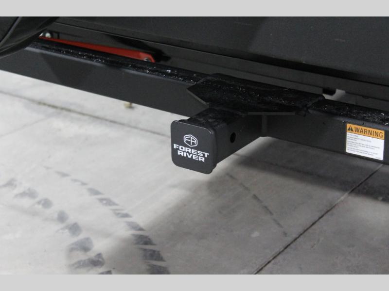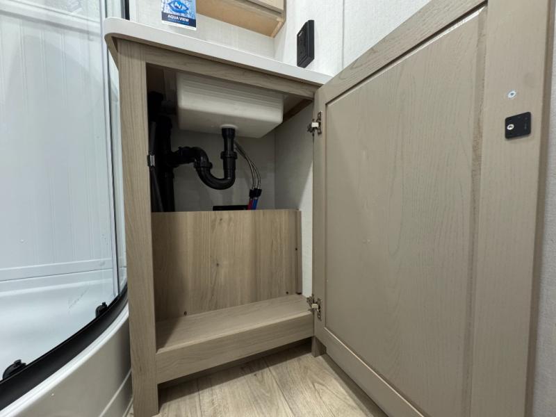 This bunkhouse model is perfect for your crew of six! You will appreciate the exterior bike door that lets you store gear under the flip-up bottom bunk, plus there is a pass-thru storage up front for even more storage. The RV queen bed in the front bedroom includes flip-up storage, two wardrobes, and a TV option if you like to stay up late with a movie. In the morning, everyone can meet in the combined kitchen and living area to dine around the U-shaped dinette, or you can take your plate outdoors to sit under the 18' power awning with LED lights. This model also includes an exterior griddle for a pancake breakfast!