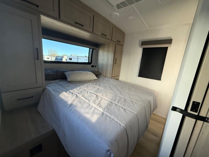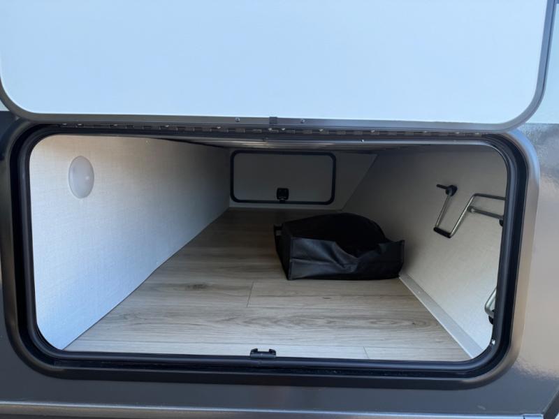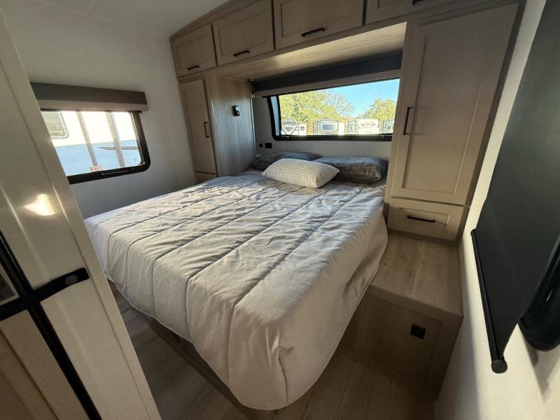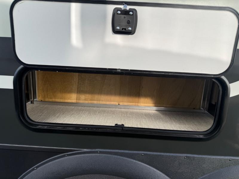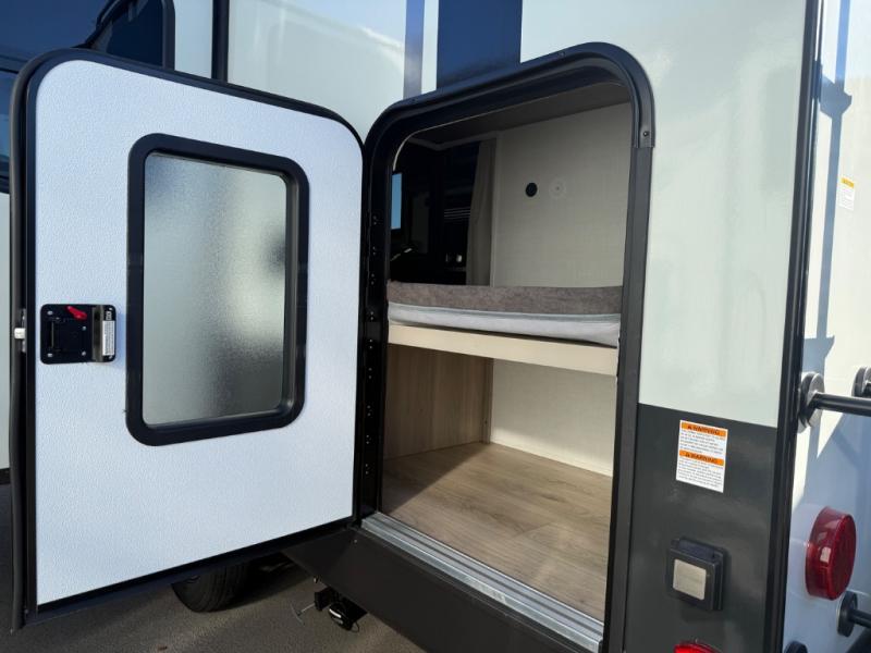 This bunkhouse model is perfect for your crew of six! You will appreciate the exterior bike door that lets you store gear under the flip-up bottom bunk, plus there is a pass-thru storage up front for even more storage. The RV queen bed in the front bedroom includes flip-up storage, two wardrobes, and a TV option if you like to stay up late with a movie. In the morning, everyone can meet in the combined kitchen and living area to dine around the U-shaped dinette, or you can take your plate outdoors to sit under the 18' power awning with LED lights. This model also includes an exterior griddle for a pancake breakfast!