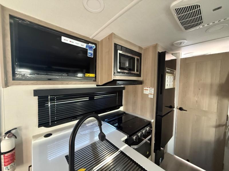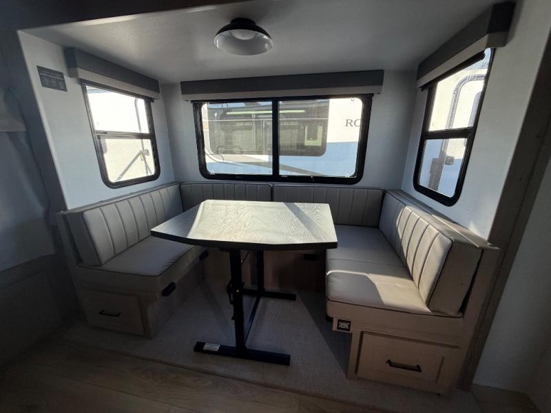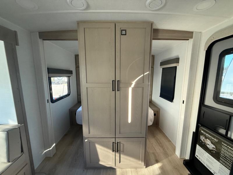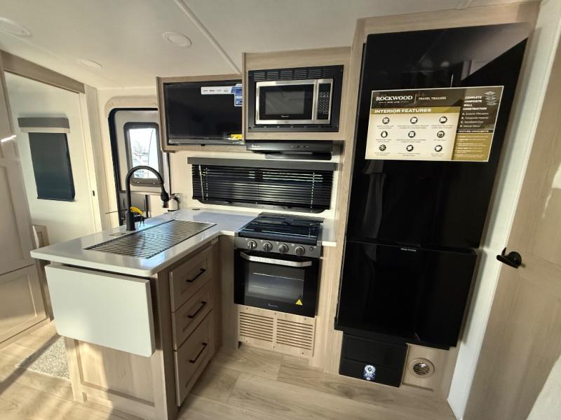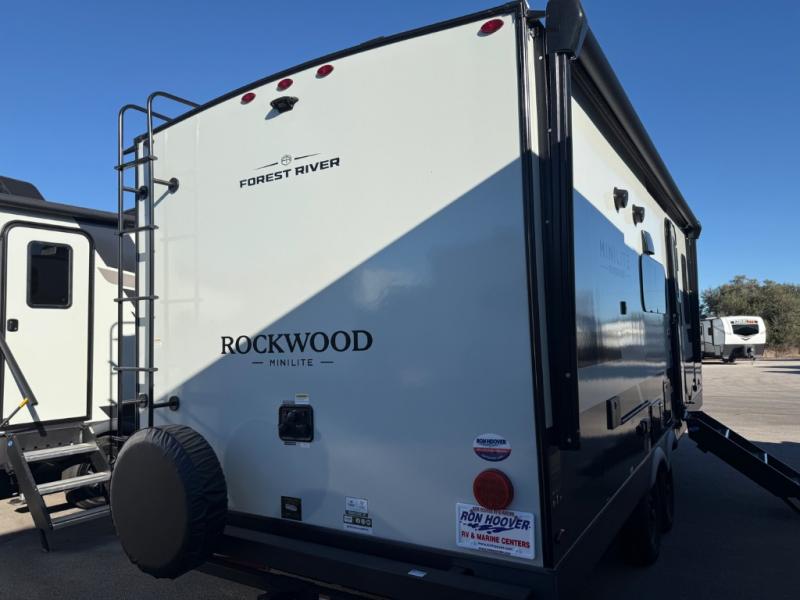 Each Rockwood Mini Lite travel trailer by Forest River is constructed with a fully laminated one-piece walkable roof, sleek frameless windows, and a six-sided full aluminum frame for strength and durability. The 12V thermostatically controlled heated tanks, plus radiant foil in the underbelly will allow you to camp well into the colder months, and the 200W roof solar panel will be perfect for a little off-gridding. Each model includes solid surface kitchen countertops, hidden hinge cabinet doors, roller shades, plus many more interior features. Having an AIR 360+ omnidirectional antenna with WiFi prep on board gives you the option to get some work done if it's needed, and the power tongue jack provides hassle-free set up, so you can enjoy more time relaxing!