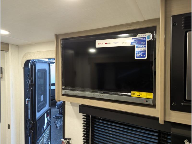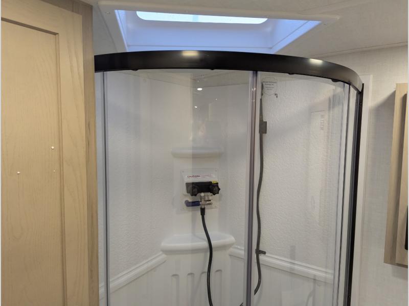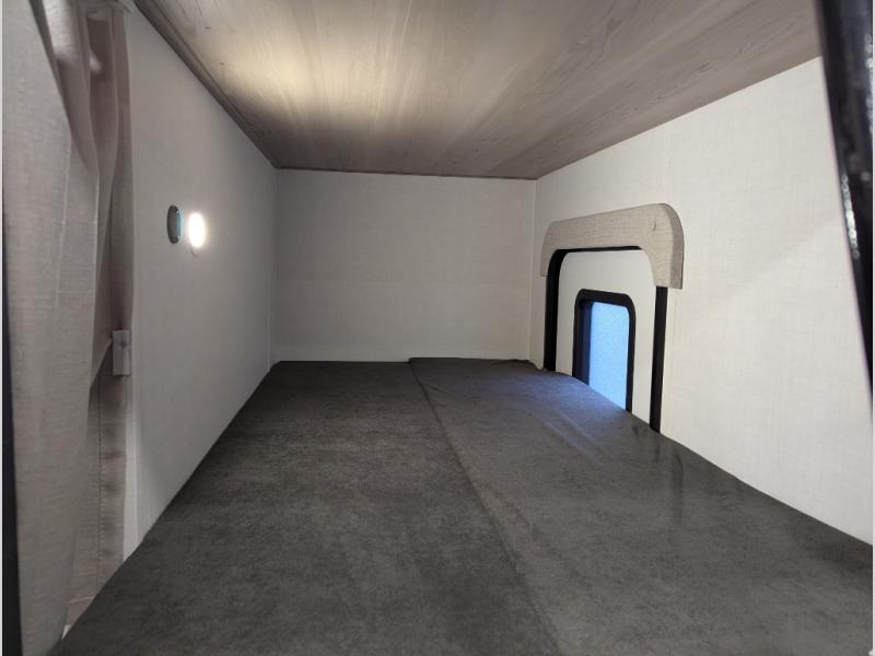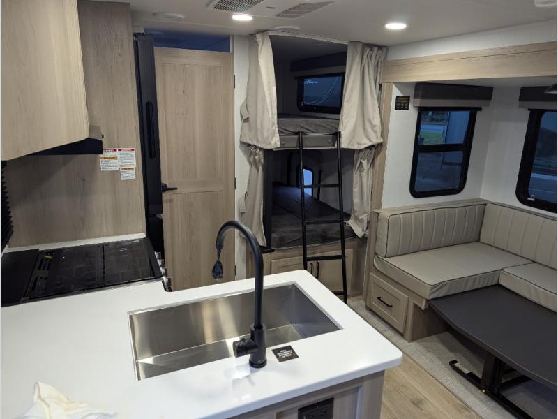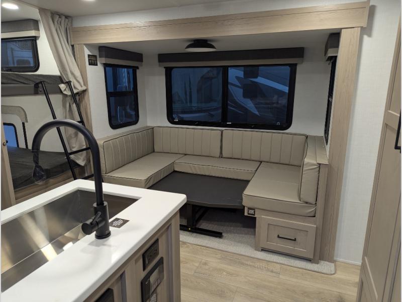This bunkhouse model is perfect for your crew of six! You will appreciate the exterior bike door that lets you store gear under the flip-up bottom bunk, plus there is a pass-thru storage up front for even more storage. The RV queen bed in the front bedroom includes flip-up storage, two wardrobes, and a TV option if you like to stay up late with a movie. In the morning, everyone can meet in the combined kitchen and living area to dine around the U-shaped dinette, or you can take your plate outdoors to sit under the 18' power awning with LED lights. This model also includes an exterior griddle for a pancake breakfast!