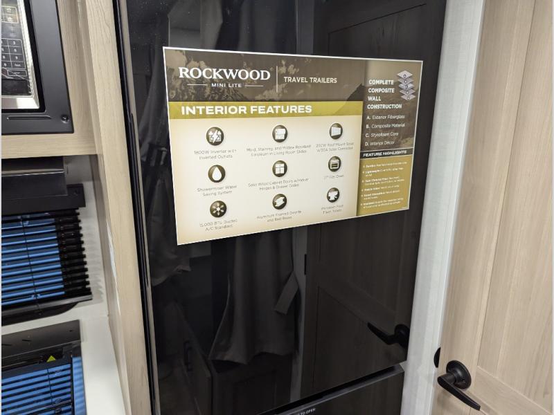 Each Rockwood Mini Lite travel trailer by Forest River is constructed with a fully laminated one-piece walkable roof, sleek frameless windows, and a six-sided full aluminum frame for strength and durability. The 12V thermostatically controlled heated tanks, plus radiant foil in the underbelly will allow you to camp well into the colder months, and the 200W roof solar panel will be perfect for a little off-gridding. Each model includes solid surface kitchen countertops, hidden hinge cabinet doors, roller shades, plus many more interior features. Having an AIR 360+ omnidirectional antenna with WiFi prep on board gives you the option to get some work done if it's needed, and the power tongue jack provides hassle-free set up, so you can enjoy more time relaxing!