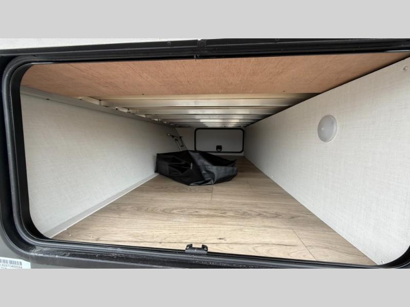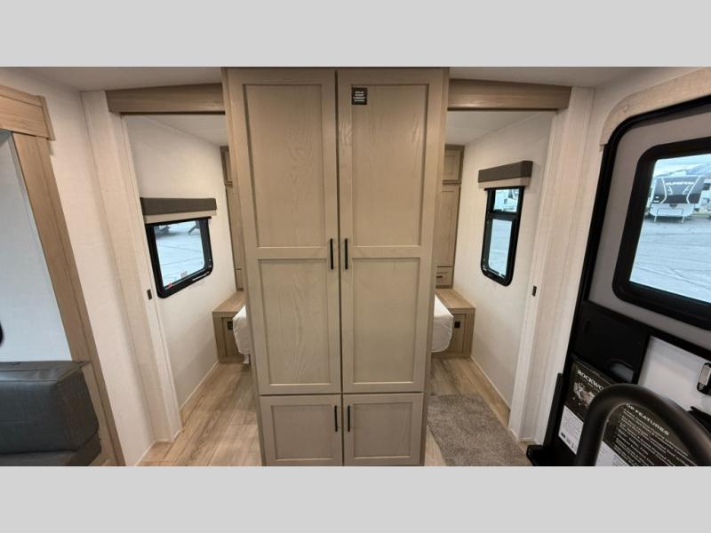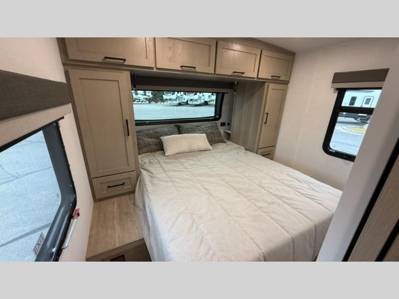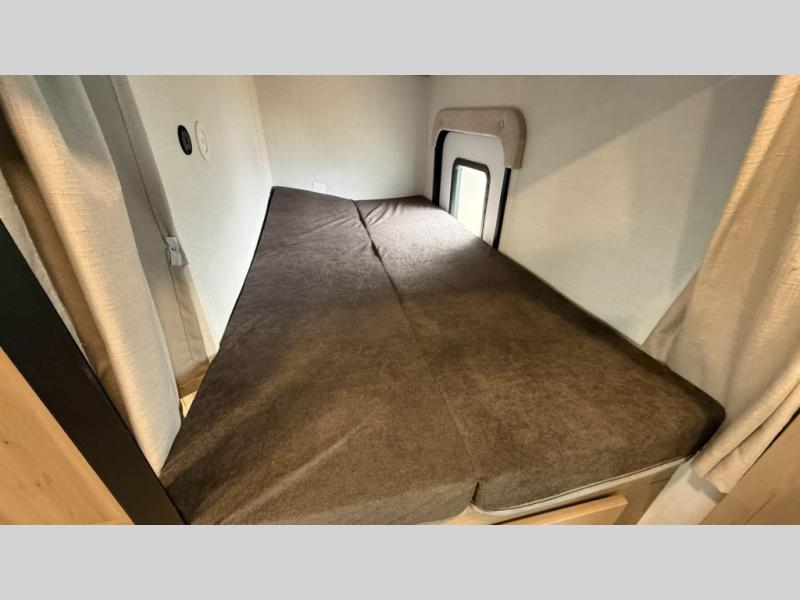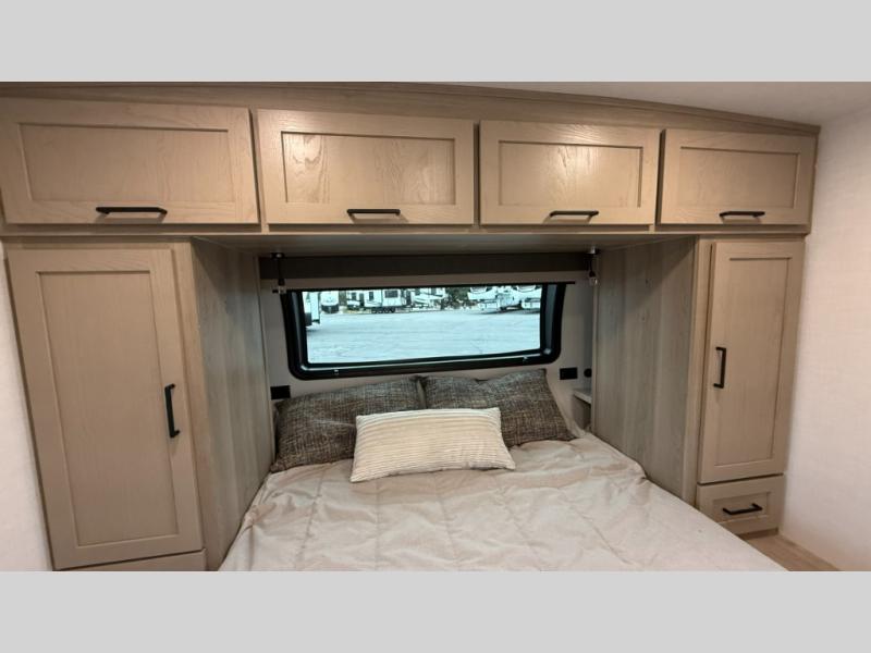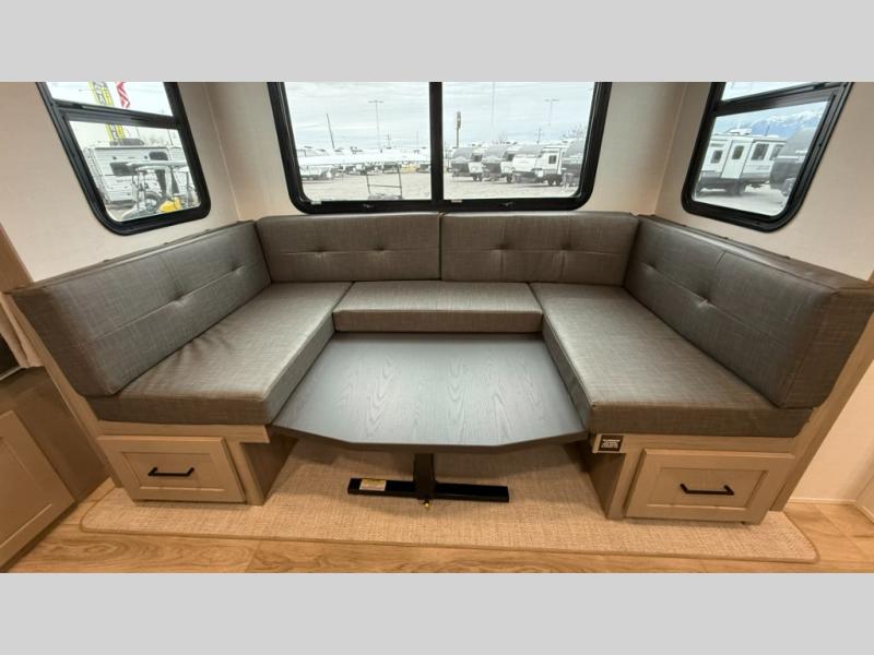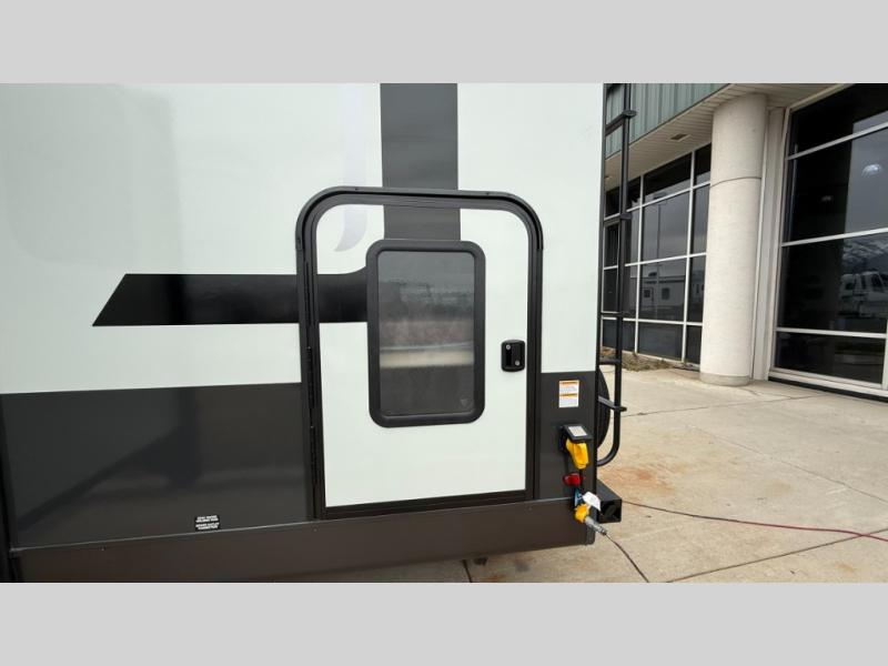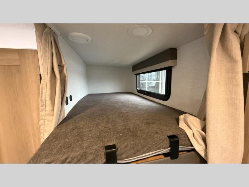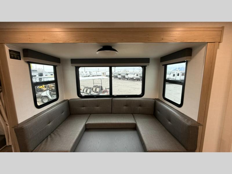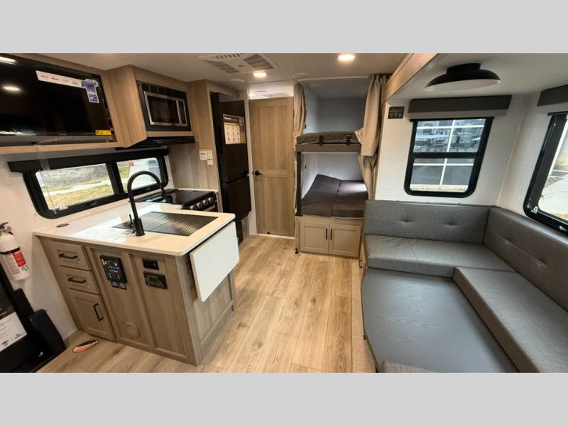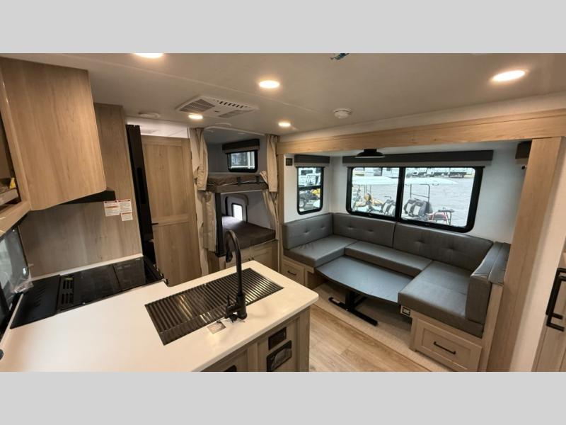 This bunkhouse model is perfect for your crew of six! You will appreciate the exterior bike door that lets you store gear under the flip-up bottom bunk, plus there is a pass-thru storage up front for even more storage. The RV queen bed in the front bedroom includes flip-up storage, two wardrobes, and a TV option if you like to stay up late with a movie. In the morning, everyone can meet in the combined kitchen and living area to dine around the U-shaped dinette, or you can take your plate outdoors to sit under the 18' power awning with LED lights.