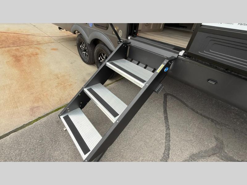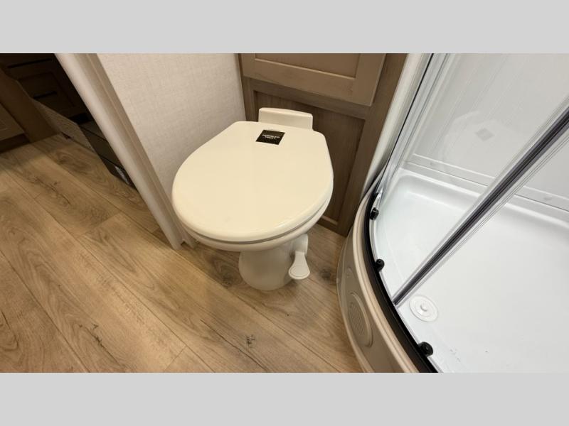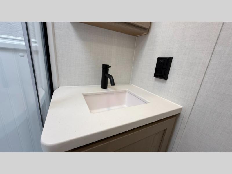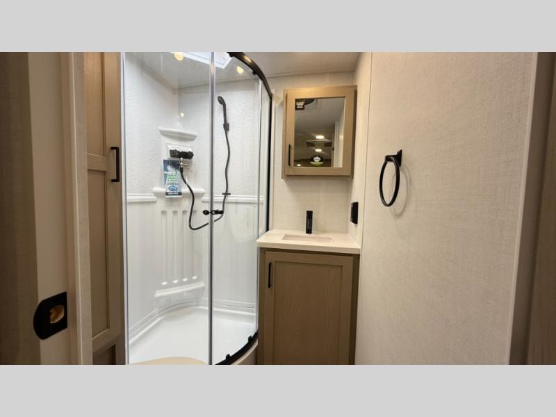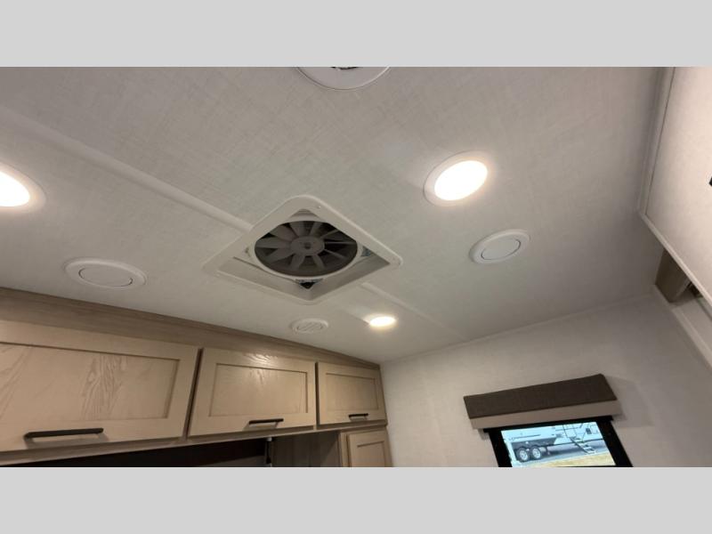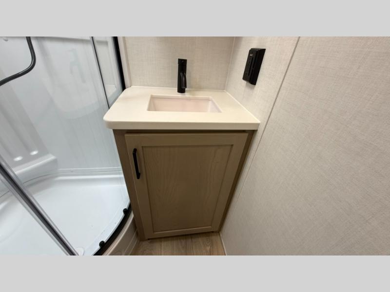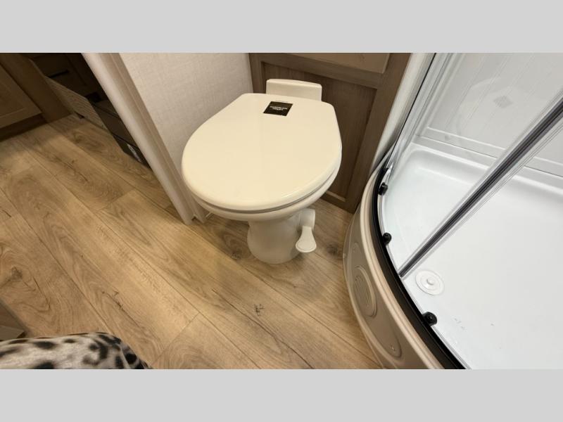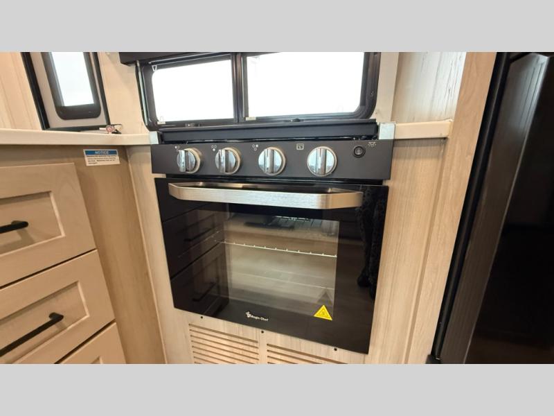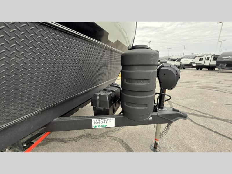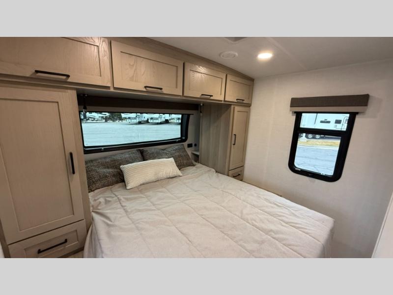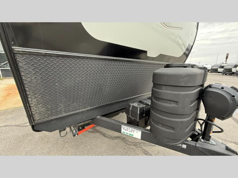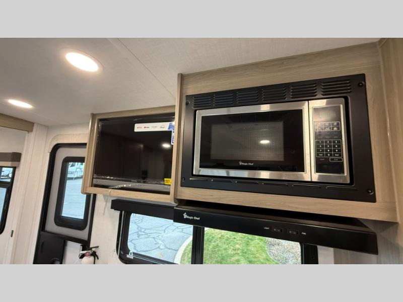 This bunkhouse model is perfect for your crew of six! You will appreciate the exterior bike door that lets you store gear under the flip-up bottom bunk, plus there is a pass-thru storage up front for even more storage. The RV queen bed in the front bedroom includes flip-up storage, two wardrobes, and a TV option if you like to stay up late with a movie. In the morning, everyone can meet in the combined kitchen and living area to dine around the U-shaped dinette, or you can take your plate outdoors to sit under the 18' power awning with LED lights.