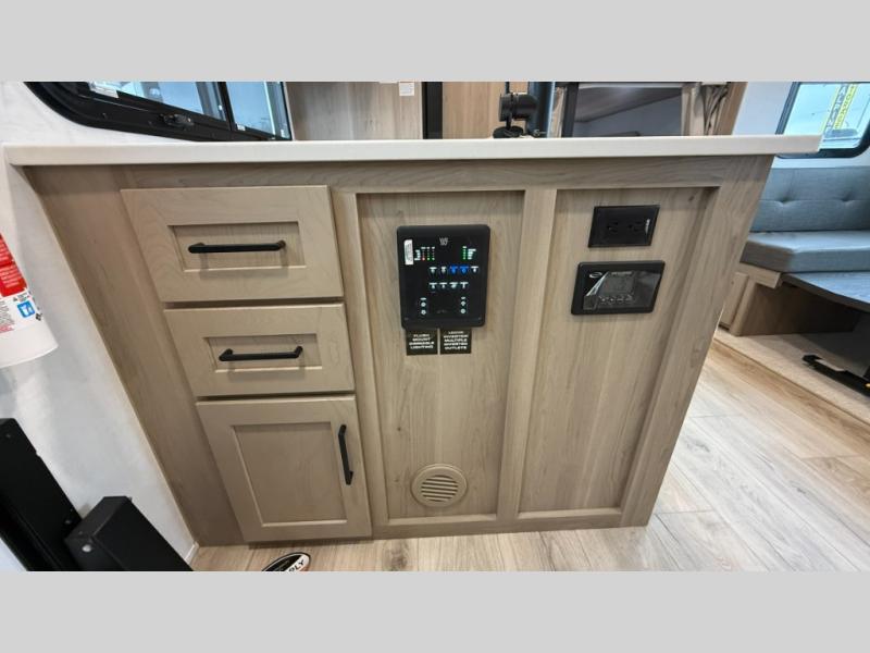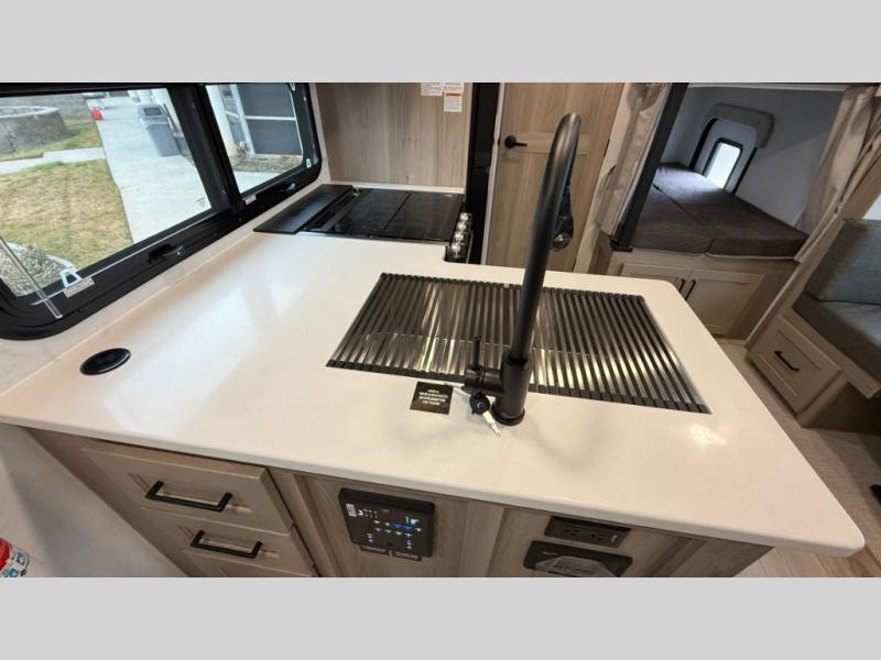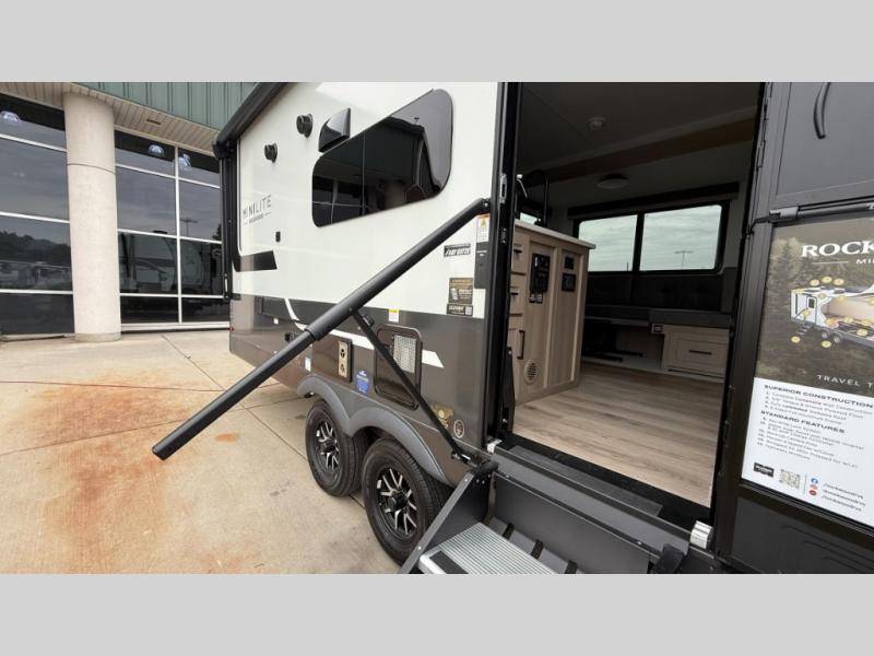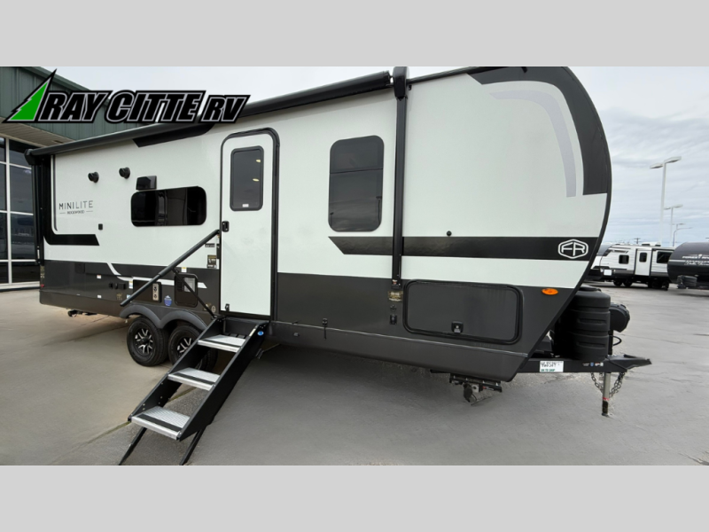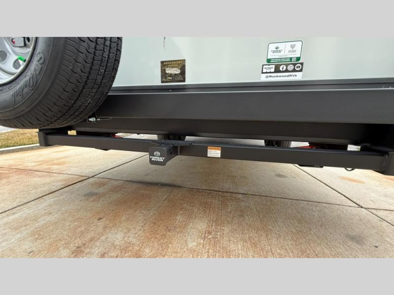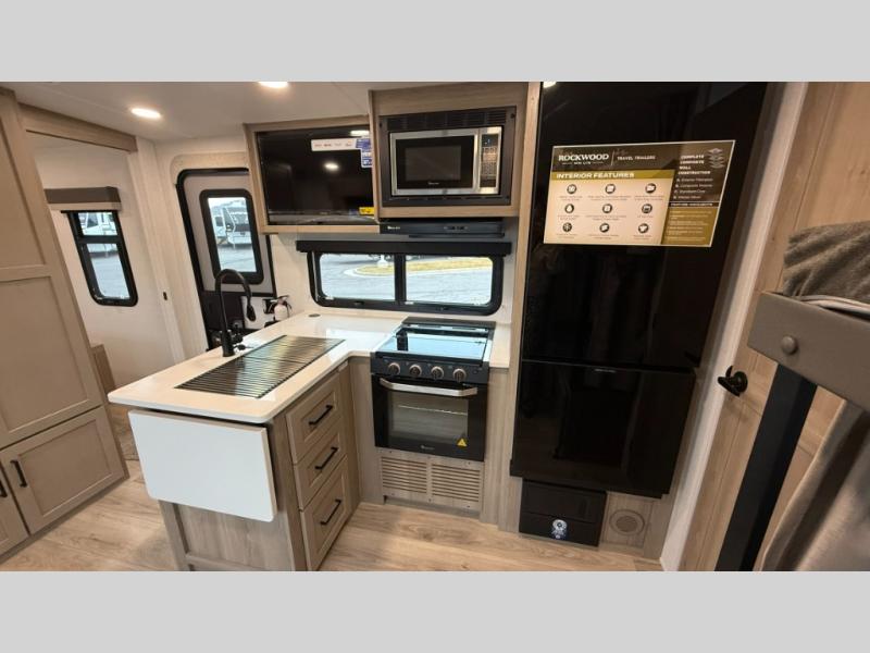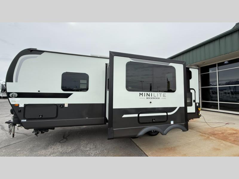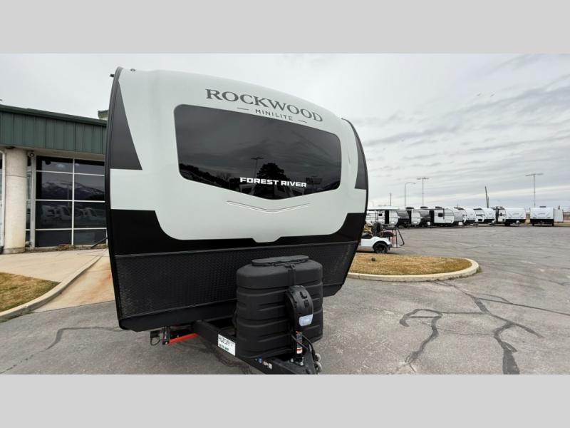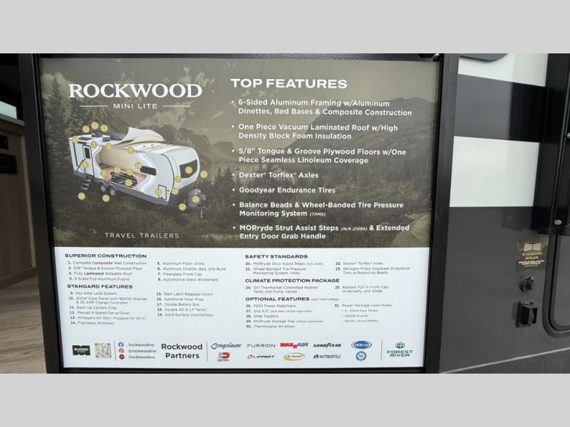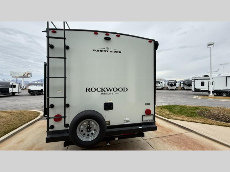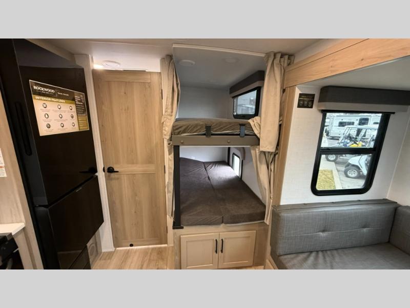 Each Rockwood Mini Lite travel trailer by Forest River is constructed with a fully laminated one-piece walkable roof, sleek frameless windows, and a six-sided full aluminum frame for strength and durability. The 12V thermostatically controlled heated tanks, plus radiant foil in the underbelly will allow you to camp well into the colder months, and the 200W roof solar panel will be perfect for a little off-gridding. Each model includes solid surface kitchen countertops, hidden hinge cabinet doors, roller shades, plus many more interior features. Having an AIR 360+ omnidirectional antenna with WiFi prep on board gives you the option to get some work done if it's needed, and the power tongue jack provides hassle-free set up, so you can enjoy more time relaxing!