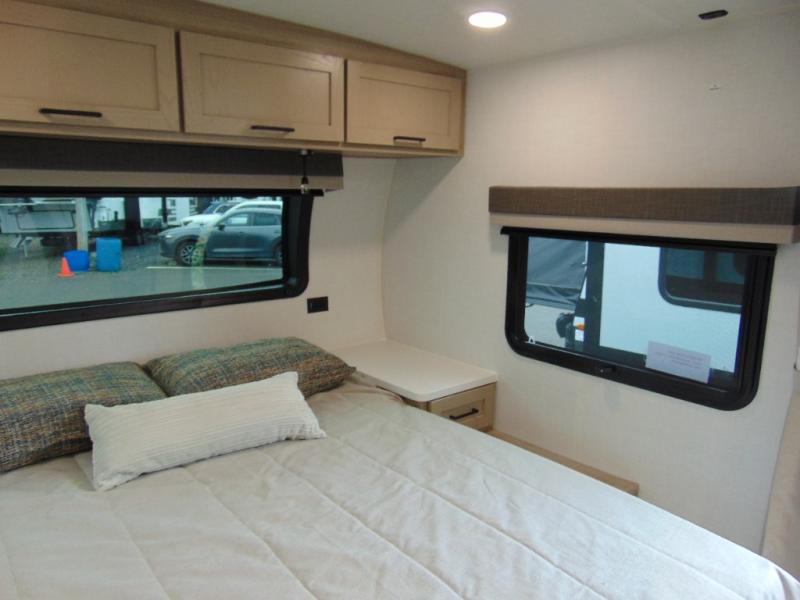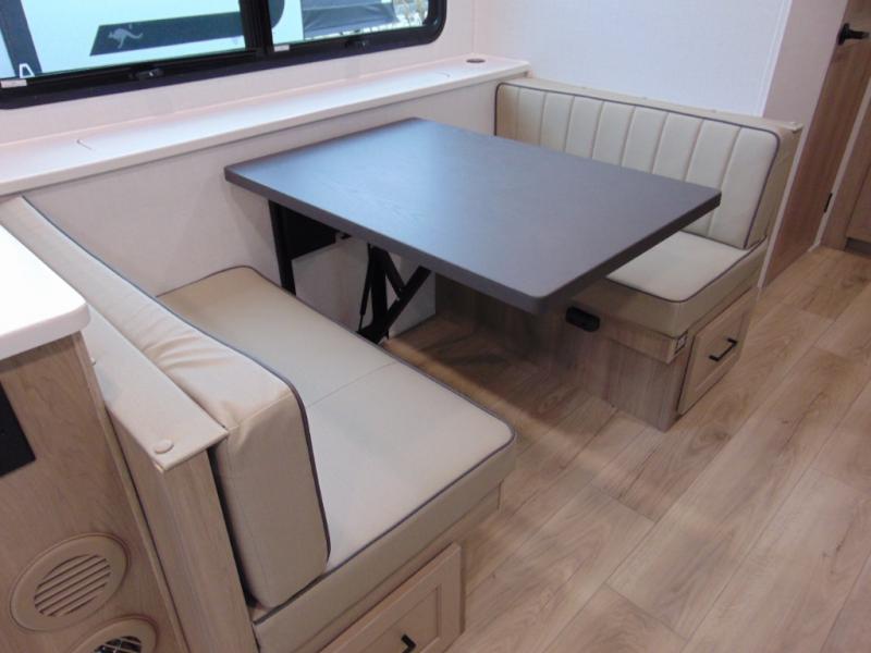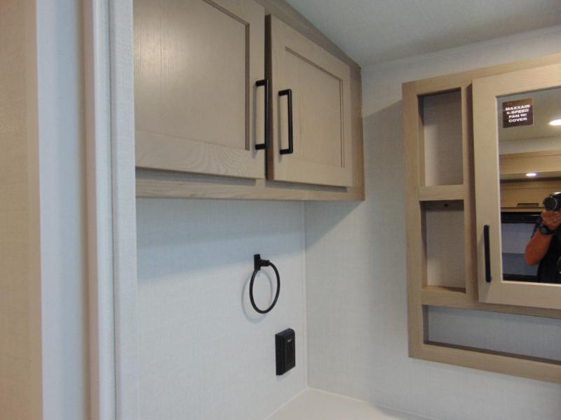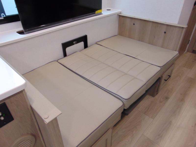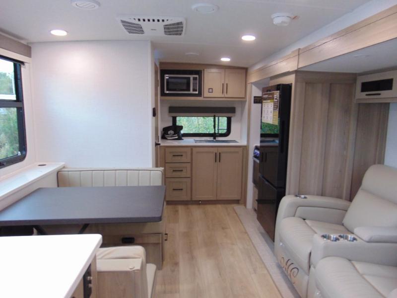 This stunning travel trailer is designed to provide the ultimate in comfort, convenience on the open road. The full bathroom is a haven for relaxation and refreshment, while the kitchen is equipped with a microwave, overhead cabinets, a three-burner cooktop, and a 12V refrigerator, making meal prep and dining the easiest task. The kitchen pantry provides ample storage for your favorite ingredients. Further, the booth dinette is a cozy spot for meals or socializing, and the theater seating is perfect for relaxing and enjoying your favorite shows or movies on the 12V Smart TV. Plus, the front bedroom is a serene retreat, featuring a spacious queen bed and convenient wardrobe, providing the perfect spot to rest and recharge after a day of adventure.