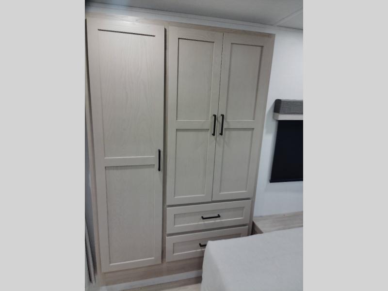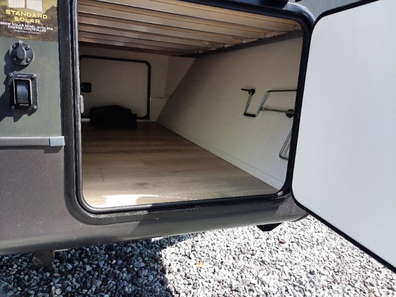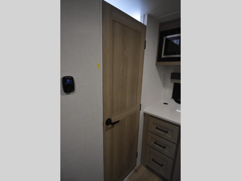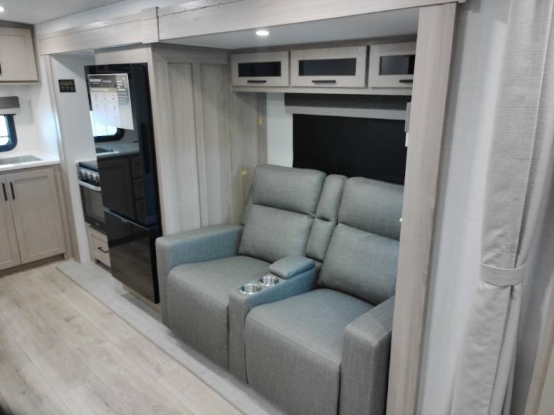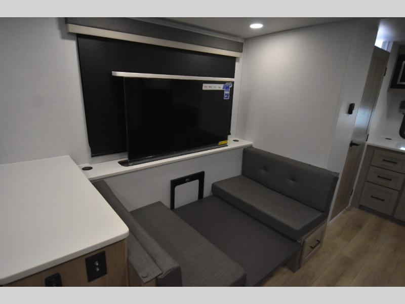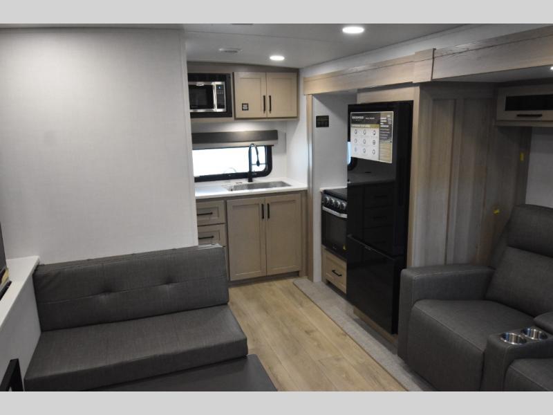 This stunning travel trailer is designed to provide the ultimate in comfort, convenience on the open road. The full bathroom is a haven for relaxation and refreshment, while the kitchen is equipped with a microwave, overhead cabinets, a three-burner cooktop, and a 12V refrigerator, making meal prep and dining the easiest task. The kitchen pantry provides ample storage for your favorite ingredients. Further, the booth dinette is a cozy spot for meals or socializing, and the theater seating is perfect for relaxing and enjoying your favorite shows or movies on the 12V Smart TV. Plus, the front bedroom is a serene retreat, featuring a spacious queen bed and convenient wardrobe, providing the perfect spot to rest and recharge after a day of adventure.