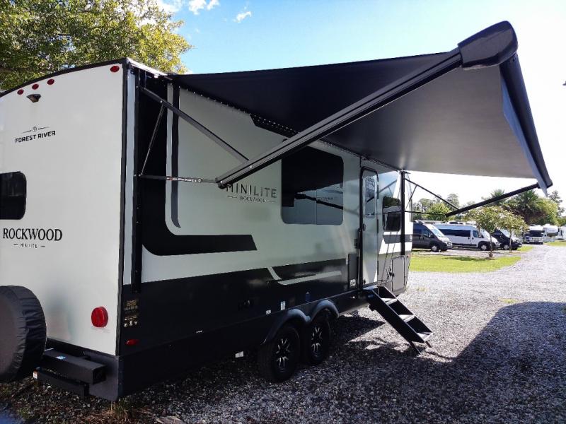 Each Rockwood Mini Lite travel trailer by Forest River is constructed with a fully laminated one-piece walkable roof, sleek frameless windows, and a six-sided full aluminum frame for strength and durability. The 12V thermostatically controlled heated tanks, plus radiant foil in the underbelly will allow you to camp well into the colder months, and the 200W roof solar panel will be perfect for a little off-gridding. Each model includes solid surface kitchen countertops, hidden hinge cabinet doors, roller shades, plus many more interior features. Having an AIR 360+ omnidirectional antenna with WiFi prep on board gives you the option to get some work done if it's needed, and the power tongue jack provides hassle-free set up, so you can enjoy more time relaxing!