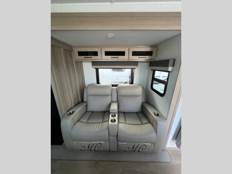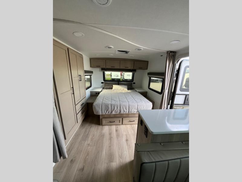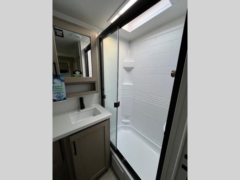 This stunning travel trailer is designed to provide the ultimate in comfort, convenience on the open road. The full bathroom is a haven for relaxation and refreshment, while the kitchen is equipped with a microwave, overhead cabinets, a three-burner cooktop, and a 12V refrigerator, making meal prep and dining the easiest task. The kitchen pantry provides ample storage for your favorite ingredients. Further, the booth dinette is a cozy spot for meals or socializing, and the theater seating is perfect for relaxing and enjoying your favorite shows or movies on the 12V Smart TV. Plus, the front bedroom is a serene retreat, featuring a spacious queen bed and convenient wardrobe, providing the perfect spot to rest and recharge after a day of adventure.