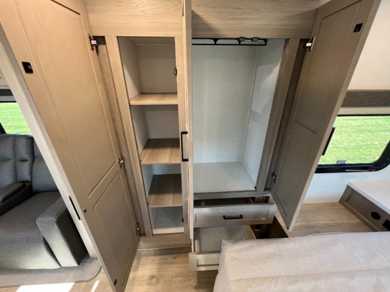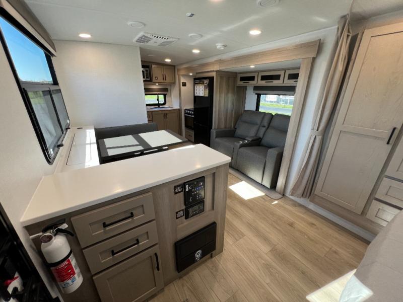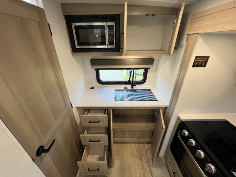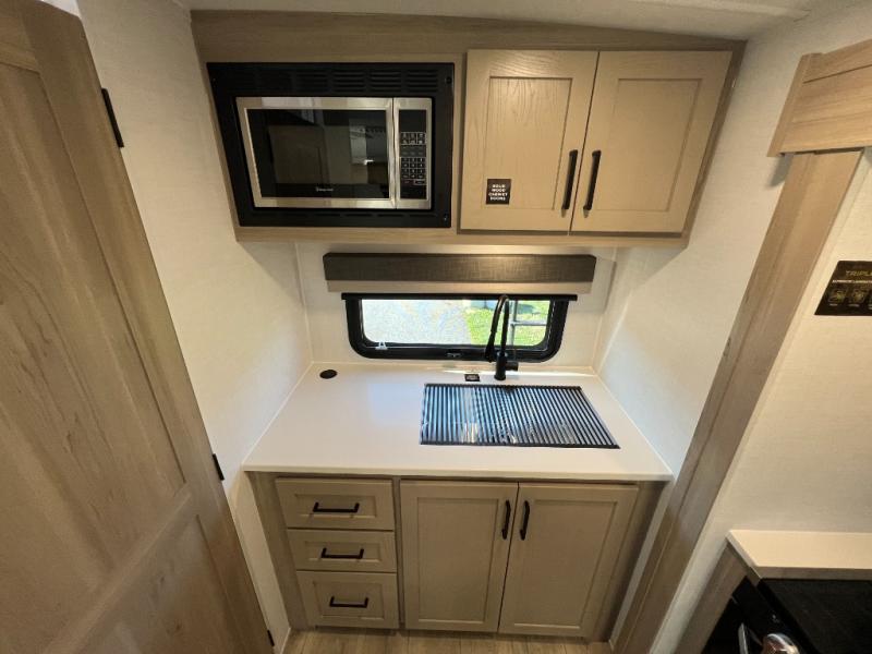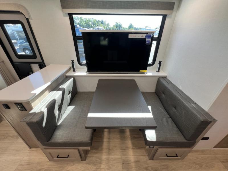 This stunning travel trailer is designed to provide the ultimate in comfort, convenience on the open road. The full bathroom is a haven for relaxation and refreshment, while the kitchen is equipped with a microwave, overhead cabinets, a three-burner cooktop, and a 12V refrigerator, making meal prep and dining the easiest task. The kitchen pantry provides ample storage for your favorite ingredients. Further, the booth dinette is a cozy spot for meals or socializing, and the theater seating is perfect for relaxing and enjoying your favorite shows or movies on the 12V Smart TV. Plus, the front bedroom is a serene retreat, featuring a spacious queen bed and convenient wardrobe, providing the perfect spot to rest and recharge after a day of adventure.