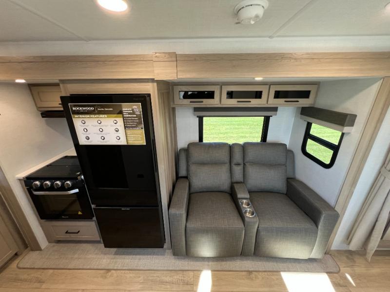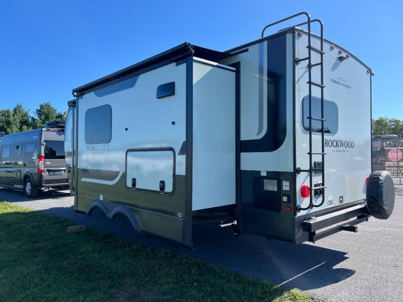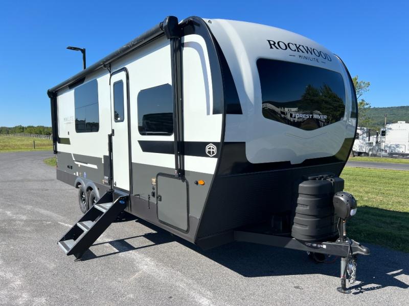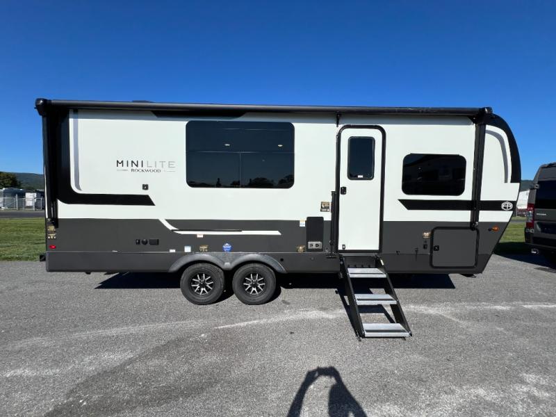 Each Rockwood Mini Lite travel trailer by Forest River is constructed with a fully laminated one-piece walkable roof, sleek frameless windows, and a six-sided full aluminum frame for strength and durability. The 12V thermostatically controlled heated tanks, plus radiant foil in the underbelly will allow you to camp well into the colder months, and the 200W roof solar panel will be perfect for a little off-gridding. Each model includes solid surface kitchen countertops, hidden hinge cabinet doors, roller shades, plus many more interior features. Having an AIR 360+ omnidirectional antenna with WiFi prep on board gives you the option to get some work done if it's needed, and the power tongue jack provides hassle-free set up, so you can enjoy more time relaxing!