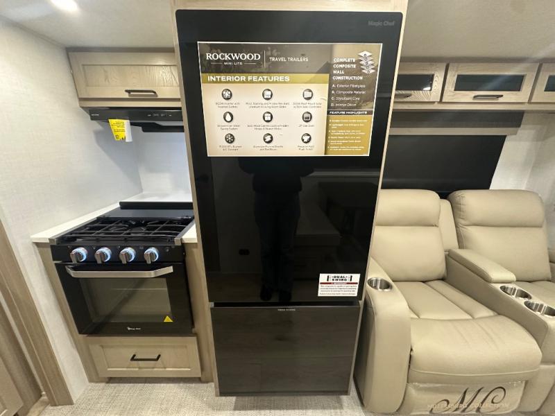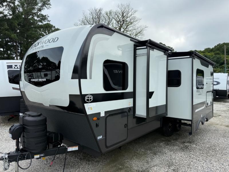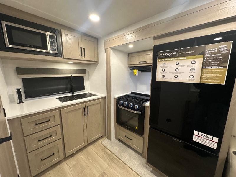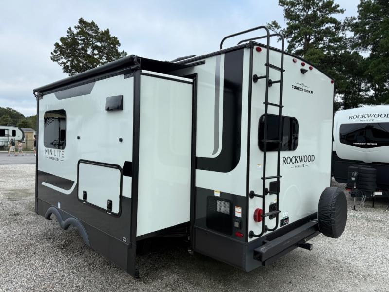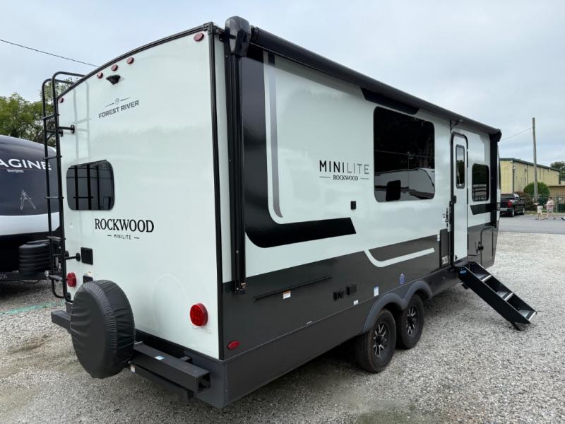 Each Rockwood Mini Lite travel trailer by Forest River is constructed with a fully laminated one-piece walkable roof, sleek frameless windows, and a six-sided full aluminum frame for strength and durability. The 12V thermostatically controlled heated tanks, plus radiant foil in the underbelly will allow you to camp well into the colder months, and the 200W roof solar panel will be perfect for a little off-gridding. Each model includes solid surface kitchen countertops, hidden hinge cabinet doors, roller shades, plus many more interior features. Having an AIR 360+ omnidirectional antenna with WiFi prep on board gives you the option to get some work done if it's needed, and the power tongue jack provides hassle-free set up, so you can enjoy more time relaxing!