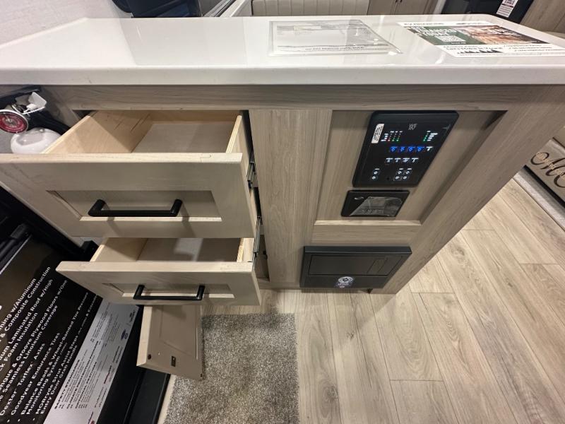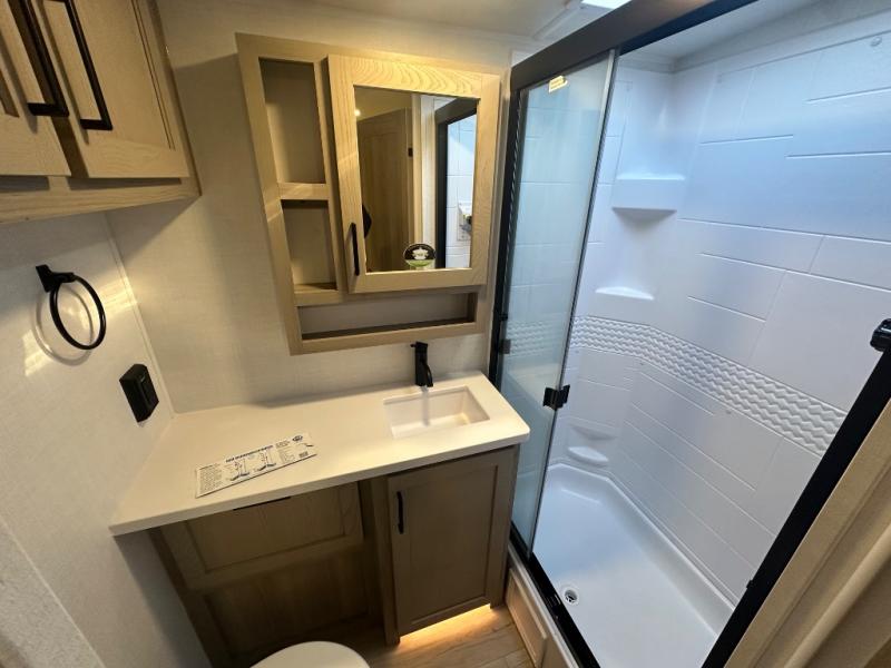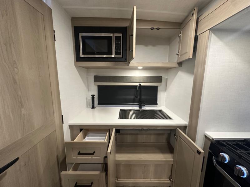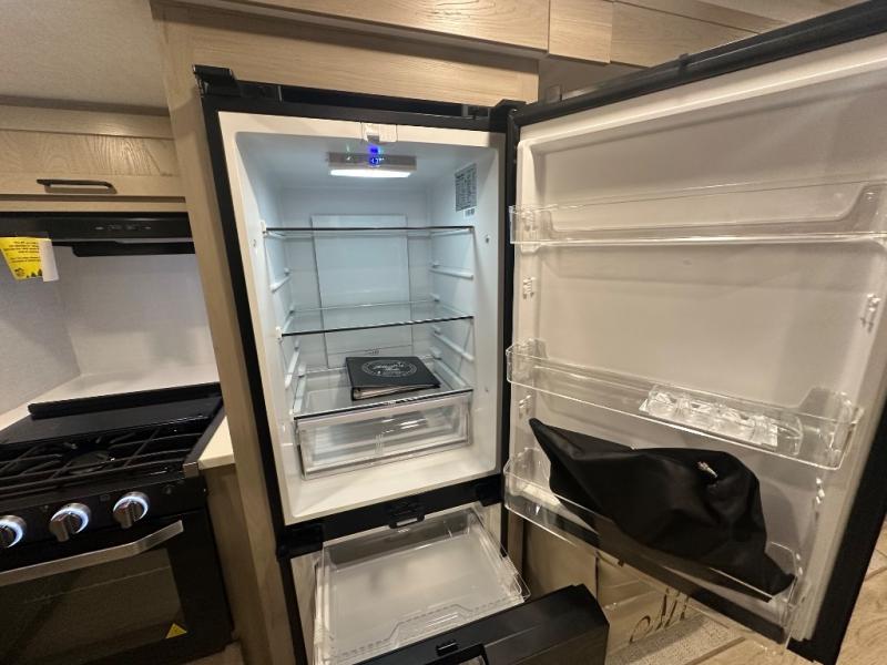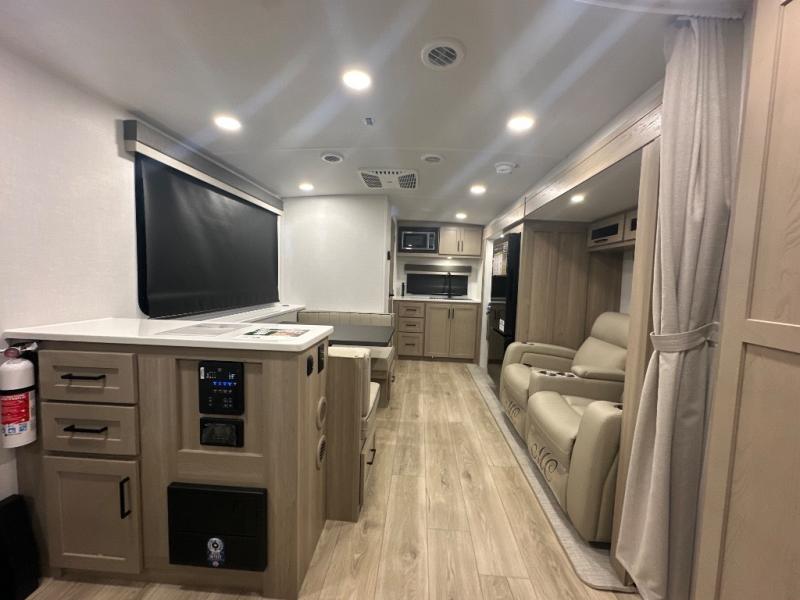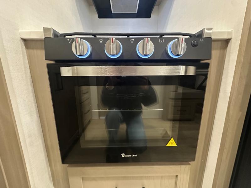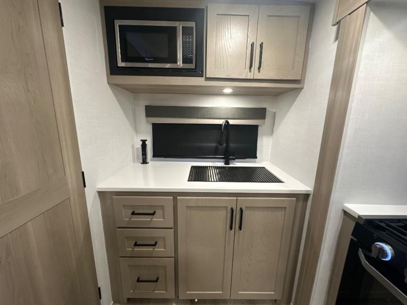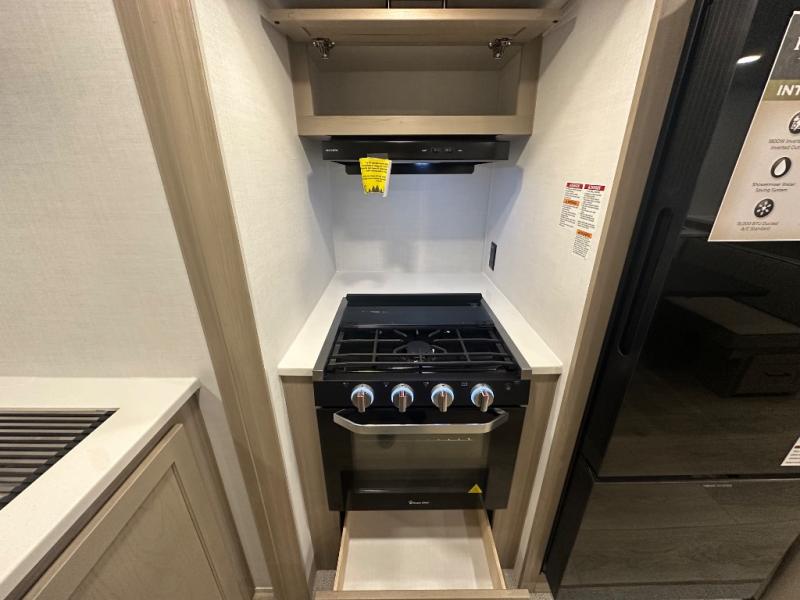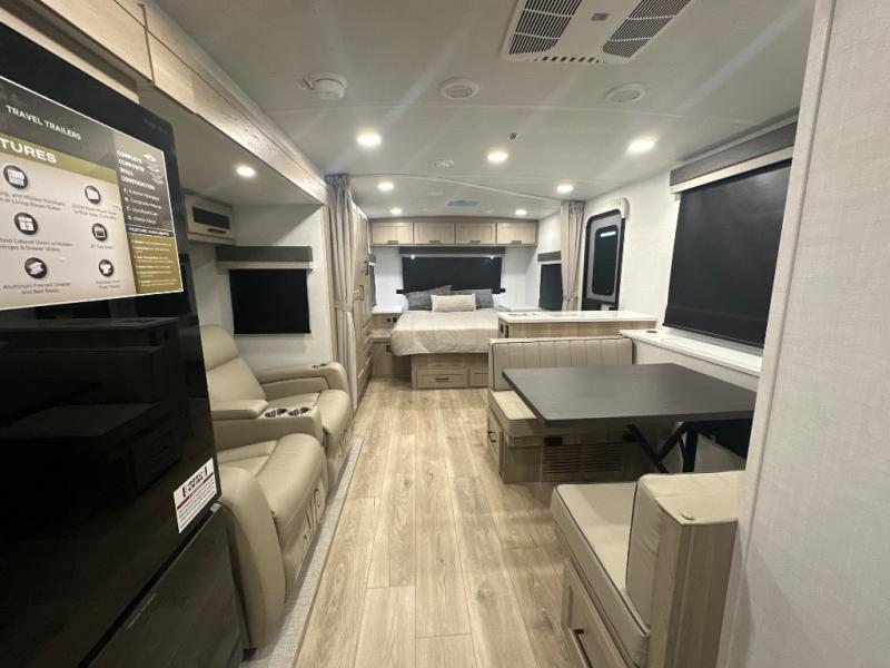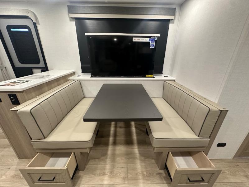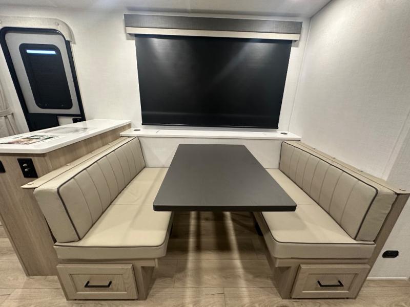 This stunning travel trailer is designed to provide the ultimate in comfort, convenience on the open road. The full bathroom is a haven for relaxation and refreshment, while the kitchen is equipped with a microwave, overhead cabinets, a three-burner cooktop, and a 12V refrigerator, making meal prep and dining the easiest task. The kitchen pantry provides ample storage for your favorite ingredients. Further, the booth dinette is a cozy spot for meals or socializing, and the theater seating is perfect for relaxing and enjoying your favorite shows or movies on the 12V Smart TV. Plus, the front bedroom is a serene retreat, featuring a spacious queen bed and convenient wardrobe, providing the perfect spot to rest and recharge after a day of adventure.