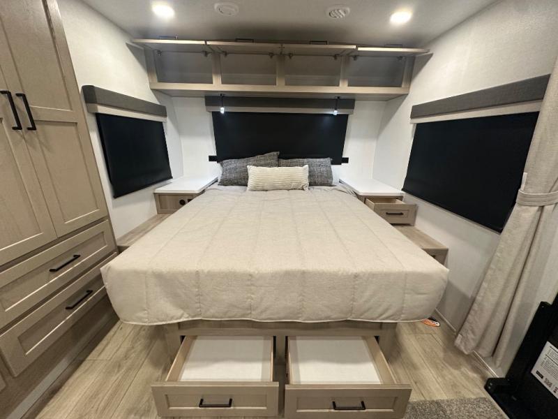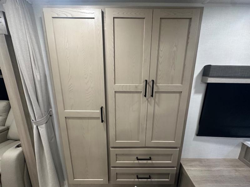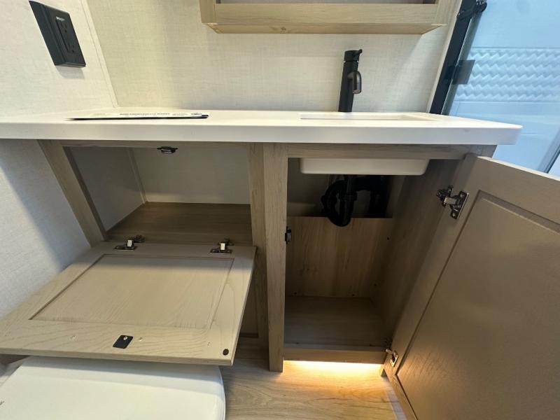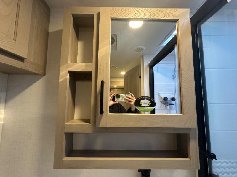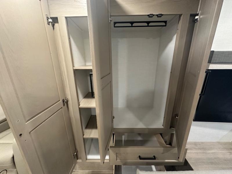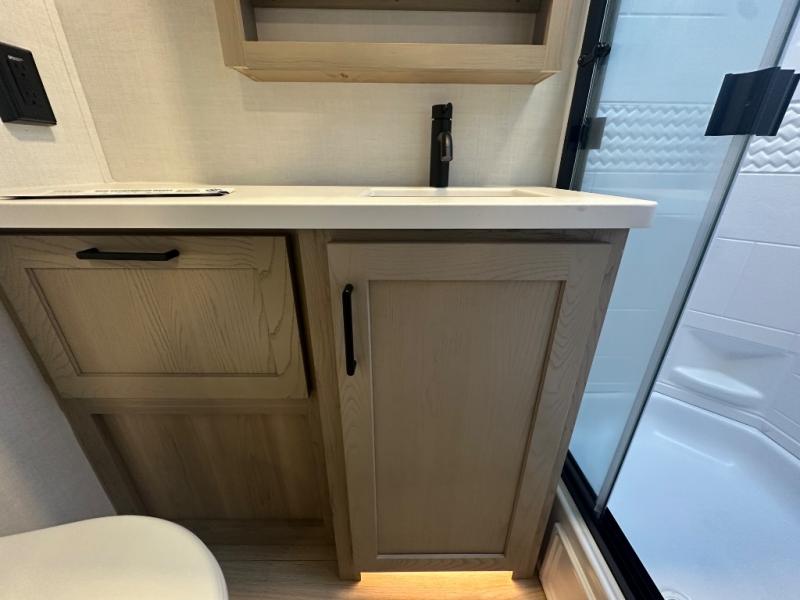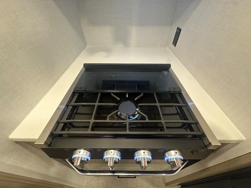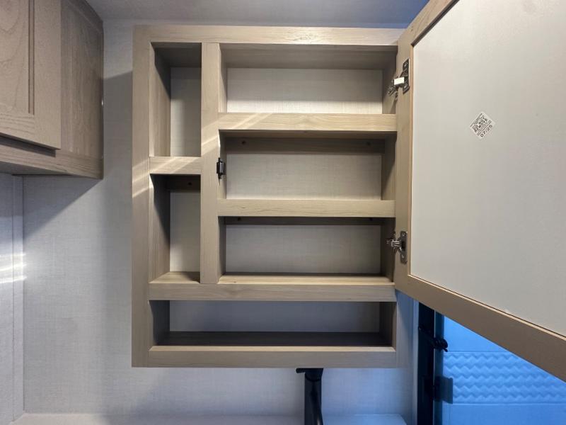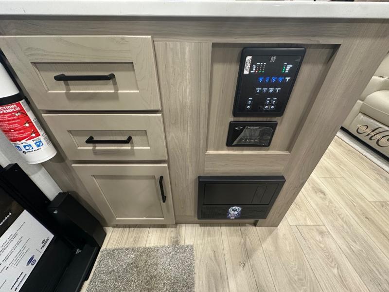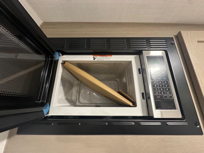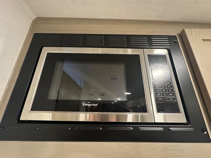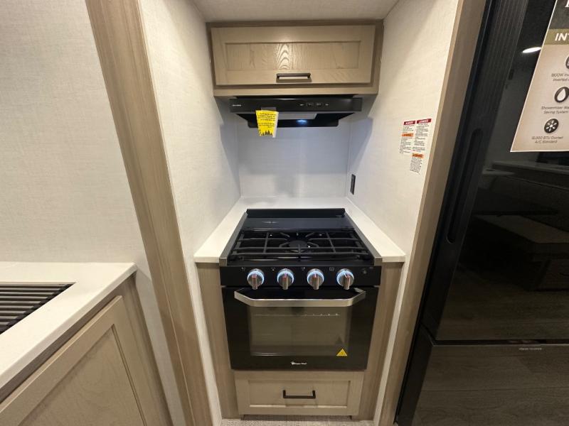 This stunning travel trailer is designed to provide the ultimate in comfort, convenience on the open road. The full bathroom is a haven for relaxation and refreshment, while the kitchen is equipped with a microwave, overhead cabinets, a three-burner cooktop, and a 12V refrigerator, making meal prep and dining the easiest task. The kitchen pantry provides ample storage for your favorite ingredients. Further, the booth dinette is a cozy spot for meals or socializing, and the theater seating is perfect for relaxing and enjoying your favorite shows or movies on the 12V Smart TV. Plus, the front bedroom is a serene retreat, featuring a spacious queen bed and convenient wardrobe, providing the perfect spot to rest and recharge after a day of adventure.