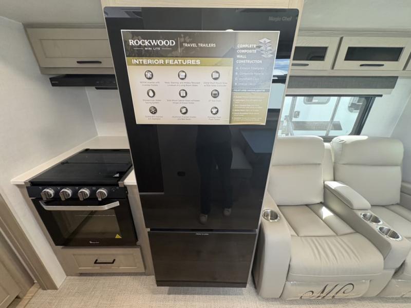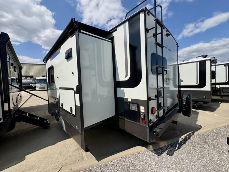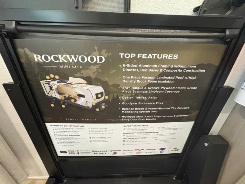 Each Rockwood Mini Lite travel trailer by Forest River is constructed with a fully laminated one-piece walkable roof, sleek frameless windows, and a six-sided full aluminum frame for strength and durability. The 12V thermostatically controlled heated tanks, plus radiant foil in the underbelly will allow you to camp well into the colder months, and the 200W roof solar panel will be perfect for a little off-gridding. Each model includes solid surface kitchen countertops, hidden hinge cabinet doors, roller shades, plus many more interior features. Having an AIR 360+ omnidirectional antenna with WiFi prep on board gives you the option to get some work done if it's needed, and the power tongue jack provides hassle-free set up, so you can enjoy more time relaxing!