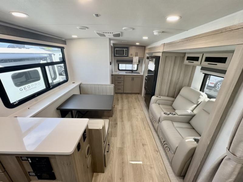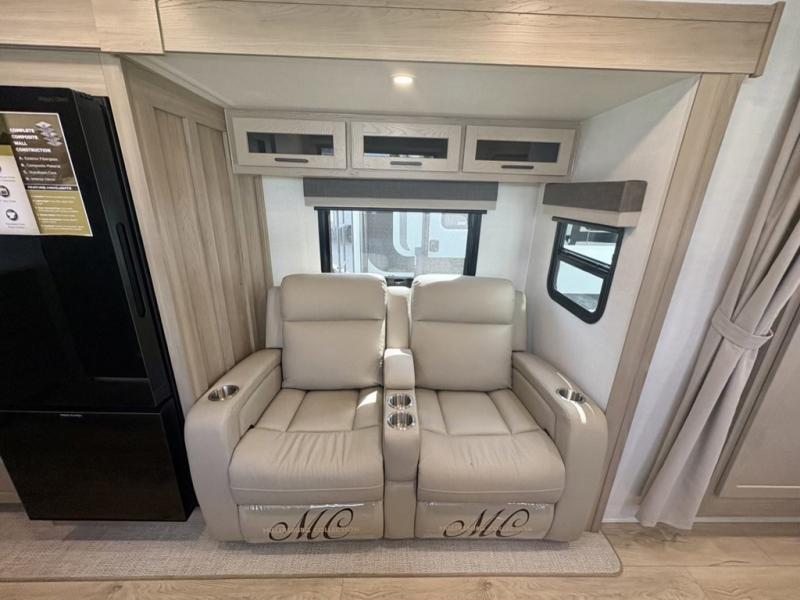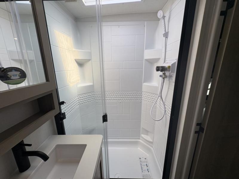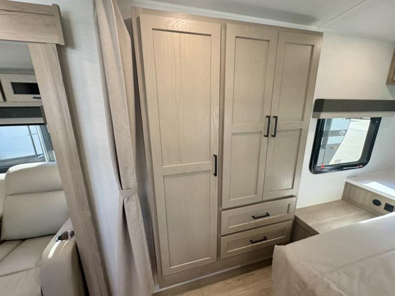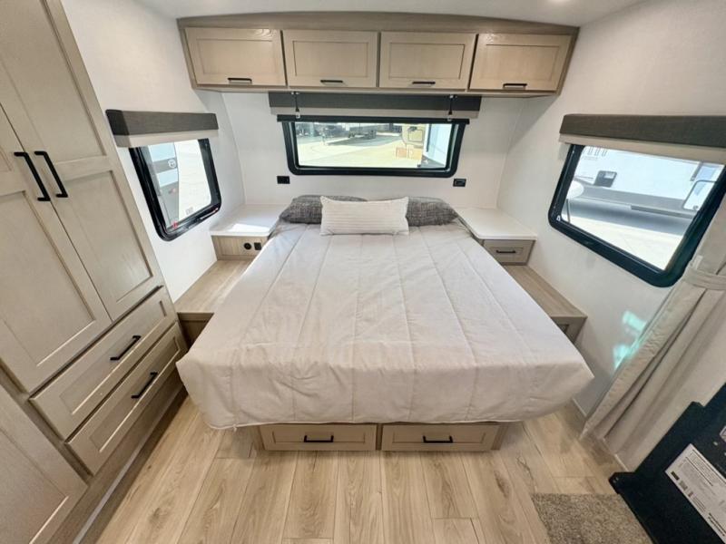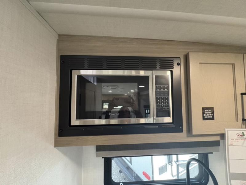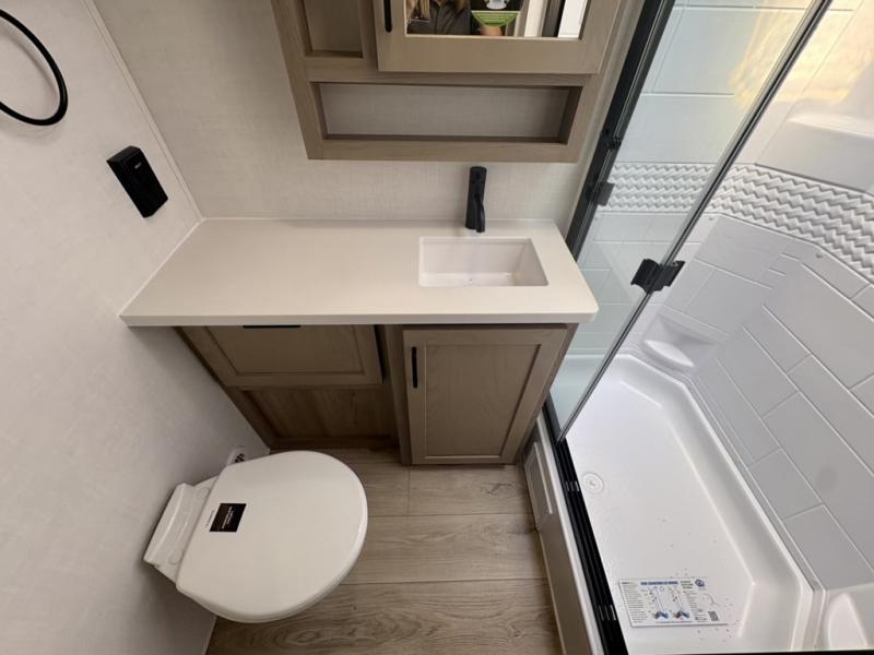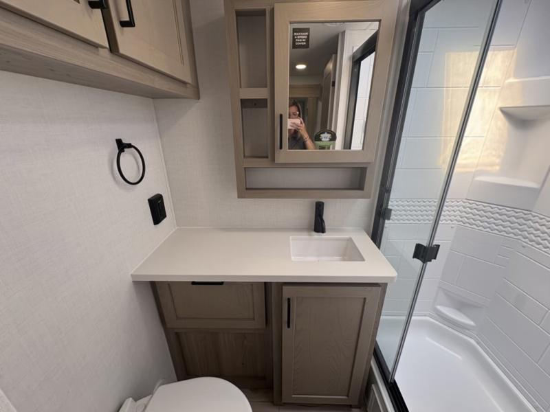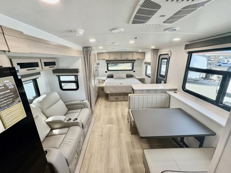 This stunning travel trailer is designed to provide the ultimate in comfort, convenience on the open road. The full bathroom is a haven for relaxation and refreshment, while the kitchen is equipped with a microwave, overhead cabinets, a three-burner cooktop, and a 12V refrigerator, making meal prep and dining the easiest task. The kitchen pantry provides ample storage for your favorite ingredients. Further, the booth dinette is a cozy spot for meals or socializing, and the theater seating is perfect for relaxing and enjoying your favorite shows or movies on the 12V Smart TV. Plus, the front bedroom is a serene retreat, featuring a spacious queen bed and convenient wardrobe, providing the perfect spot to rest and recharge after a day of adventure.
