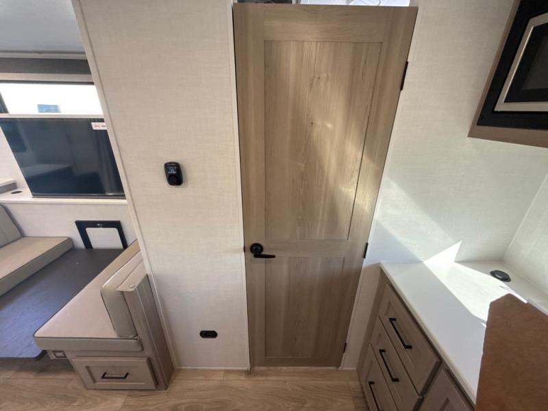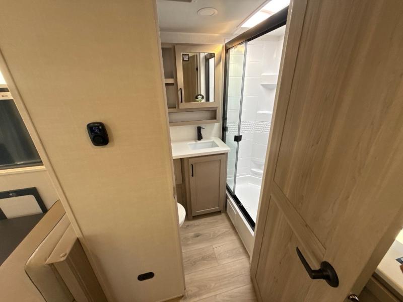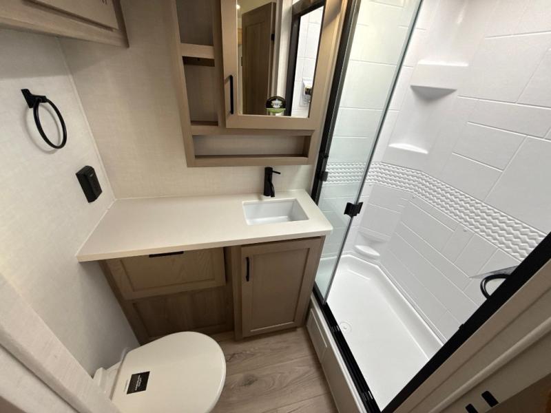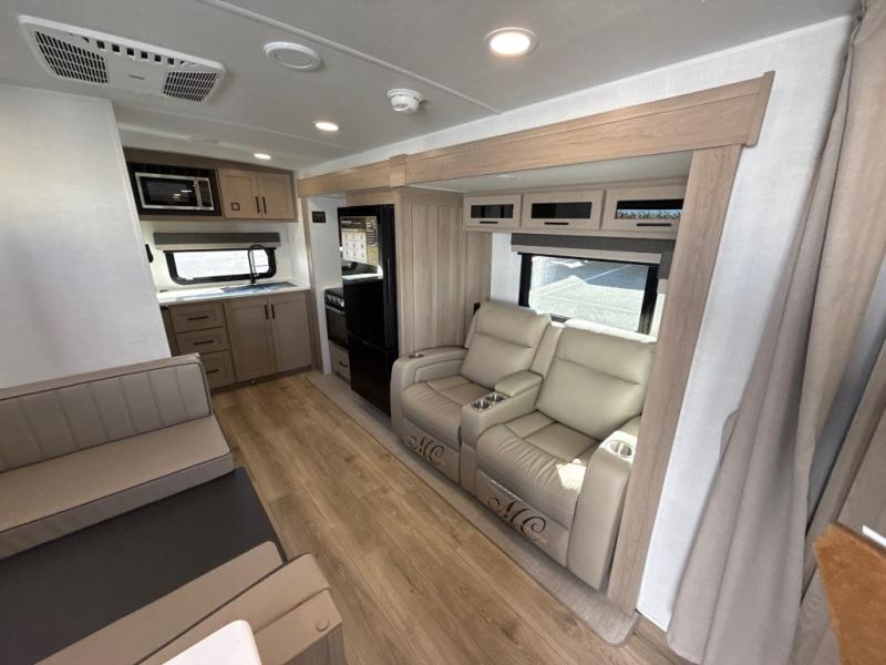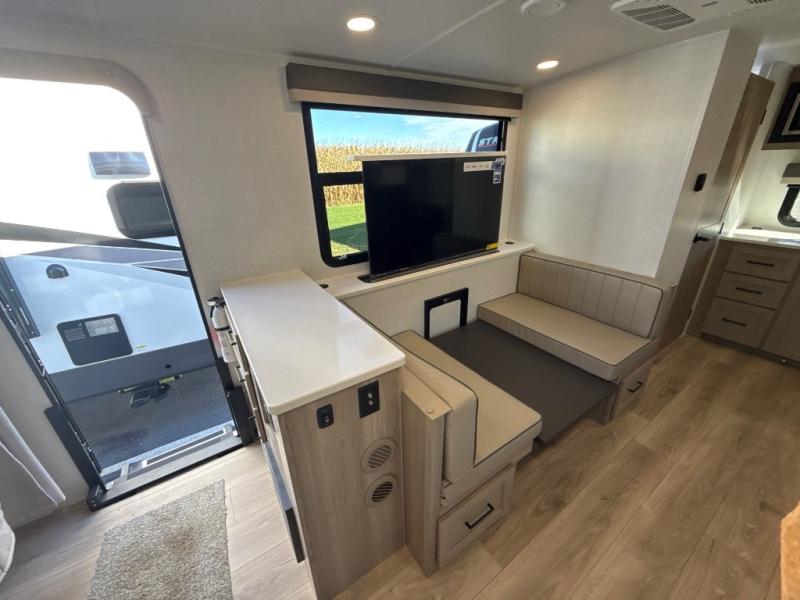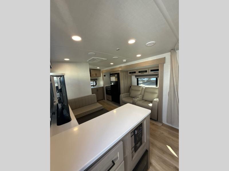 This stunning travel trailer is designed to provide the ultimate in comfort, convenience on the open road. The full bathroom is a haven for relaxation and refreshment, while the kitchen is equipped with a microwave, overhead cabinets, a three-burner cooktop, and a 12V refrigerator, making meal prep and dining the easiest task. The kitchen pantry provides ample storage for your favorite ingredients. Further, the booth dinette is a cozy spot for meals or socializing, and the theater seating is perfect for relaxing and enjoying your favorite shows or movies on the 12V Smart TV. Plus, the front bedroom is a serene retreat, featuring a spacious queen bed and convenient wardrobe, providing the perfect spot to rest and recharge after a day of adventure.