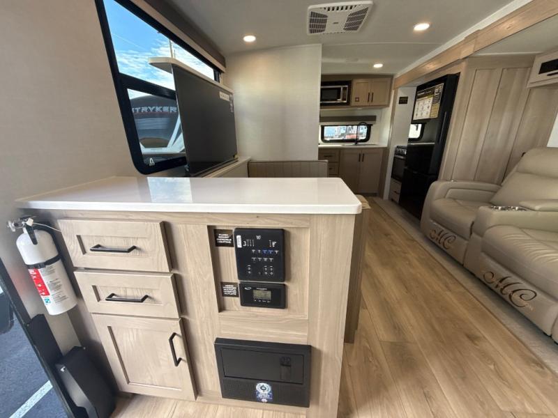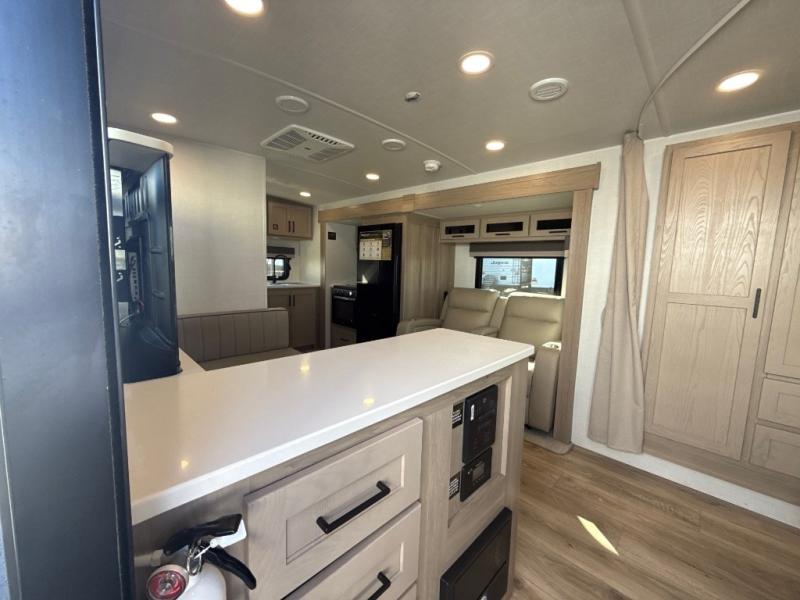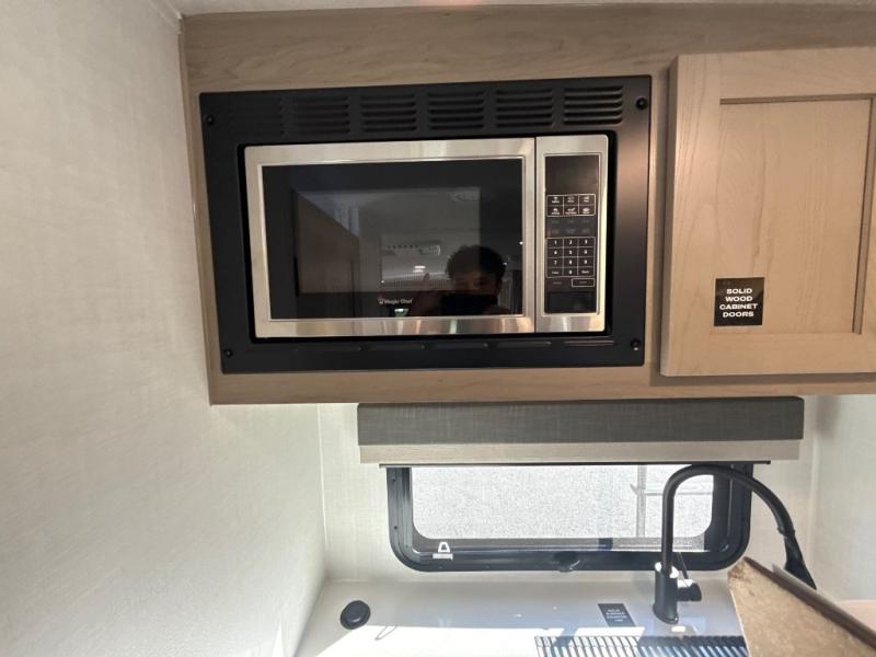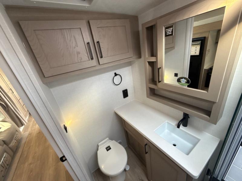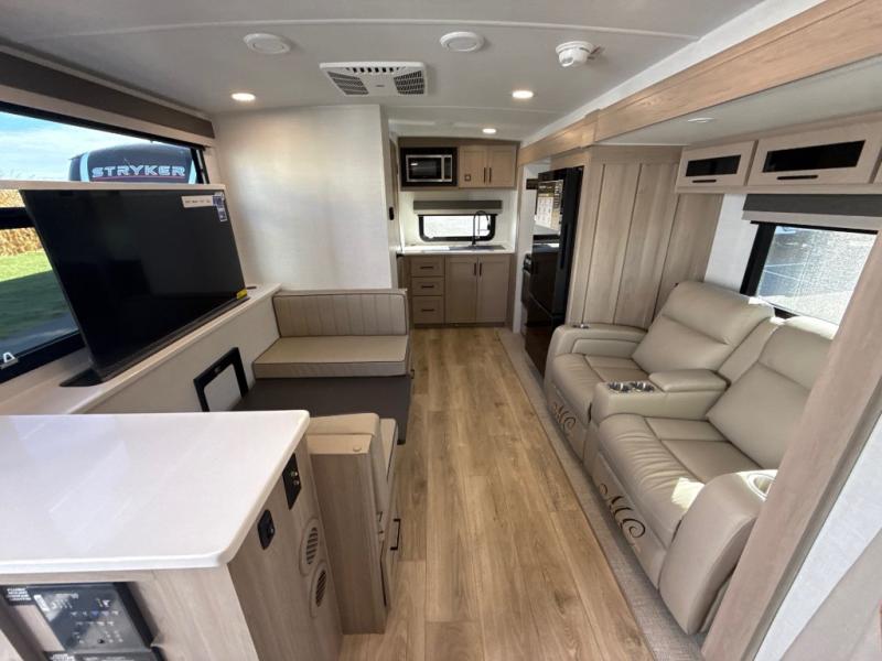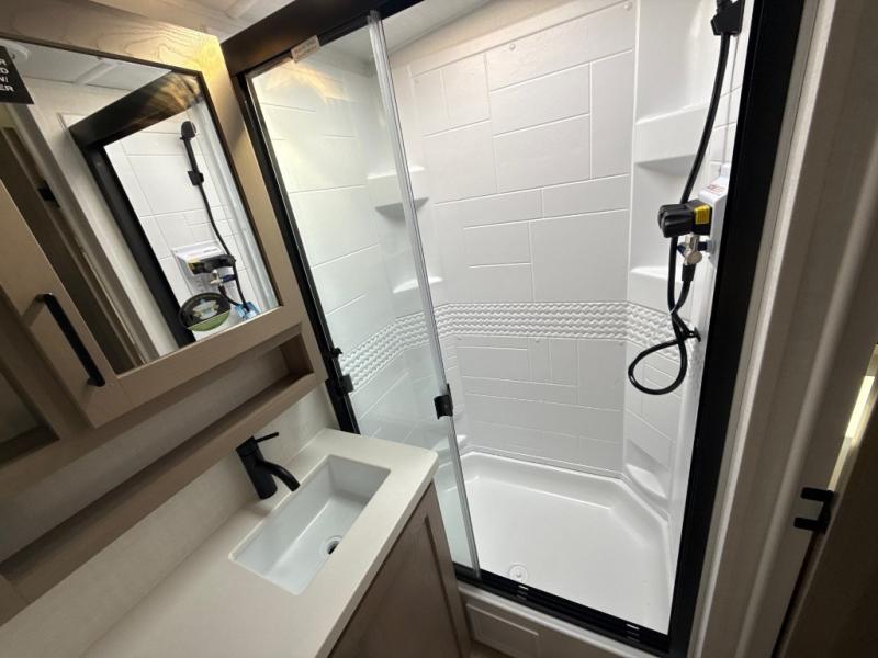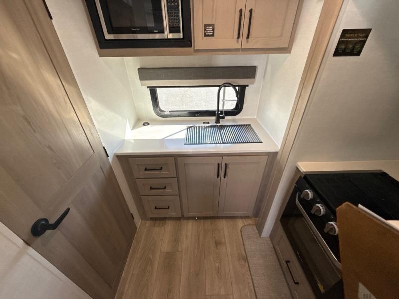 This stunning travel trailer is designed to provide the ultimate in comfort, convenience on the open road. The full bathroom is a haven for relaxation and refreshment, while the kitchen is equipped with a microwave, overhead cabinets, a three-burner cooktop, and a 12V refrigerator, making meal prep and dining the easiest task. The kitchen pantry provides ample storage for your favorite ingredients. Further, the booth dinette is a cozy spot for meals or socializing, and the theater seating is perfect for relaxing and enjoying your favorite shows or movies on the 12V Smart TV. Plus, the front bedroom is a serene retreat, featuring a spacious queen bed and convenient wardrobe, providing the perfect spot to rest and recharge after a day of adventure.