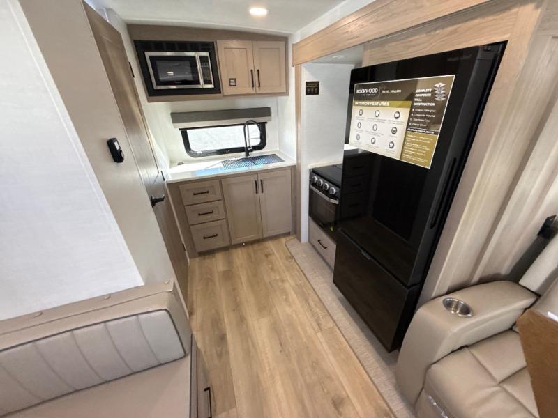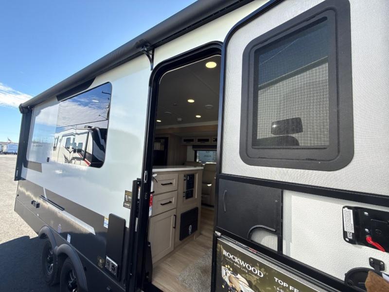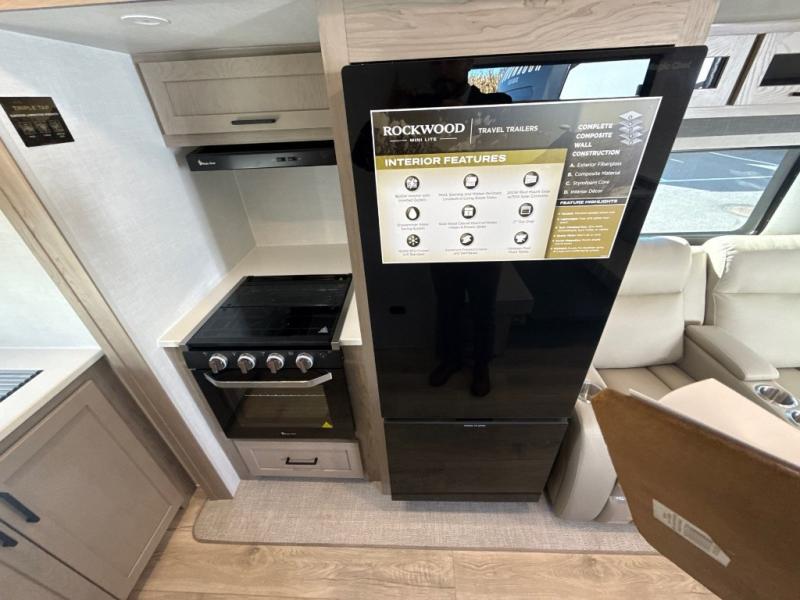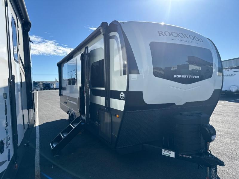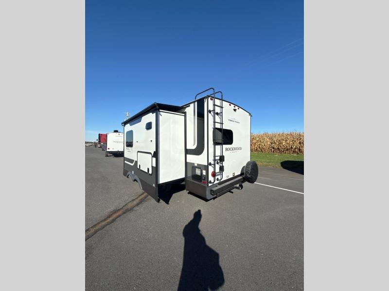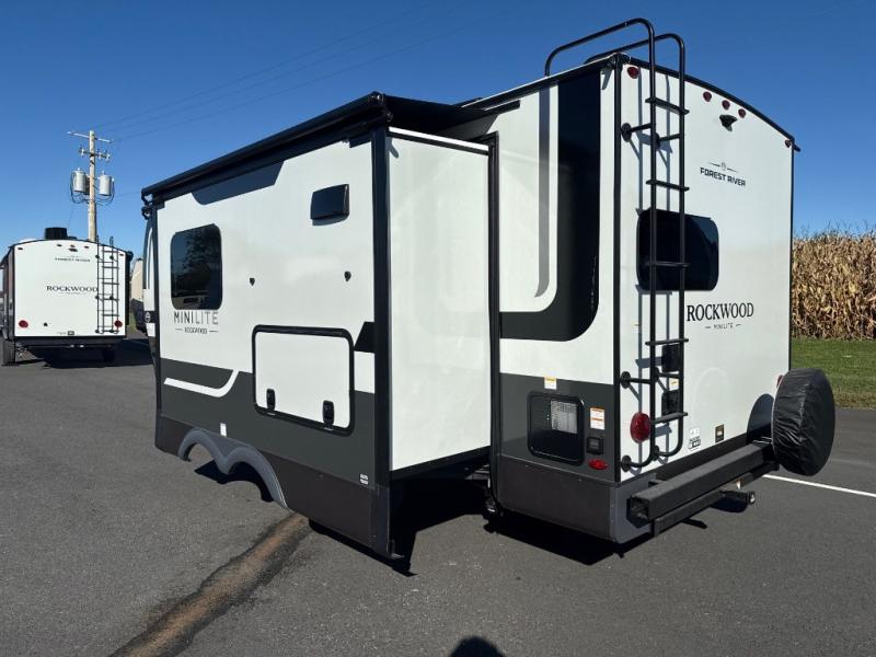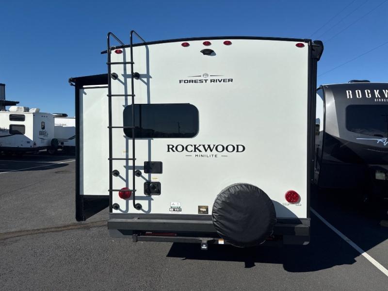 Each Rockwood Mini Lite travel trailer by Forest River is constructed with a fully laminated one-piece walkable roof, sleek frameless windows, and a six-sided full aluminum frame for strength and durability. The 12V thermostatically controlled heated tanks, plus radiant foil in the underbelly will allow you to camp well into the colder months, and the 200W roof solar panel will be perfect for a little off-gridding. Each model includes solid surface kitchen countertops, hidden hinge cabinet doors, roller shades, plus many more interior features. Having an AIR 360+ omnidirectional antenna with WiFi prep on board gives you the option to get some work done if it's needed, and the power tongue jack provides hassle-free set up, so you can enjoy more time relaxing!