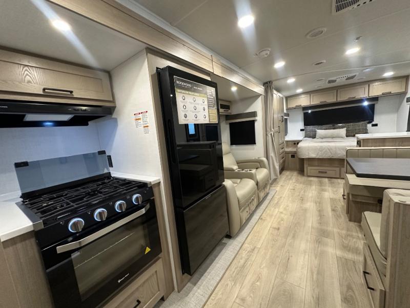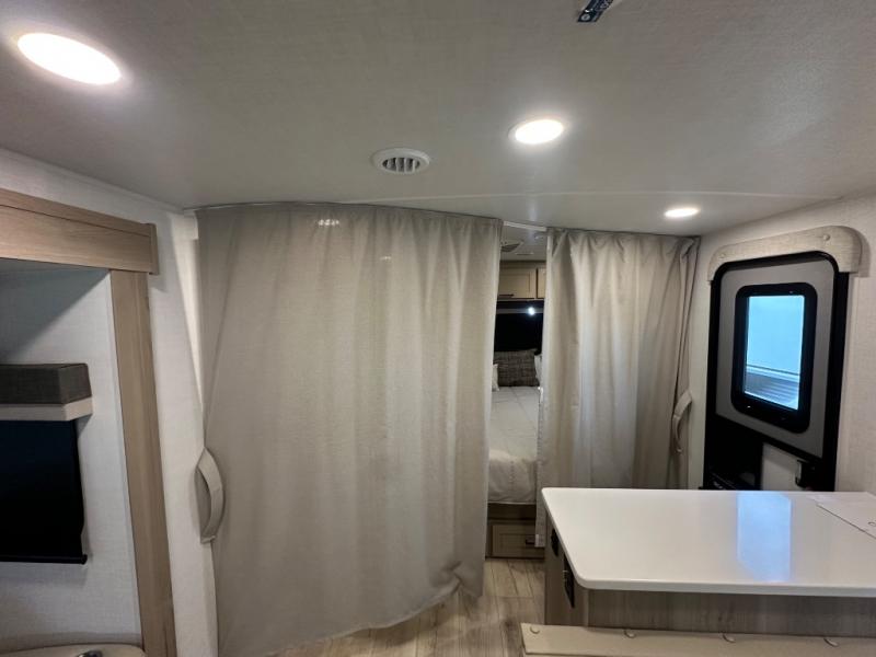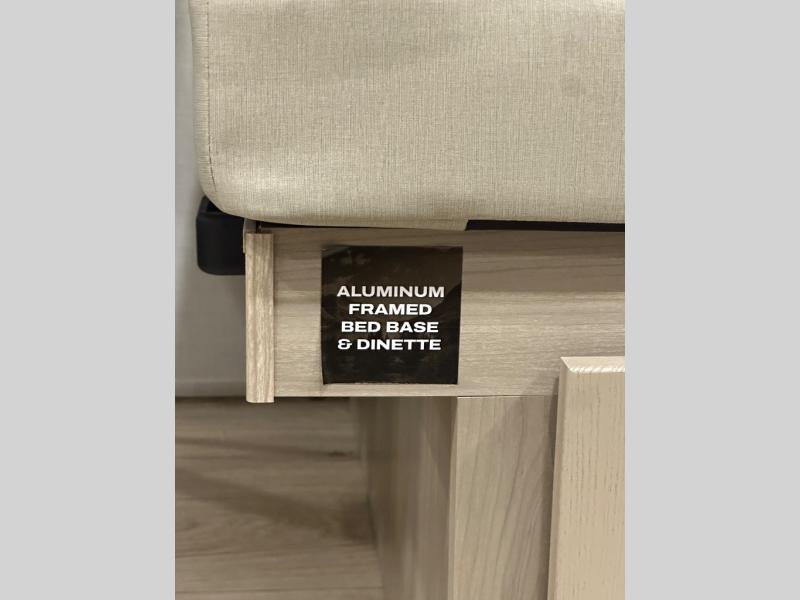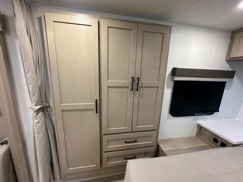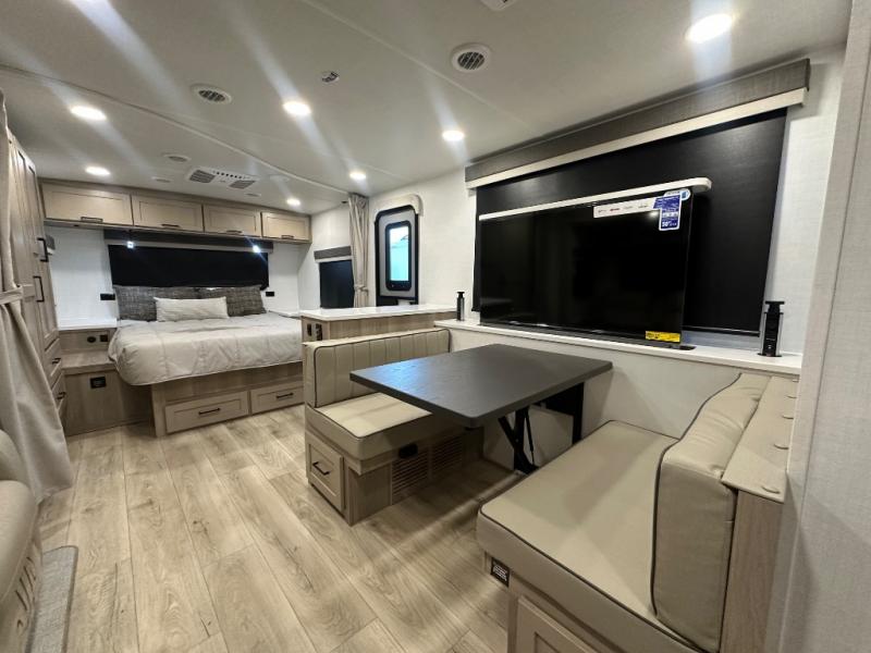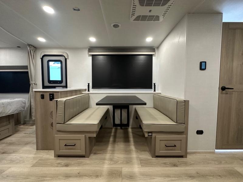 This stunning travel trailer is designed to provide the ultimate in comfort, convenience on the open road. The full bathroom is a haven for relaxation and refreshment, while the kitchen is equipped with a microwave, overhead cabinets, a three-burner cooktop, and a 12V refrigerator, making meal prep and dining the easiest task. The kitchen pantry provides ample storage for your favorite ingredients. Further, the booth dinette is a cozy spot for meals or socializing, and the theater seating is perfect for relaxing and enjoying your favorite shows or movies on the 12V Smart TV. Plus, the front bedroom is a serene retreat, featuring a spacious queen bed and convenient wardrobe, providing the perfect spot to rest and recharge after a day of adventure.