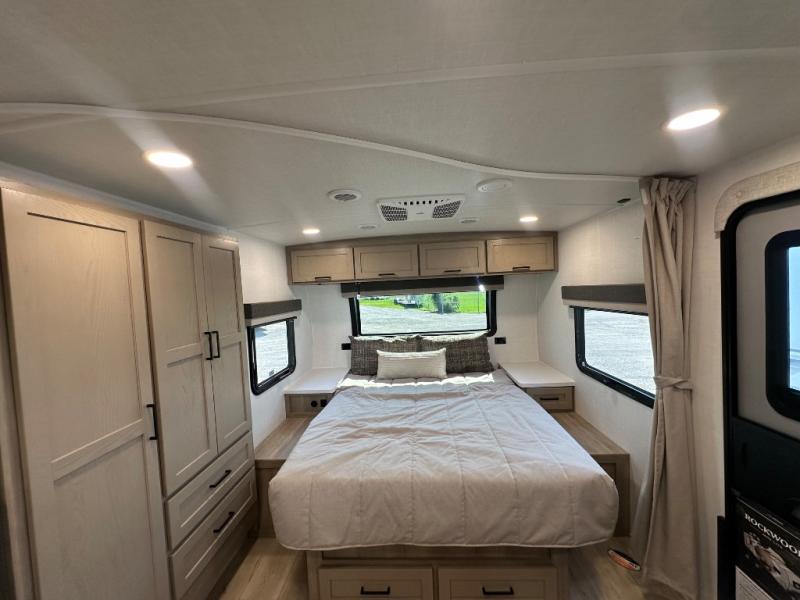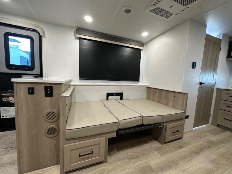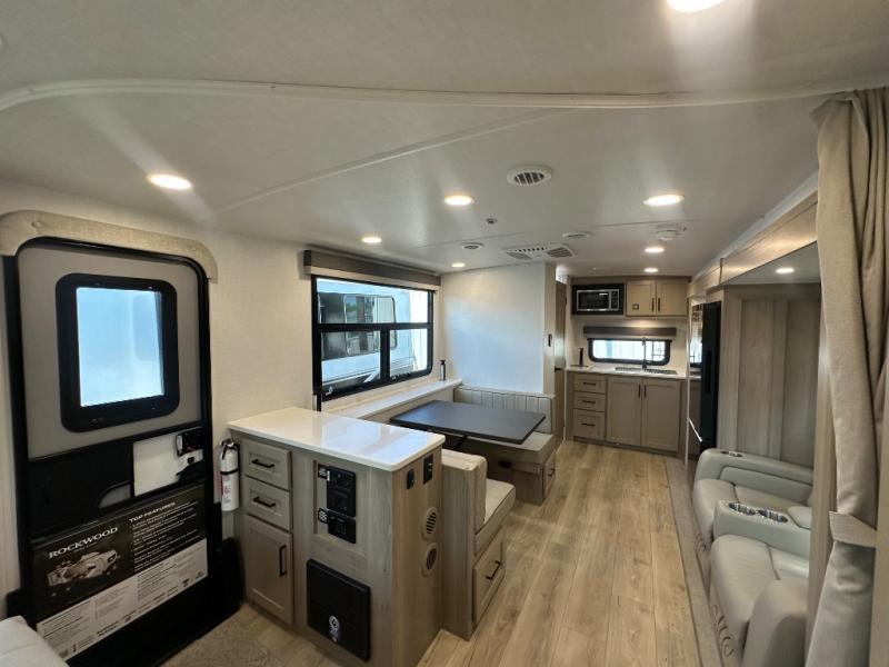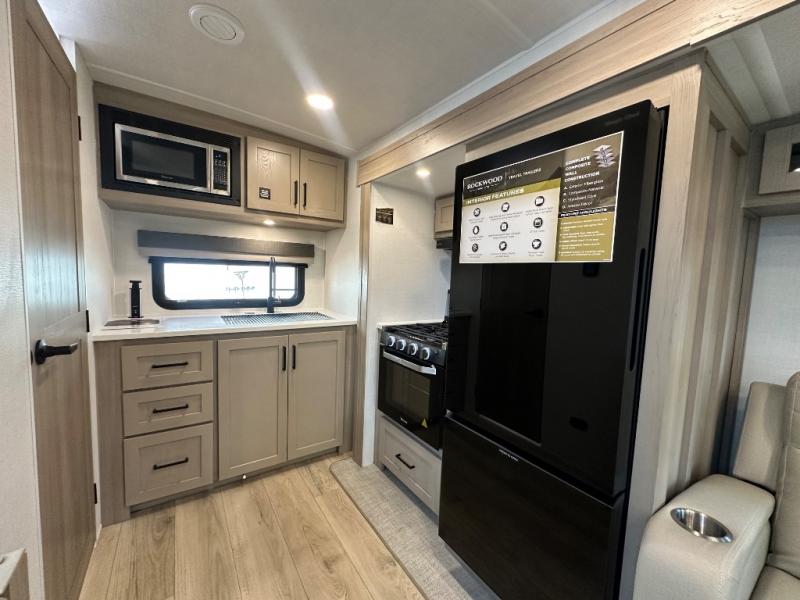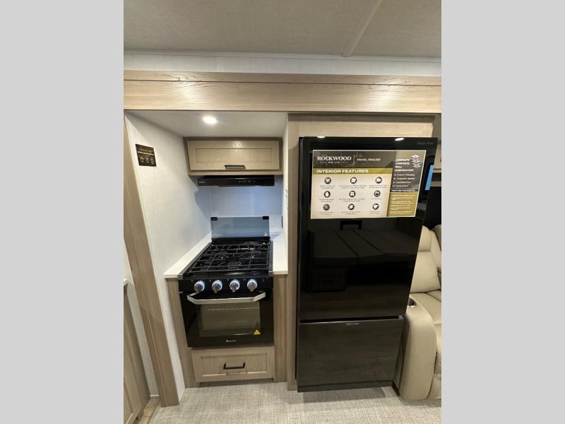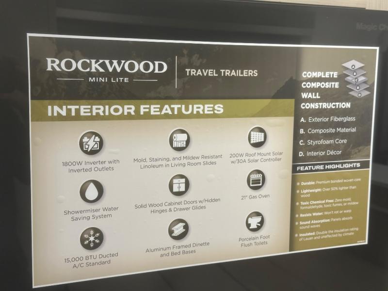 Each Rockwood Mini Lite travel trailer by Forest River is constructed with a fully laminated one-piece walkable roof, sleek frameless windows, and a six-sided full aluminum frame for strength and durability. The 12V thermostatically controlled heated tanks, plus radiant foil in the underbelly will allow you to camp well into the colder months, and the 200W roof solar panel will be perfect for a little off-gridding. Each model includes solid surface kitchen countertops, hidden hinge cabinet doors, roller shades, plus many more interior features. Having an AIR 360+ omnidirectional antenna with WiFi prep on board gives you the option to get some work done if it's needed, and the power tongue jack provides hassle-free set up, so you can enjoy more time relaxing!