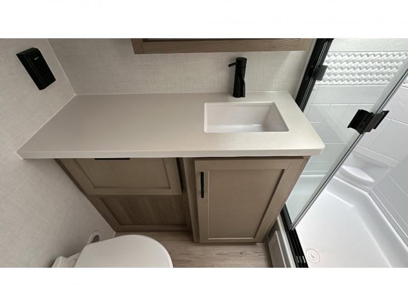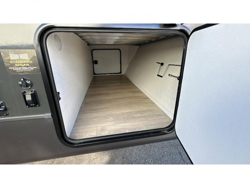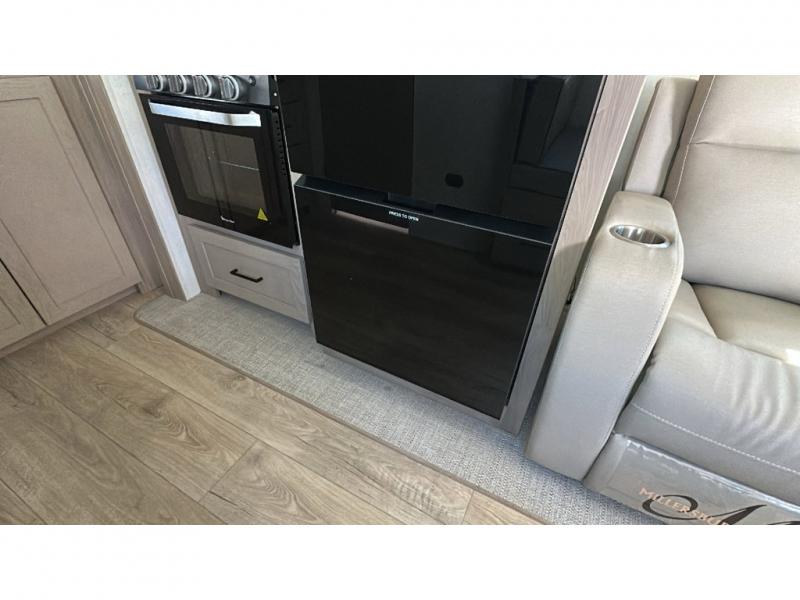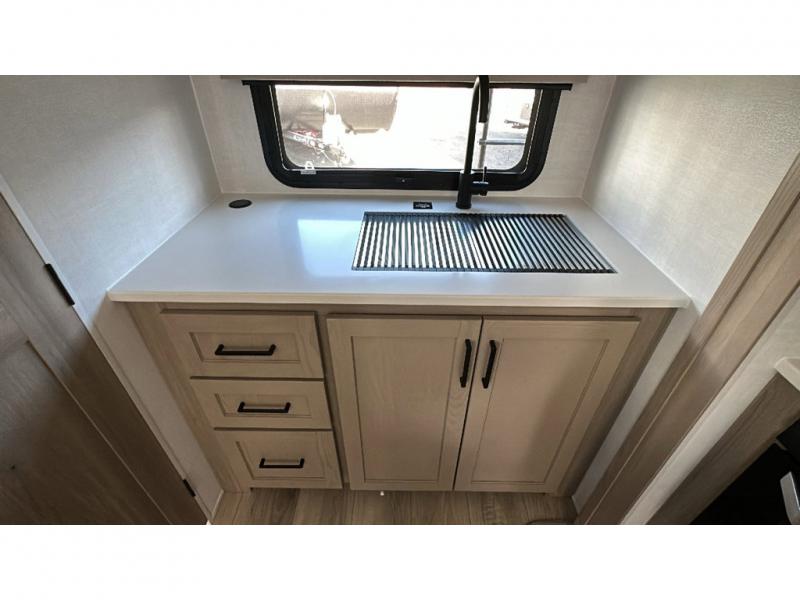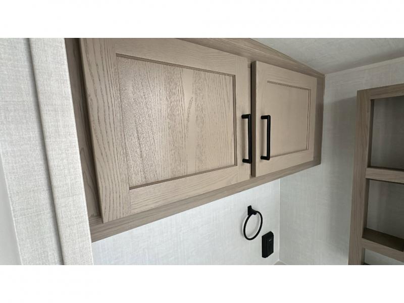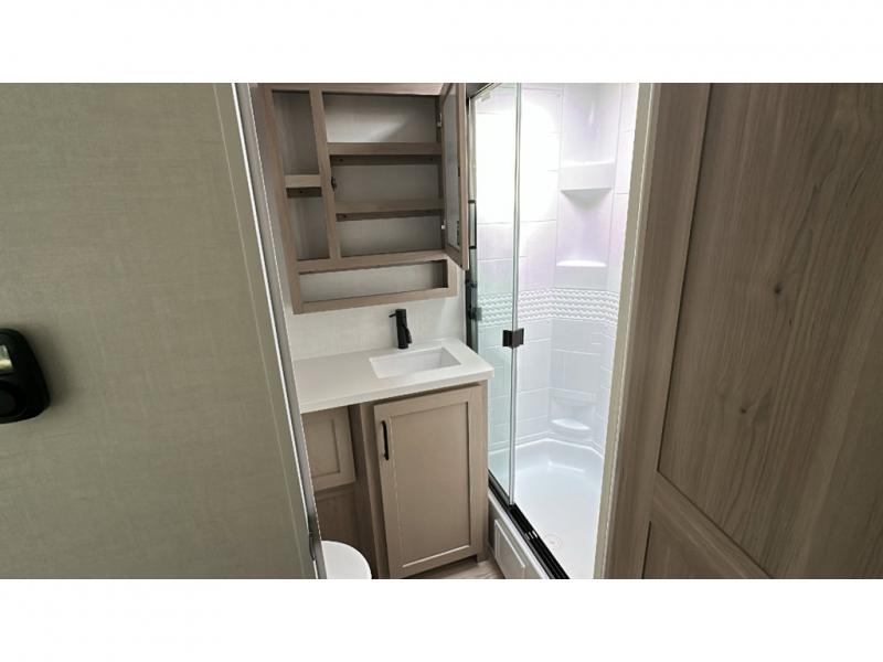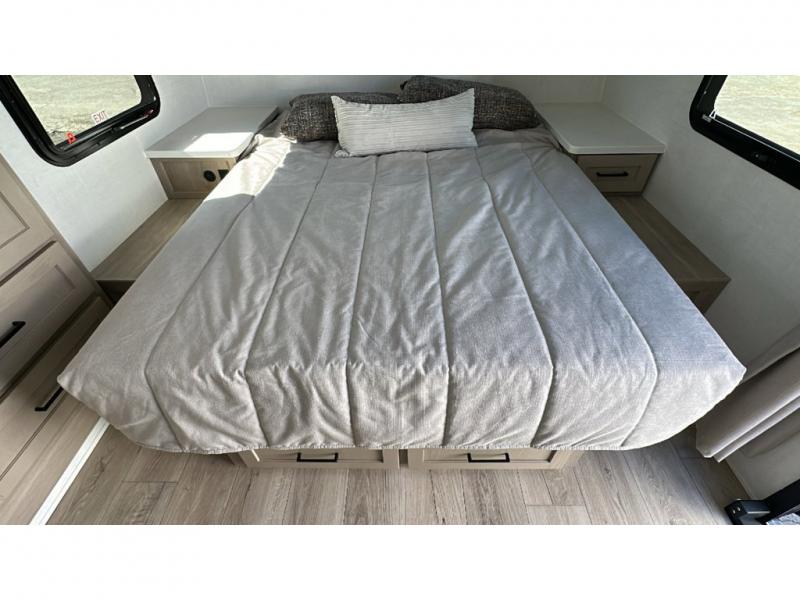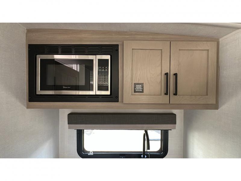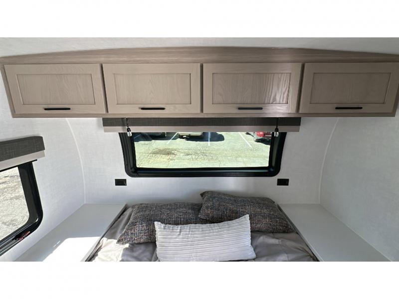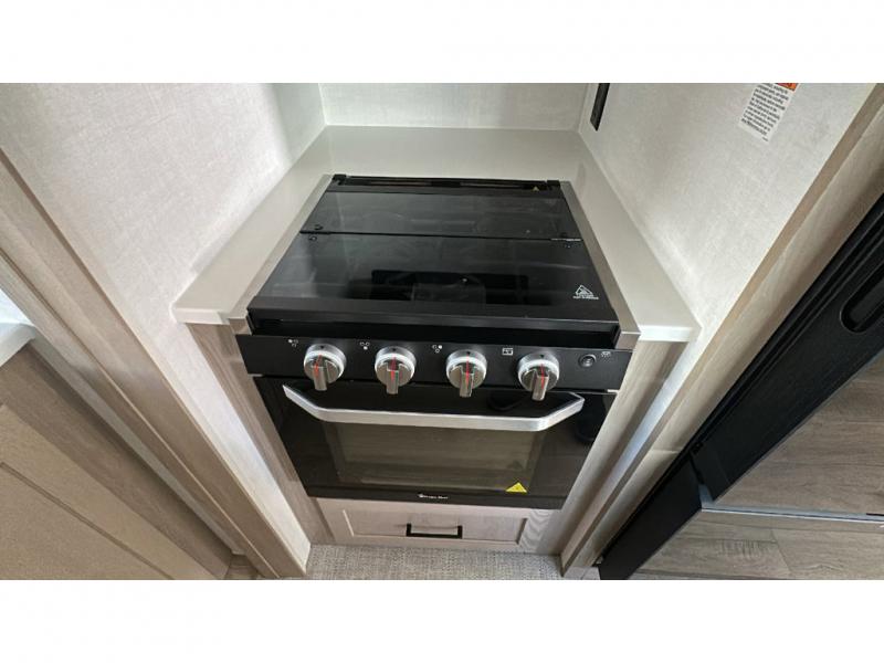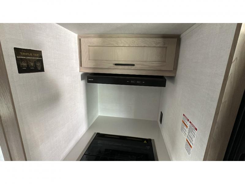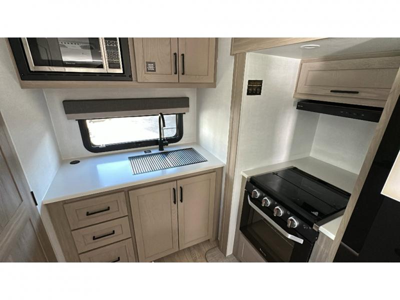 This stunning travel trailer is designed to provide the ultimate in comfort, convenience on the open road. The full bathroom is a haven for relaxation and refreshment, while the kitchen is equipped with a microwave, overhead cabinets, a three-burner cooktop, and a 12V refrigerator, making meal prep and dining the easiest task. The kitchen pantry provides ample storage for your favorite ingredients. Further, the booth dinette is a cozy spot for meals or socializing, and the theater seating is perfect for relaxing and enjoying your favorite shows or movies on the 12V Smart TV. Plus, the front bedroom is a serene retreat, featuring a spacious queen bed and convenient wardrobe, providing the perfect spot to rest and recharge after a day of adventure.