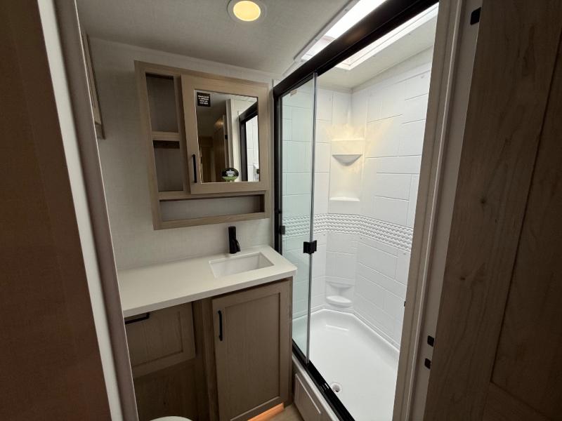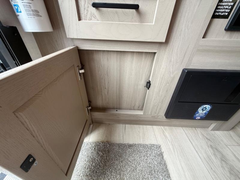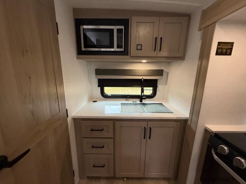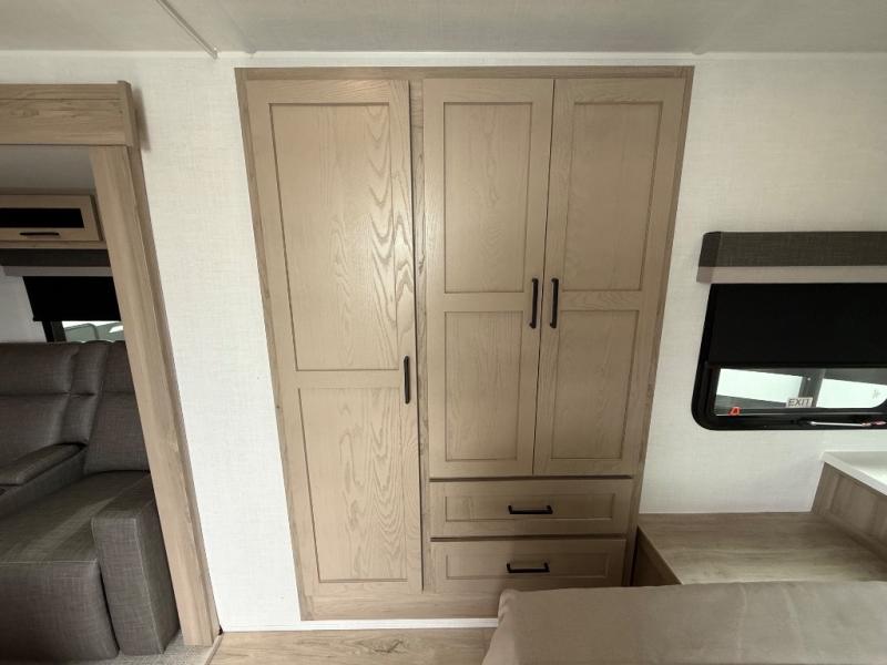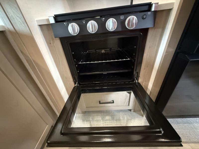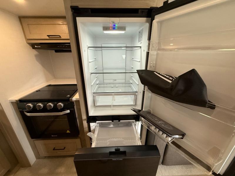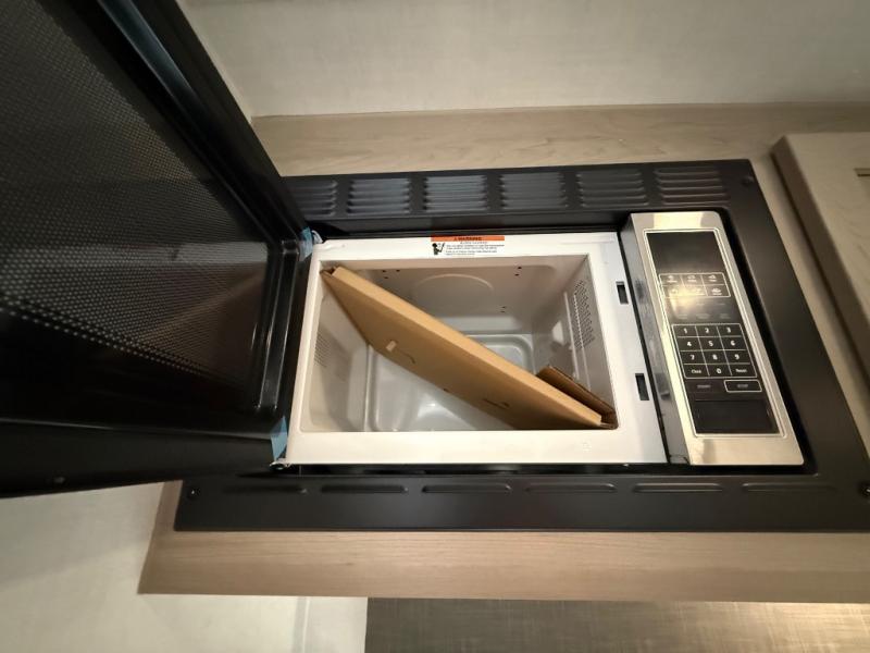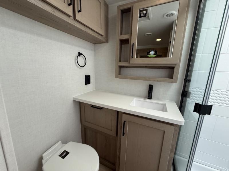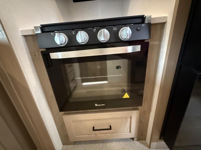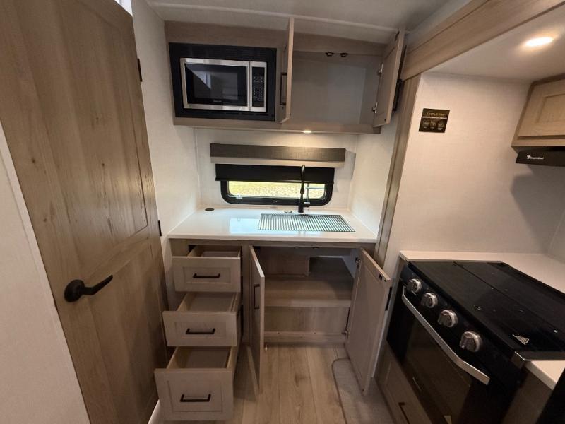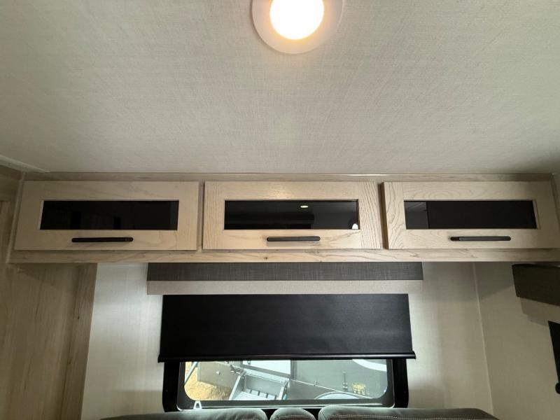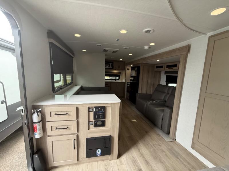 This stunning travel trailer is designed to provide the ultimate in comfort, convenience on the open road. The full bathroom is a haven for relaxation and refreshment, while the kitchen is equipped with a microwave, overhead cabinets, a three-burner cooktop, and a 12V refrigerator, making meal prep and dining the easiest task. The kitchen pantry provides ample storage for your favorite ingredients. Further, the booth dinette is a cozy spot for meals or socializing, and the theater seating is perfect for relaxing and enjoying your favorite shows or movies on the 12V Smart TV. Plus, the front bedroom is a serene retreat, featuring a spacious queen bed and convenient wardrobe, providing the perfect spot to rest and recharge after a day of adventure.
