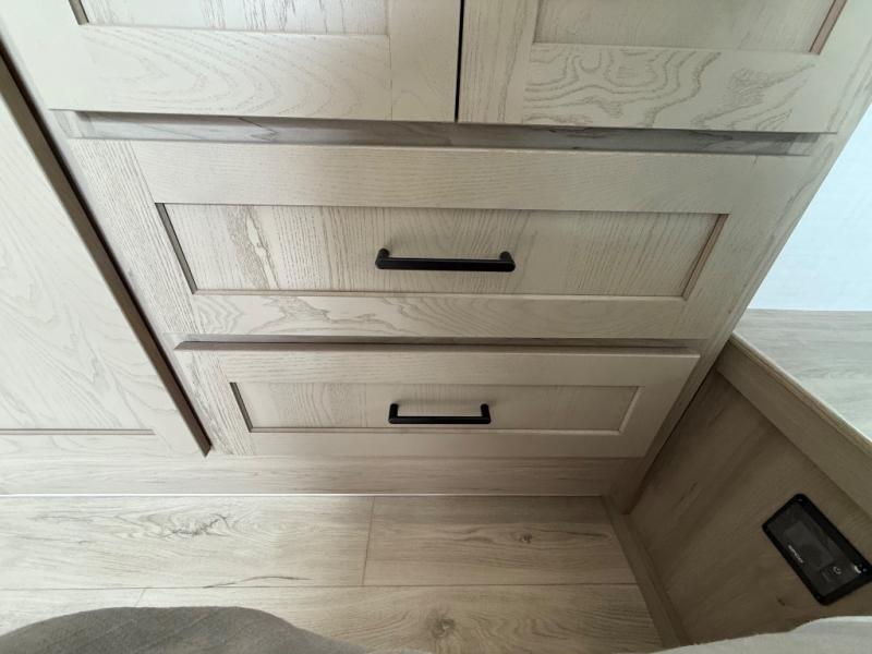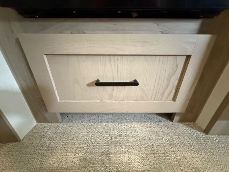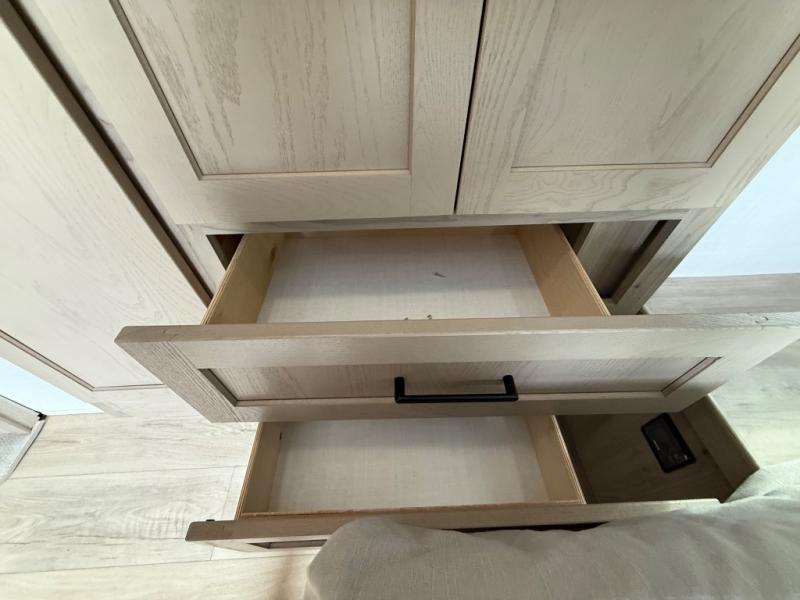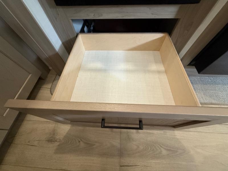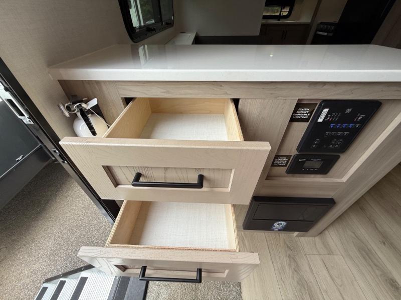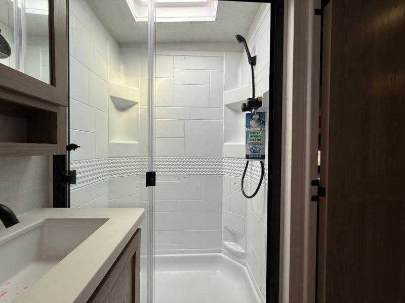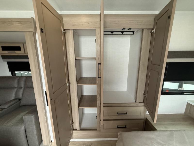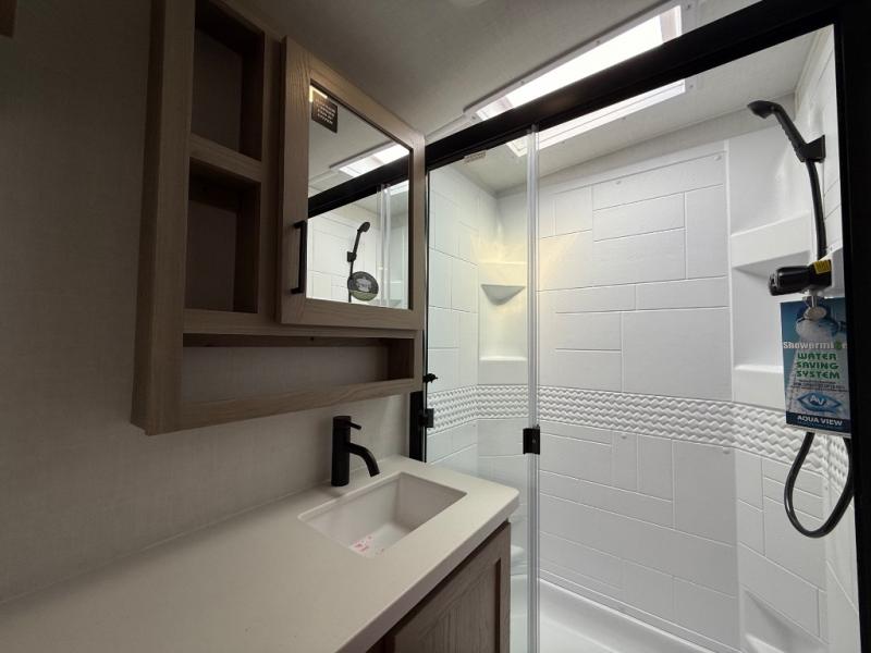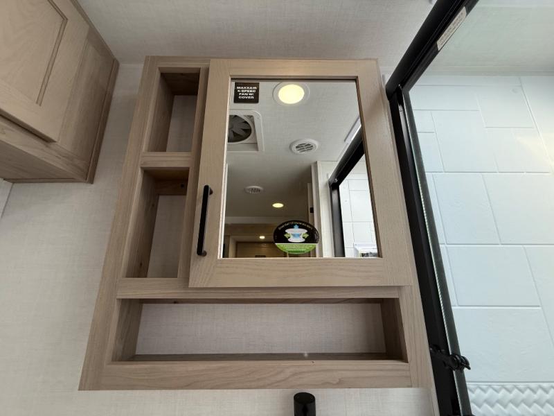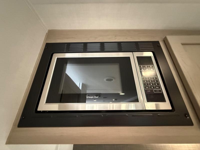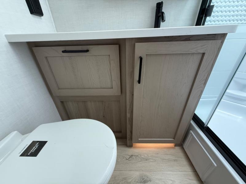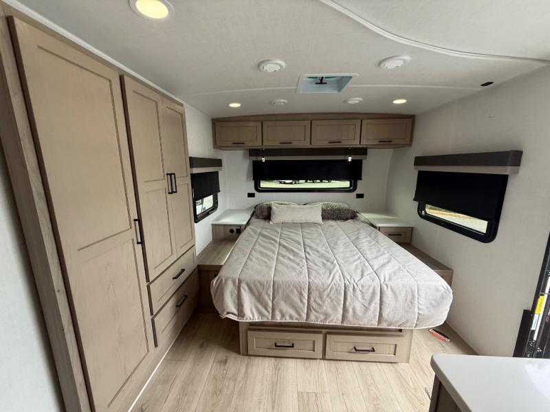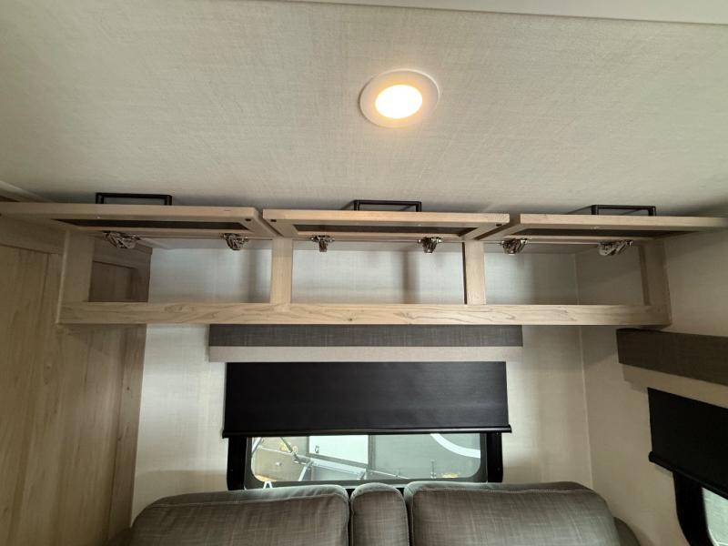 This stunning travel trailer is designed to provide the ultimate in comfort, convenience on the open road. The full bathroom is a haven for relaxation and refreshment, while the kitchen is equipped with a microwave, overhead cabinets, a three-burner cooktop, and a 12V refrigerator, making meal prep and dining the easiest task. The kitchen pantry provides ample storage for your favorite ingredients. Further, the booth dinette is a cozy spot for meals or socializing, and the theater seating is perfect for relaxing and enjoying your favorite shows or movies on the 12V Smart TV. Plus, the front bedroom is a serene retreat, featuring a spacious queen bed and convenient wardrobe, providing the perfect spot to rest and recharge after a day of adventure.