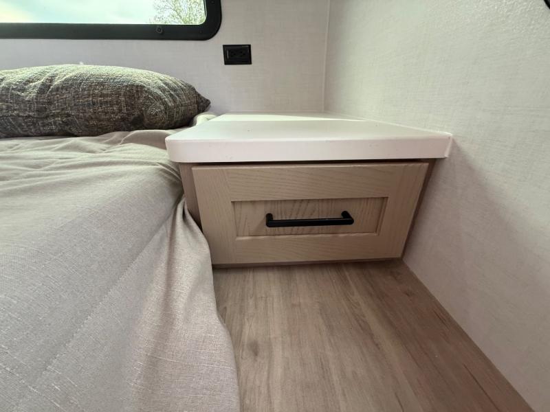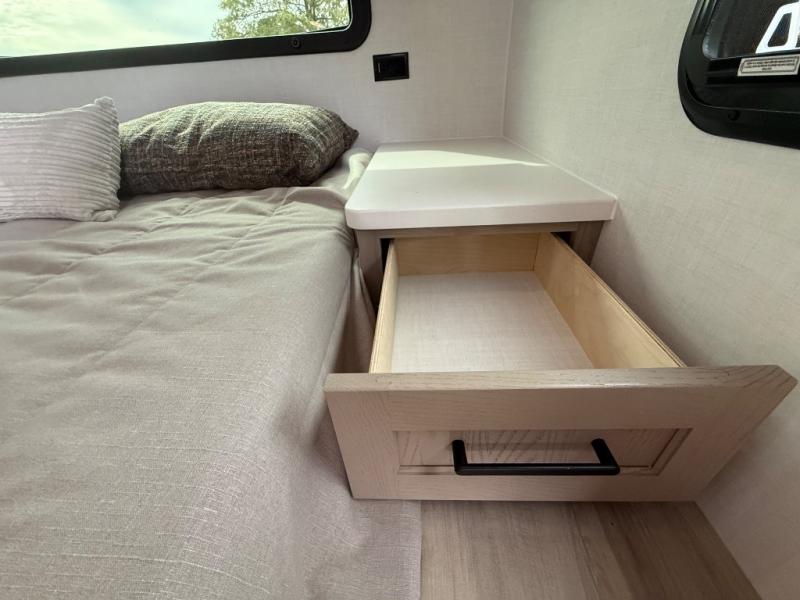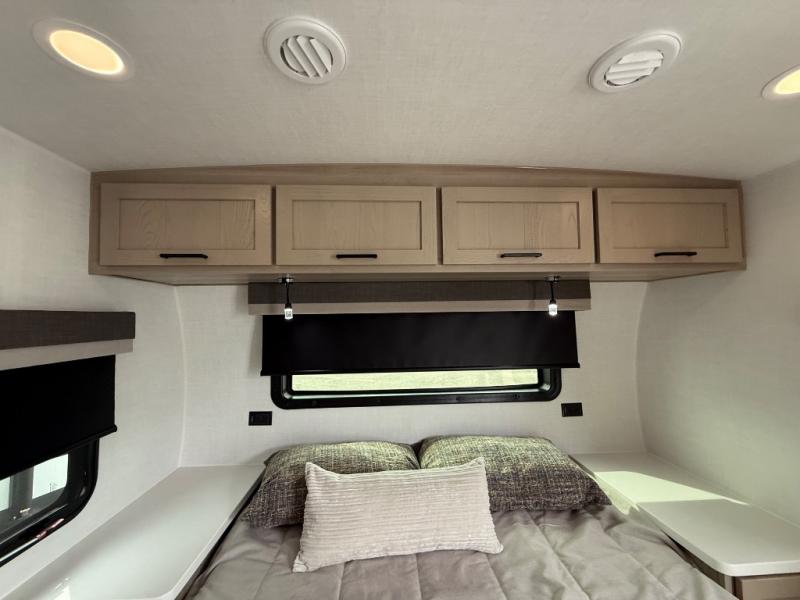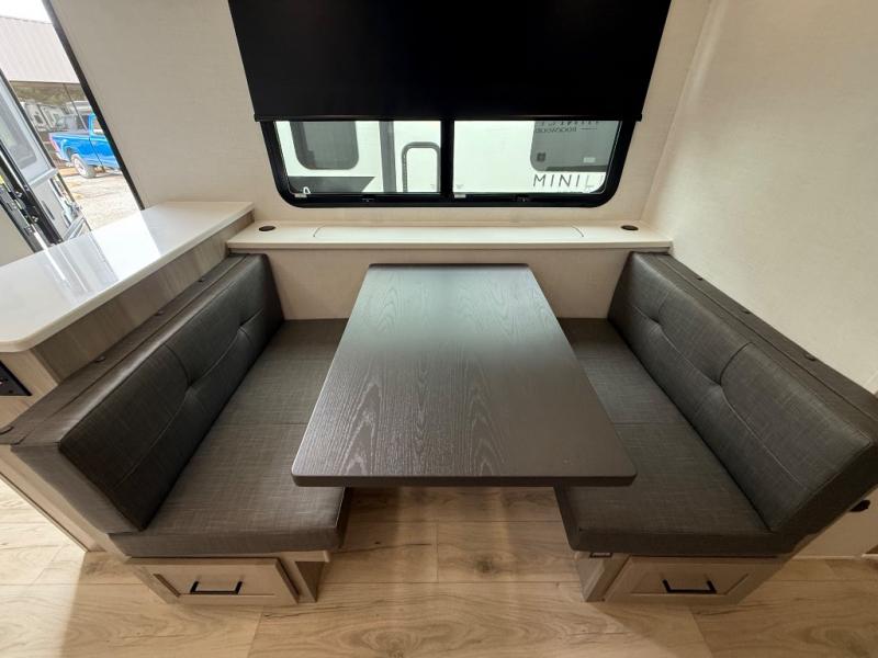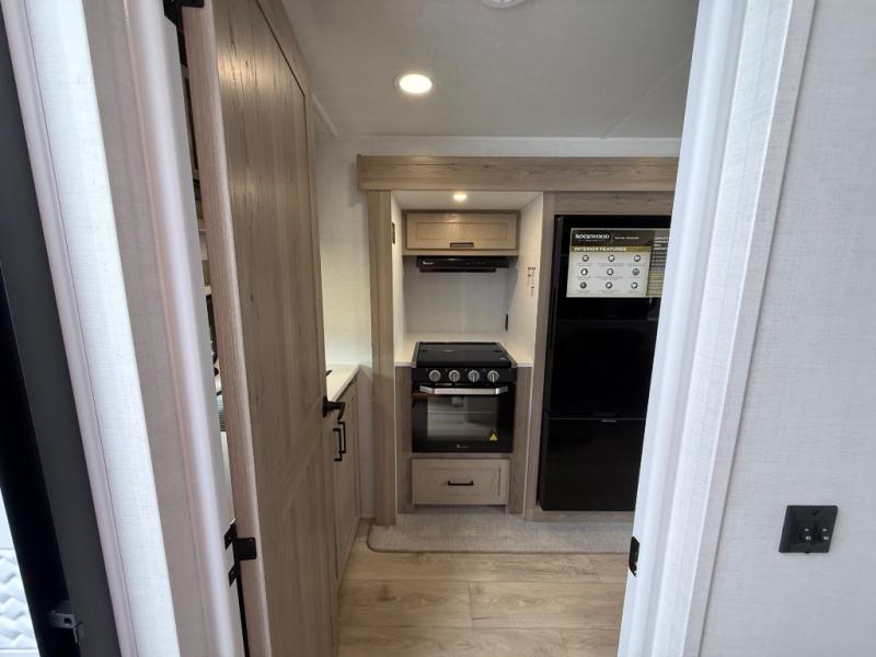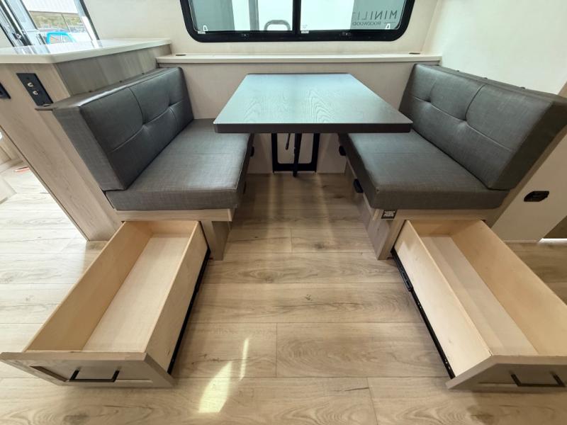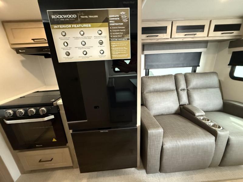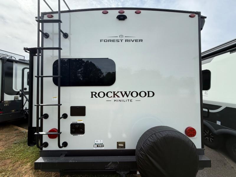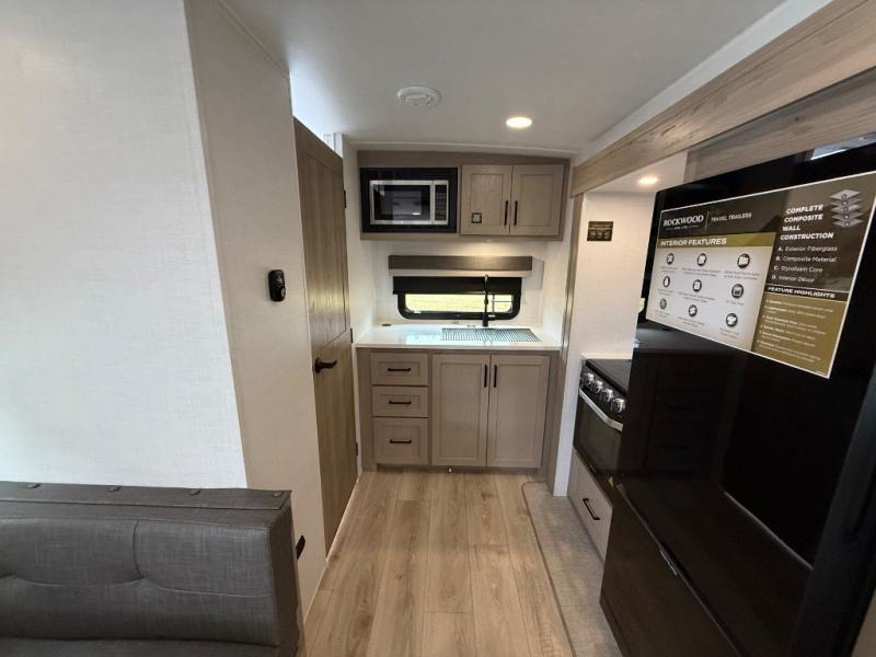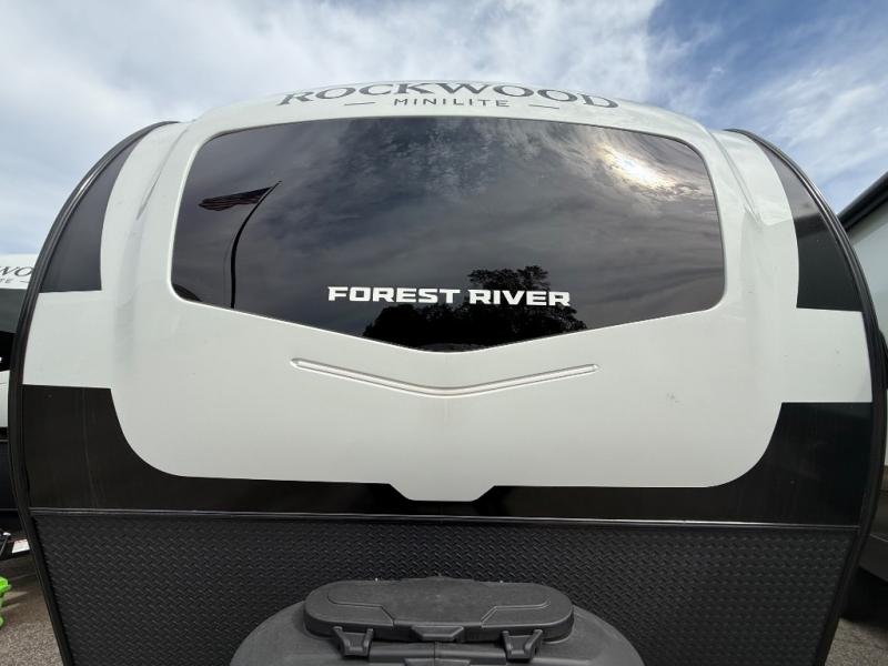 Each Rockwood Mini Lite travel trailer by Forest River is constructed with a fully laminated one-piece walkable roof, sleek frameless windows, and a six-sided full aluminum frame for strength and durability. The 12V thermostatically controlled heated tanks, plus radiant foil in the underbelly will allow you to camp well into the colder months, and the 200W roof solar panel will be perfect for a little off-gridding. Each model includes solid surface kitchen countertops, hidden hinge cabinet doors, roller shades, plus many more interior features. Having an AIR 360+ omnidirectional antenna with WiFi prep on board gives you the option to get some work done if it's needed, and the power tongue jack provides hassle-free set up, so you can enjoy more time relaxing!