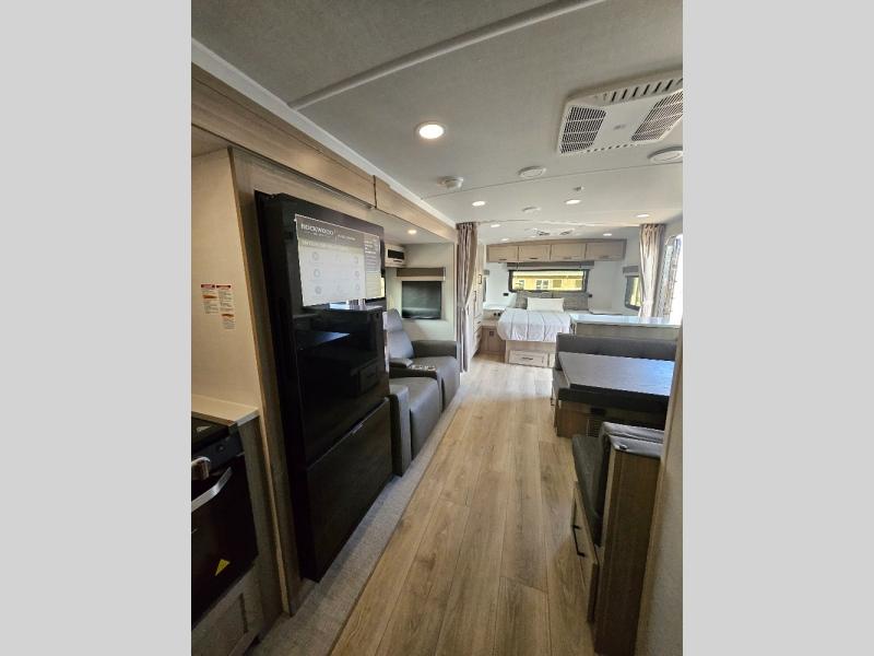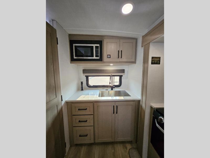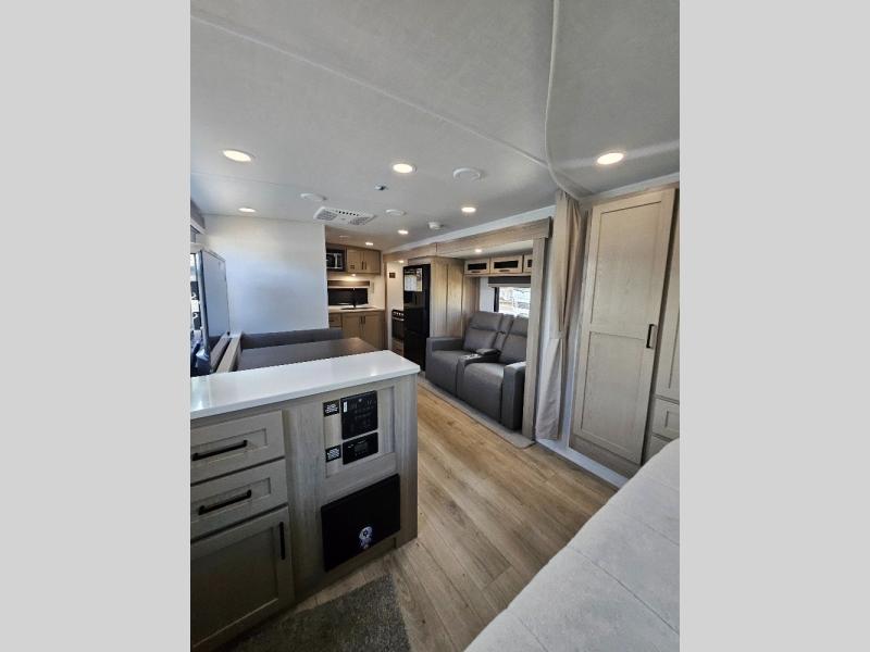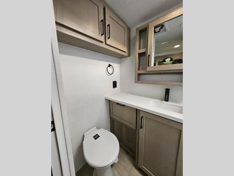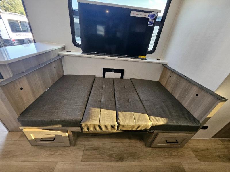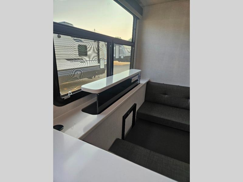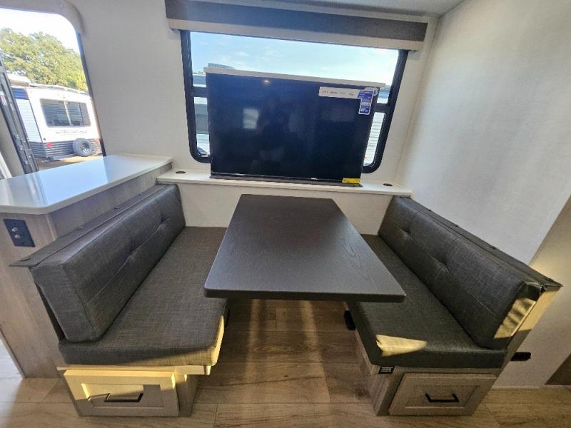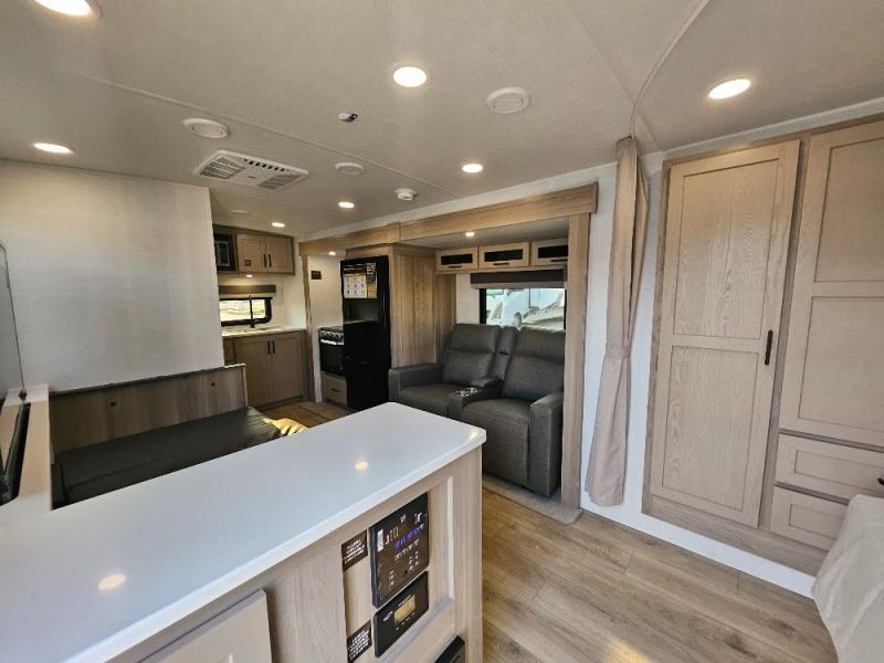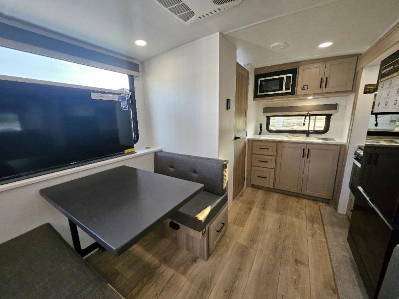 This stunning travel trailer is designed to provide the ultimate in comfort, convenience on the open road. The full bathroom is a haven for relaxation and refreshment, while the kitchen is equipped with a microwave, overhead cabinets, a three-burner cooktop, and a 12V refrigerator, making meal prep and dining the easiest task. The kitchen pantry provides ample storage for your favorite ingredients. Further, the booth dinette is a cozy spot for meals or socializing, and the theater seating is perfect for relaxing and enjoying your favorite shows or movies on the 12V Smart TV. Plus, the front bedroom is a serene retreat, featuring a spacious queen bed and convenient wardrobe, providing the perfect spot to rest and recharge after a day of adventure.