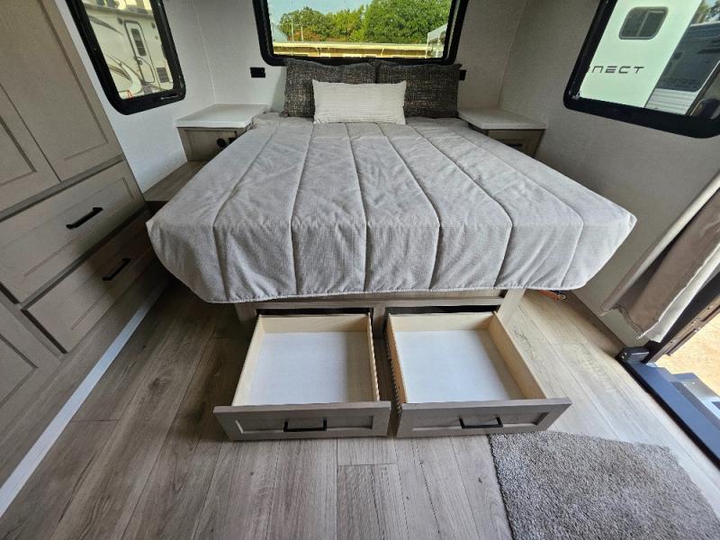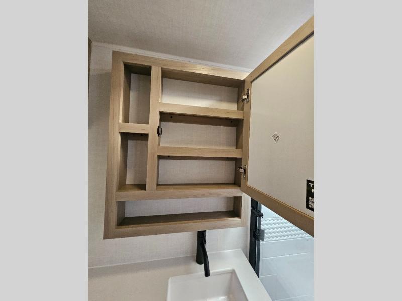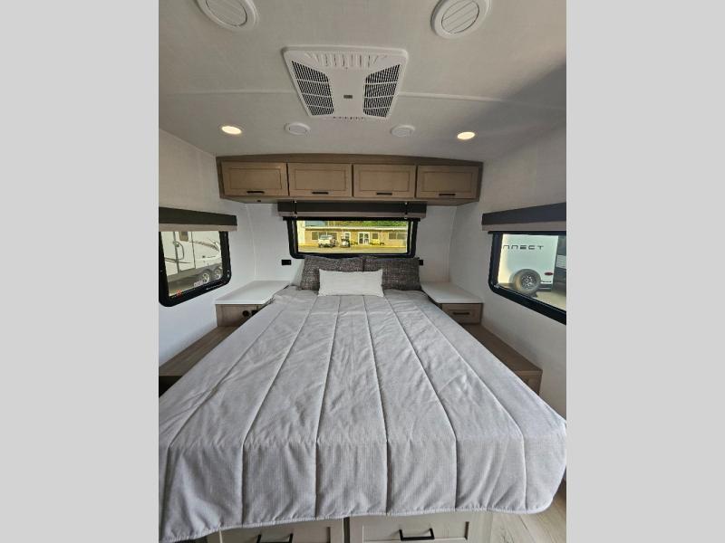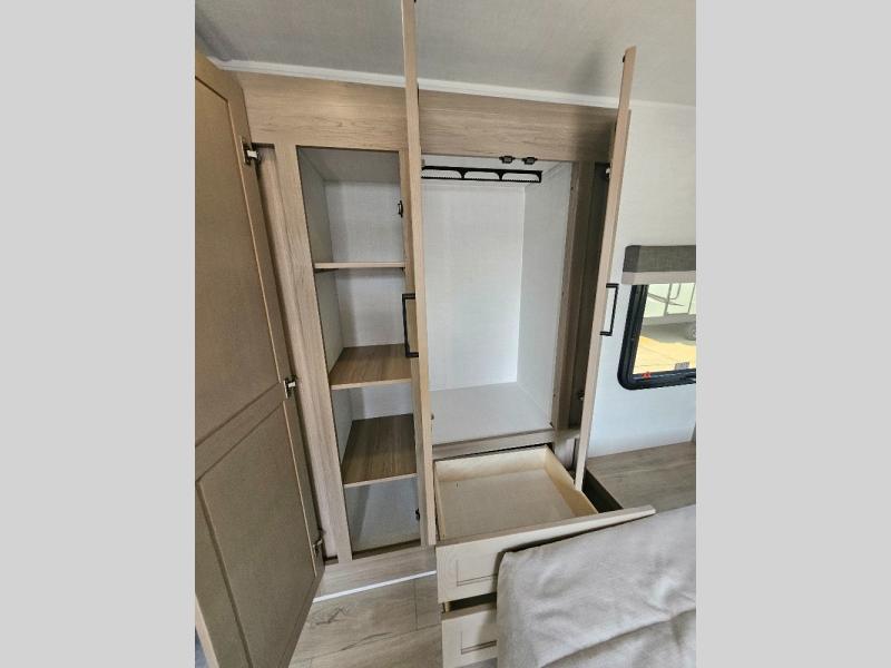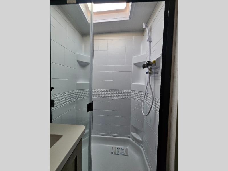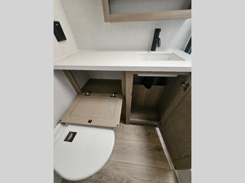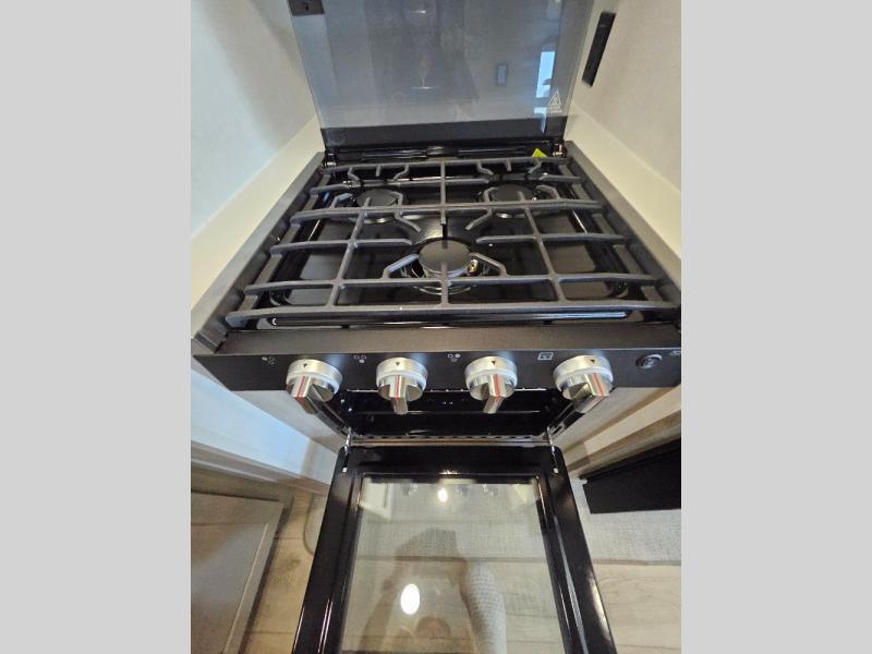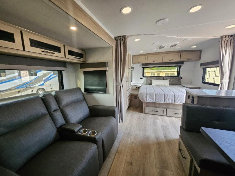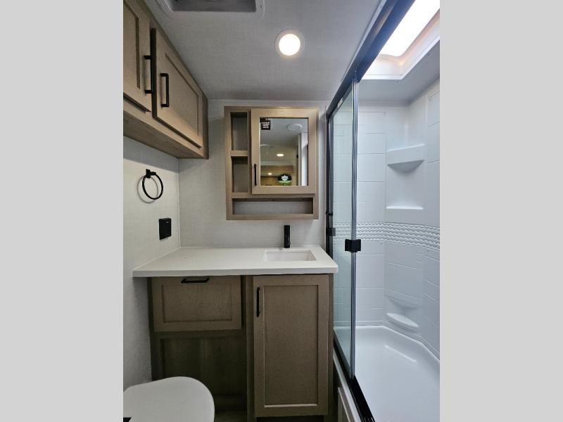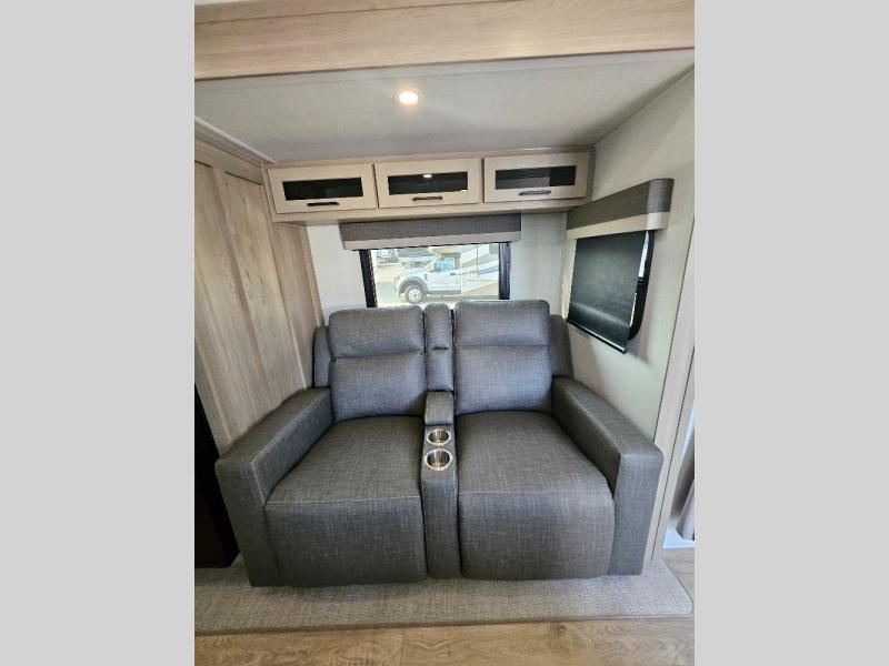 This stunning travel trailer is designed to provide the ultimate in comfort, convenience on the open road. The full bathroom is a haven for relaxation and refreshment, while the kitchen is equipped with a microwave, overhead cabinets, a three-burner cooktop, and a 12V refrigerator, making meal prep and dining the easiest task. The kitchen pantry provides ample storage for your favorite ingredients. Further, the booth dinette is a cozy spot for meals or socializing, and the theater seating is perfect for relaxing and enjoying your favorite shows or movies on the 12V Smart TV. Plus, the front bedroom is a serene retreat, featuring a spacious queen bed and convenient wardrobe, providing the perfect spot to rest and recharge after a day of adventure.
