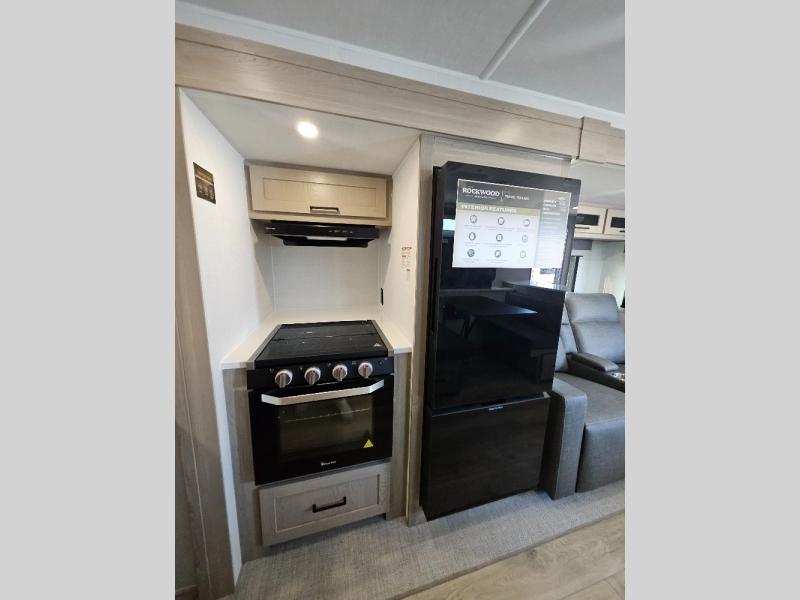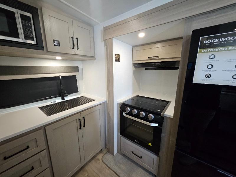 Each Rockwood Mini Lite travel trailer by Forest River is constructed with a fully laminated one-piece walkable roof, sleek frameless windows, and a six-sided full aluminum frame for strength and durability. The 12V thermostatically controlled heated tanks, plus radiant foil in the underbelly will allow you to camp well into the colder months, and the 200W roof solar panel will be perfect for a little off-gridding. Each model includes solid surface kitchen countertops, hidden hinge cabinet doors, roller shades, plus many more interior features. Having an AIR 360+ omnidirectional antenna with WiFi prep on board gives you the option to get some work done if it's needed, and the power tongue jack provides hassle-free set up, so you can enjoy more time relaxing!