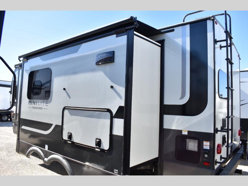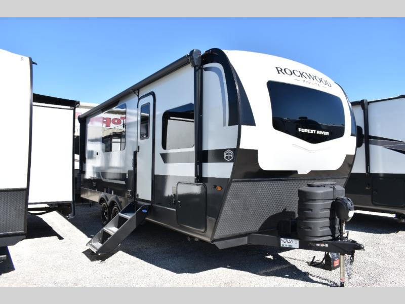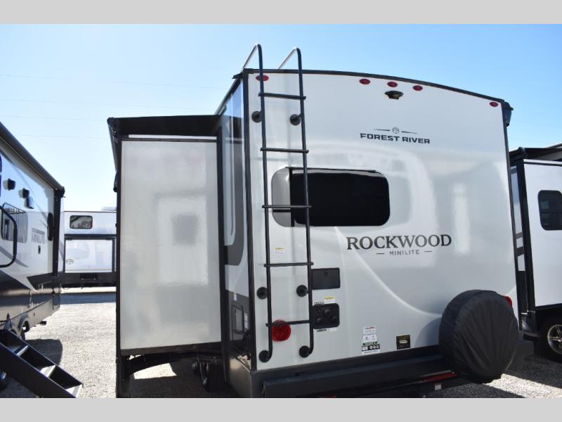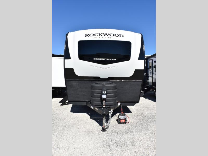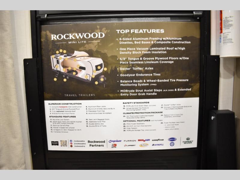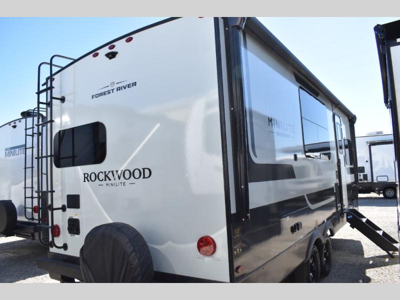 Each Rockwood Mini Lite travel trailer by Forest River is constructed with a fully laminated one-piece walkable roof, sleek frameless windows, and a six-sided full aluminum frame for strength and durability. The 12V thermostatically controlled heated tanks, plus radiant foil in the underbelly will allow you to camp well into the colder months, and the 200W roof solar panel will be perfect for a little off-gridding. Each model includes solid surface kitchen countertops, hidden hinge cabinet doors, roller shades, plus many more interior features. Having an AIR 360+ omnidirectional antenna with WiFi prep on board gives you the option to get some work done if it's needed, and the power tongue jack provides hassle-free set up, so you can enjoy more time relaxing!