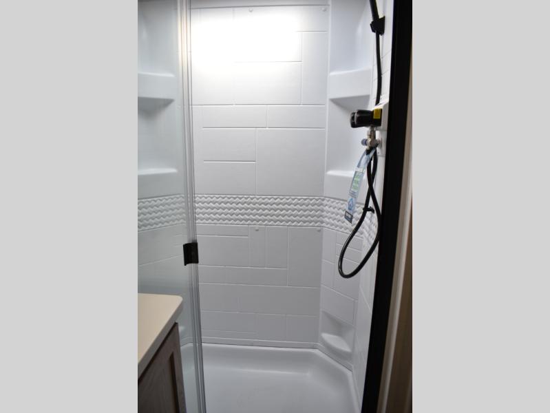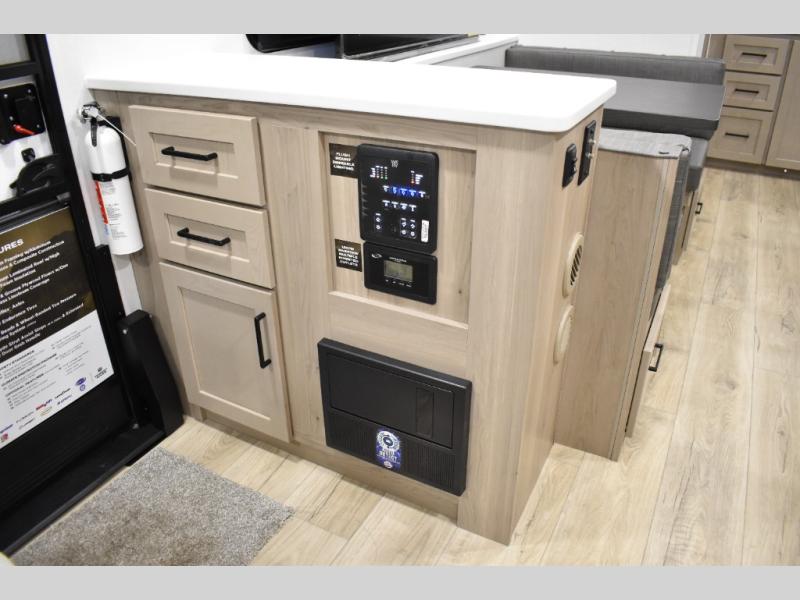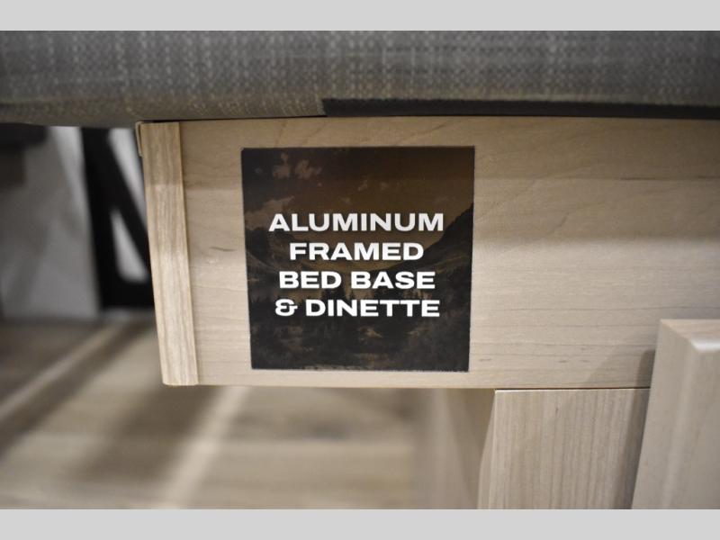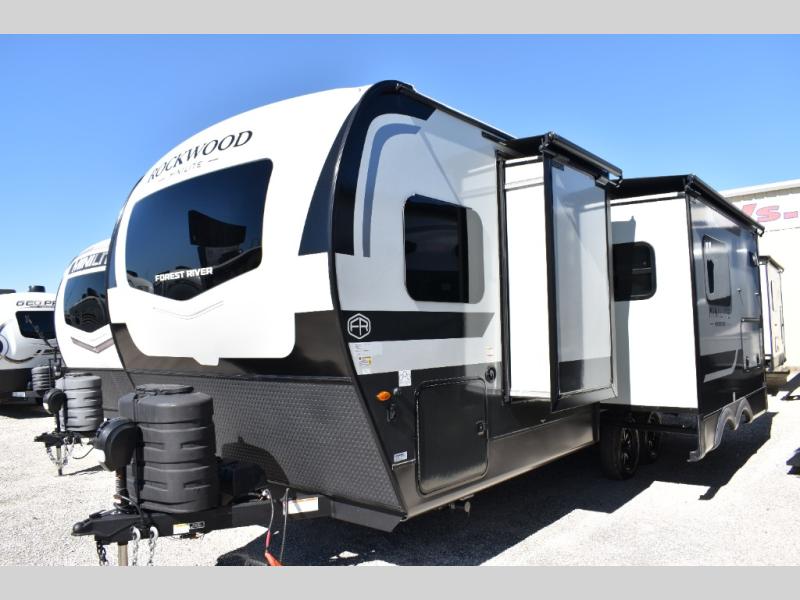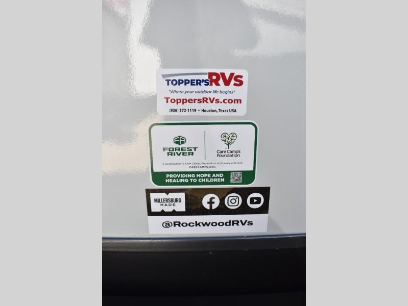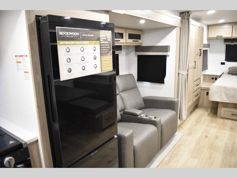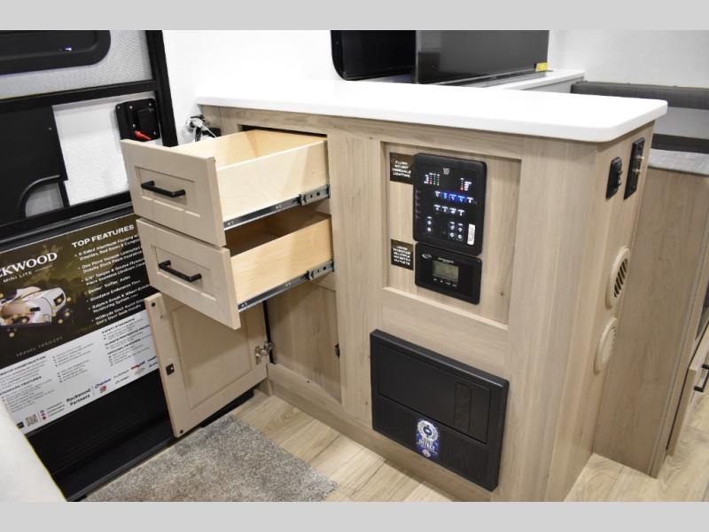 Each Rockwood Mini Lite travel trailer by Forest River is constructed with a fully laminated one-piece walkable roof, sleek frameless windows, and a six-sided full aluminum frame for strength and durability. The 12V thermostatically controlled heated tanks, plus radiant foil in the underbelly will allow you to camp well into the colder months, and the 200W roof solar panel will be perfect for a little off-gridding. Each model includes solid surface kitchen countertops, hidden hinge cabinet doors, roller shades, plus many more interior features. Having an AIR 360+ omnidirectional antenna with WiFi prep on board gives you the option to get some work done if it's needed, and the power tongue jack provides hassle-free set up, so you can enjoy more time relaxing!