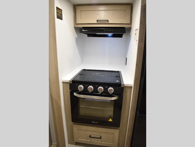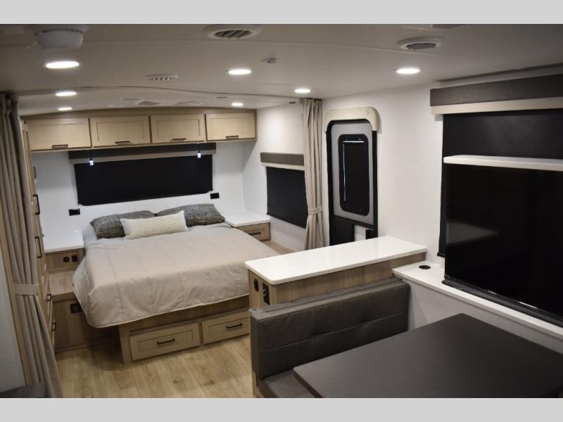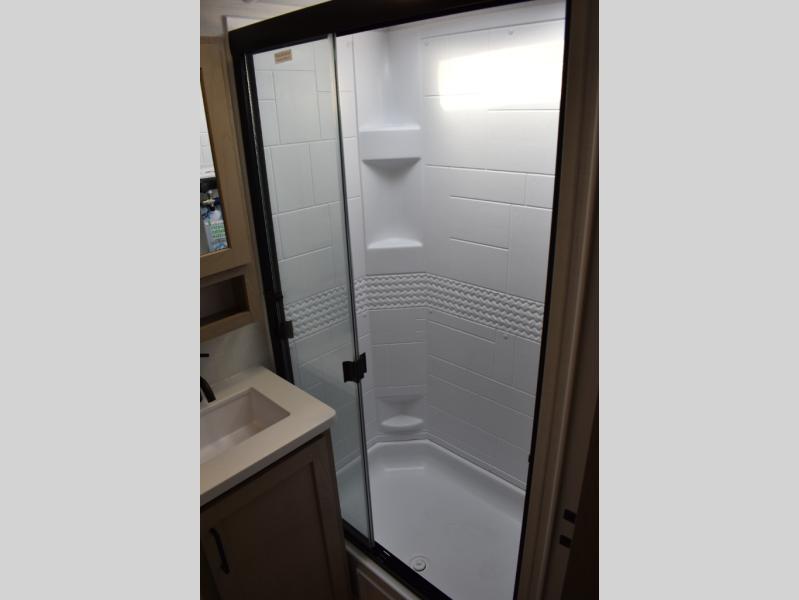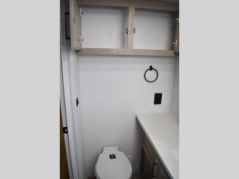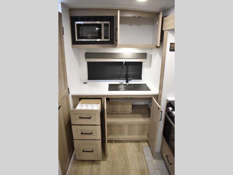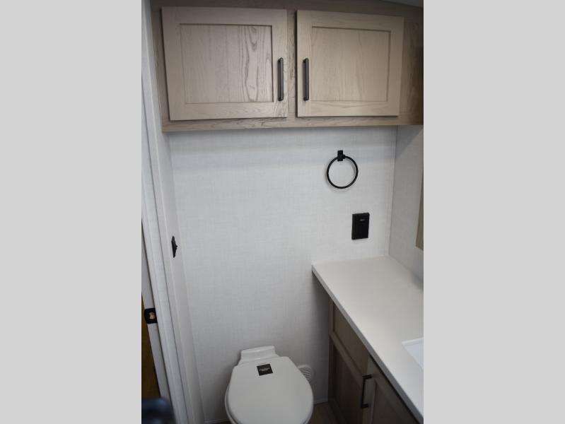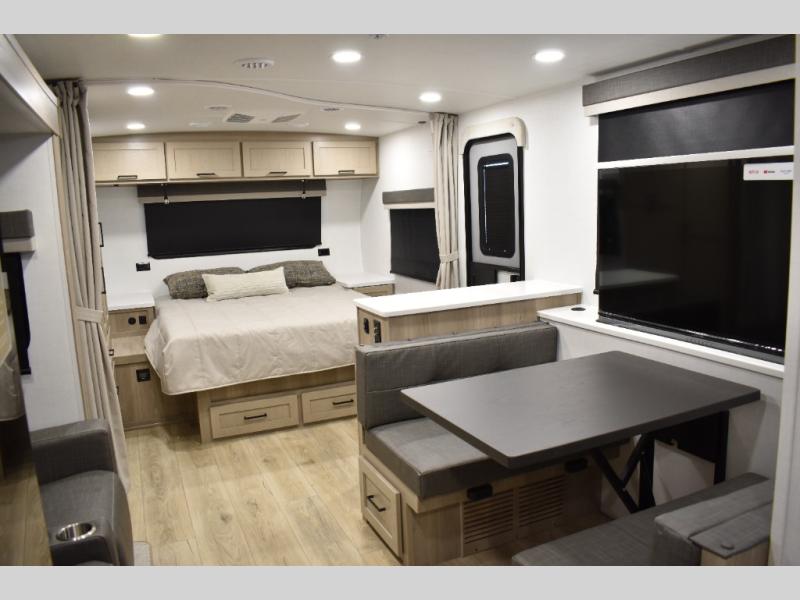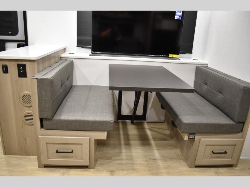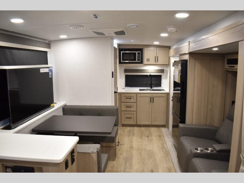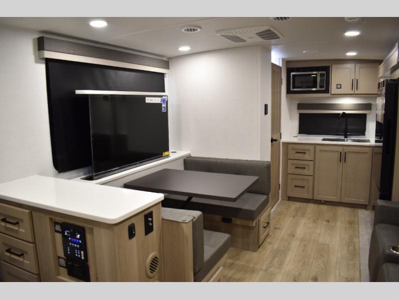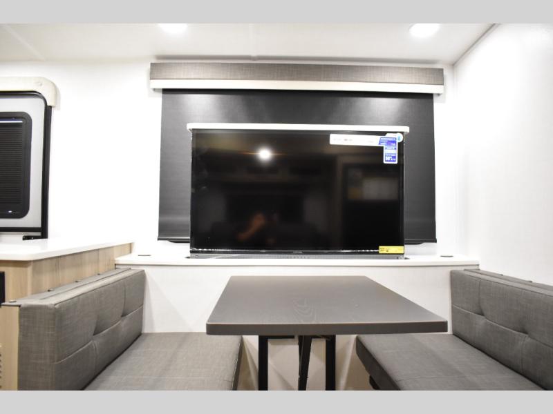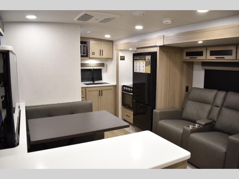 This stunning travel trailer is designed to provide the ultimate in comfort, convenience on the open road. The full bathroom is a haven for relaxation and refreshment, while the kitchen is equipped with a microwave, overhead cabinets, a three-burner cooktop, and a 12V refrigerator, making meal prep and dining the easiest task. The kitchen pantry provides ample storage for your favorite ingredients. Further, the booth dinette is a cozy spot for meals or socializing, and the theater seating is perfect for relaxing and enjoying your favorite shows or movies on the 12V Smart TV. Plus, the front bedroom is a serene retreat, featuring a spacious queen bed and convenient wardrobe, providing the perfect spot to rest and recharge after a day of adventure.