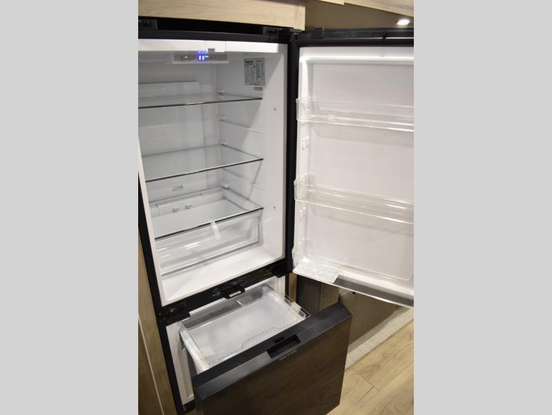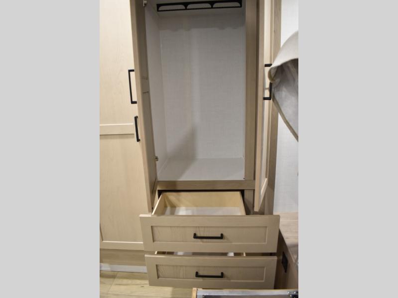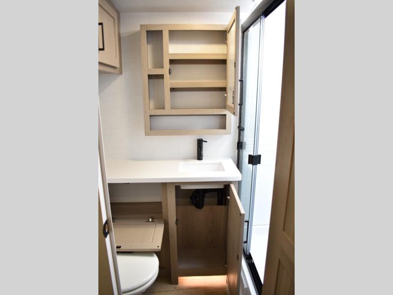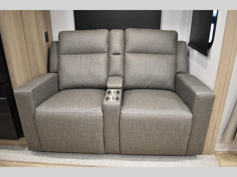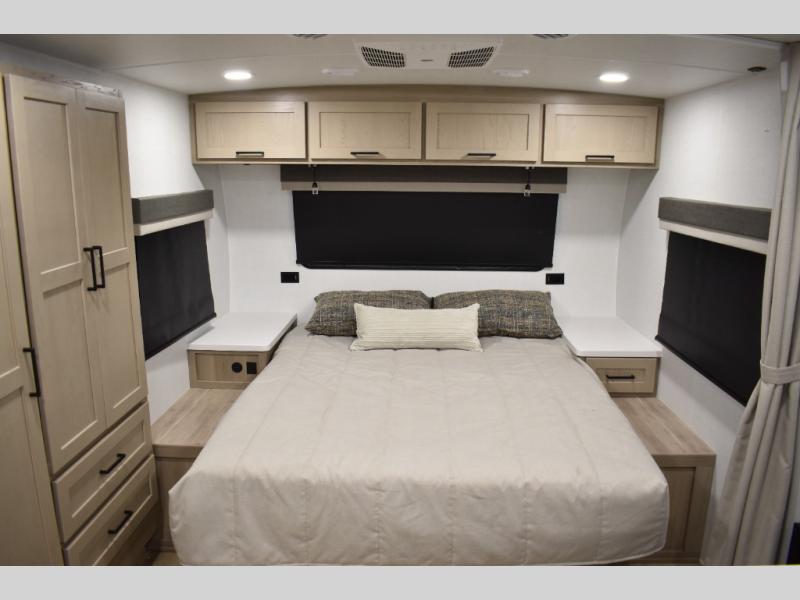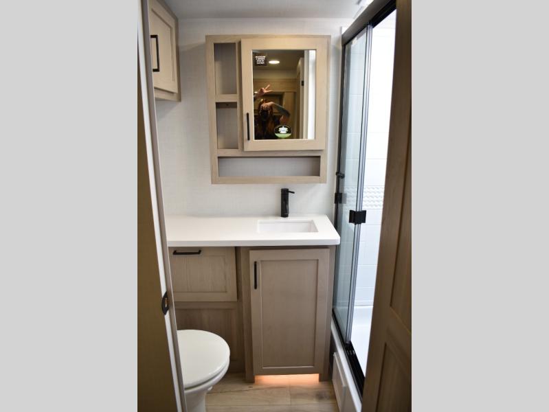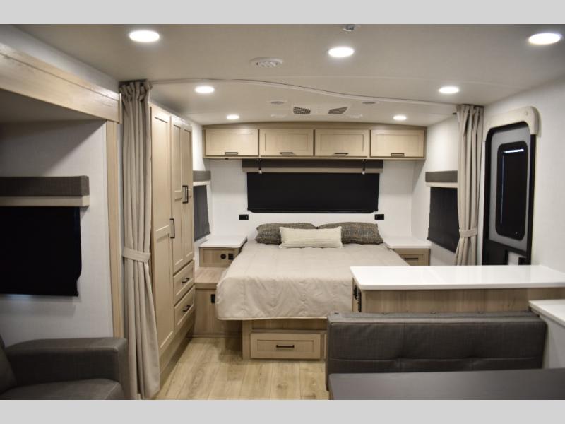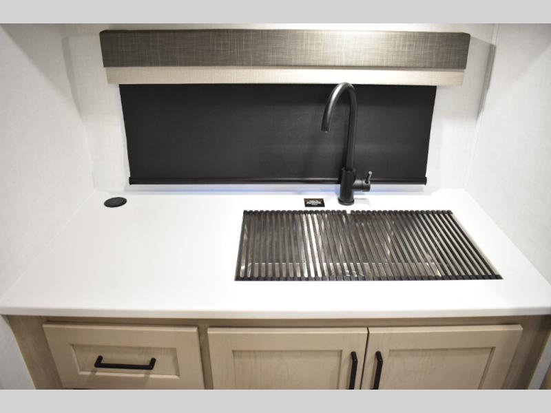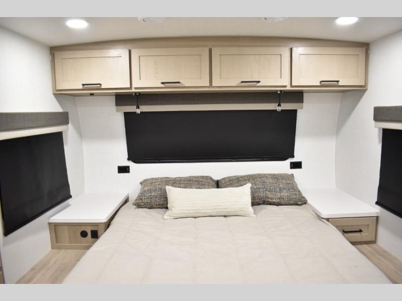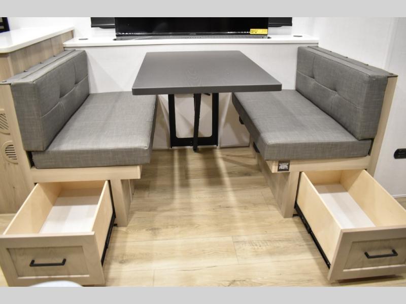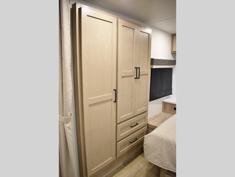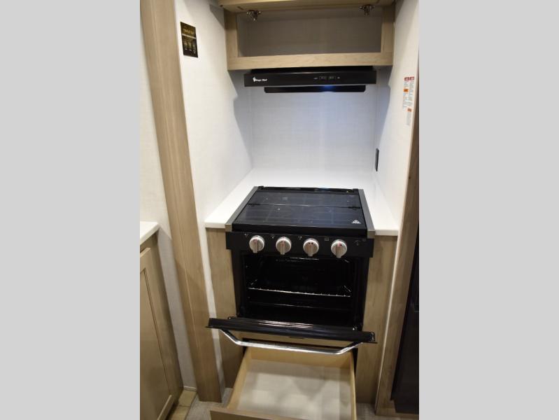 This stunning travel trailer is designed to provide the ultimate in comfort, convenience on the open road. The full bathroom is a haven for relaxation and refreshment, while the kitchen is equipped with a microwave, overhead cabinets, a three-burner cooktop, and a 12V refrigerator, making meal prep and dining the easiest task. The kitchen pantry provides ample storage for your favorite ingredients. Further, the booth dinette is a cozy spot for meals or socializing, and the theater seating is perfect for relaxing and enjoying your favorite shows or movies on the 12V Smart TV. Plus, the front bedroom is a serene retreat, featuring a spacious queen bed and convenient wardrobe, providing the perfect spot to rest and recharge after a day of adventure.