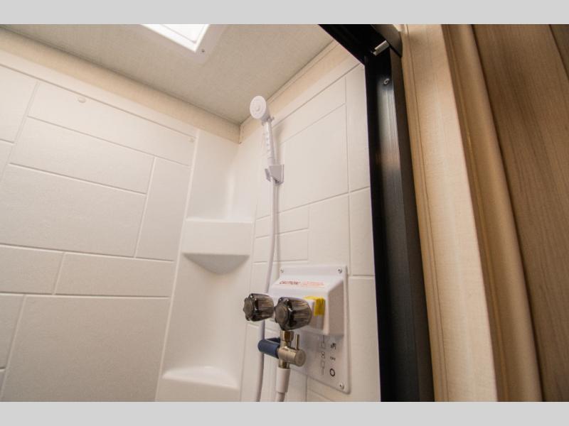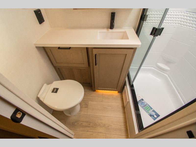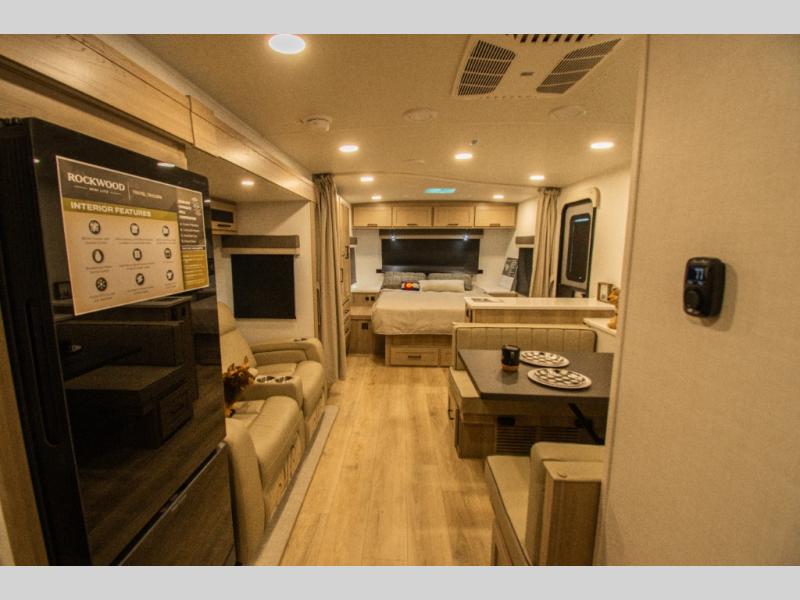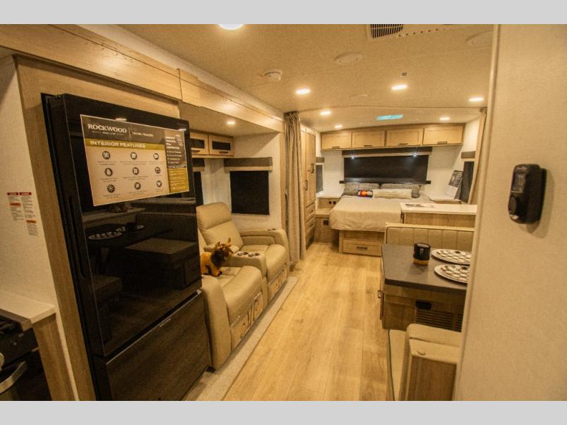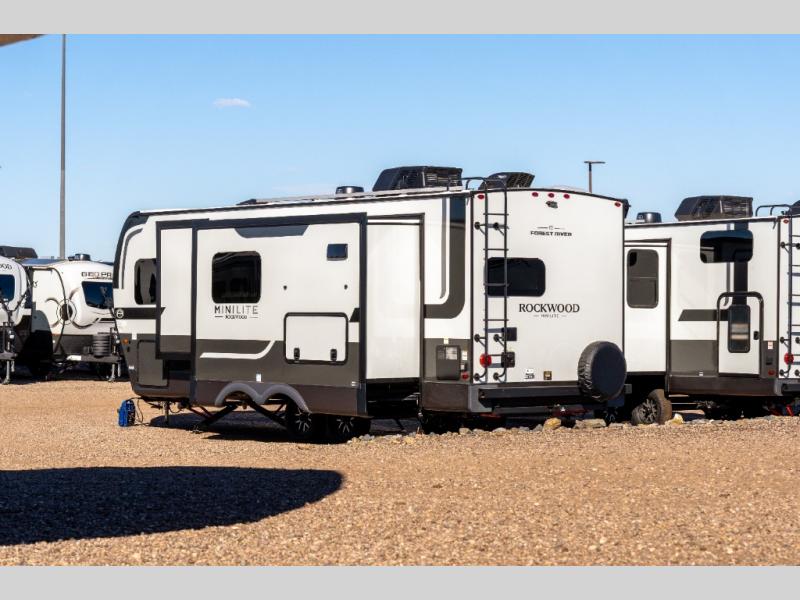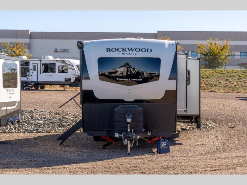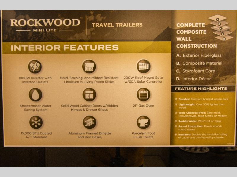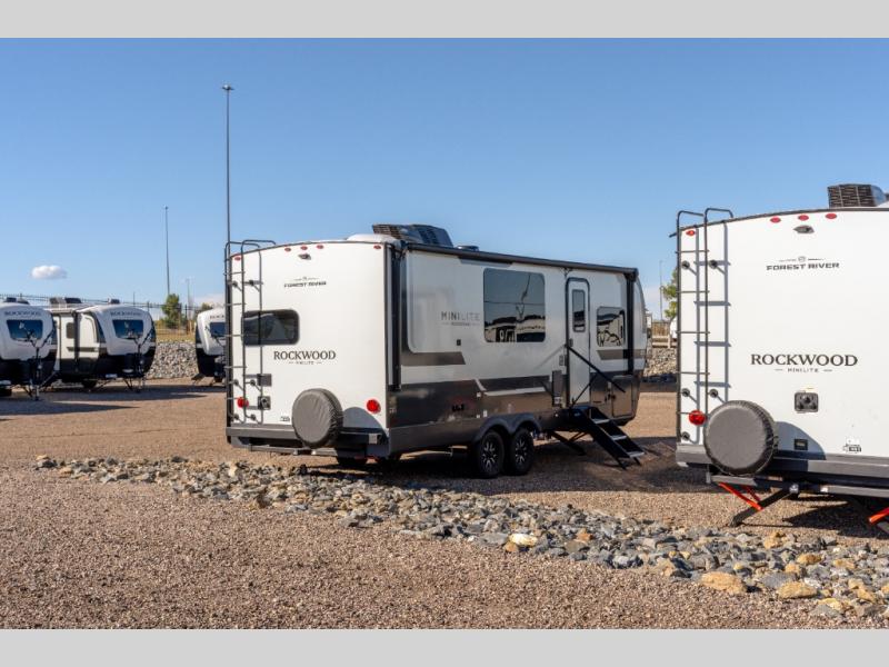 Each Rockwood Mini Lite travel trailer by Forest River is constructed with a fully laminated one-piece walkable roof, sleek frameless windows, and a six-sided full aluminum frame for strength and durability. The 12V thermostatically controlled heated tanks, plus radiant foil in the underbelly will allow you to camp well into the colder months, and the 200W roof solar panel will be perfect for a little off-gridding. Each model includes solid surface kitchen countertops, hidden hinge cabinet doors, roller shades, plus many more interior features. Having an AIR 360+ omnidirectional antenna with WiFi prep on board gives you the option to get some work done if it's needed, and the power tongue jack provides hassle-free set up, so you can enjoy more time relaxing!