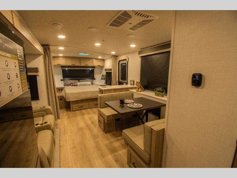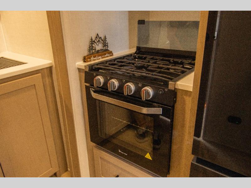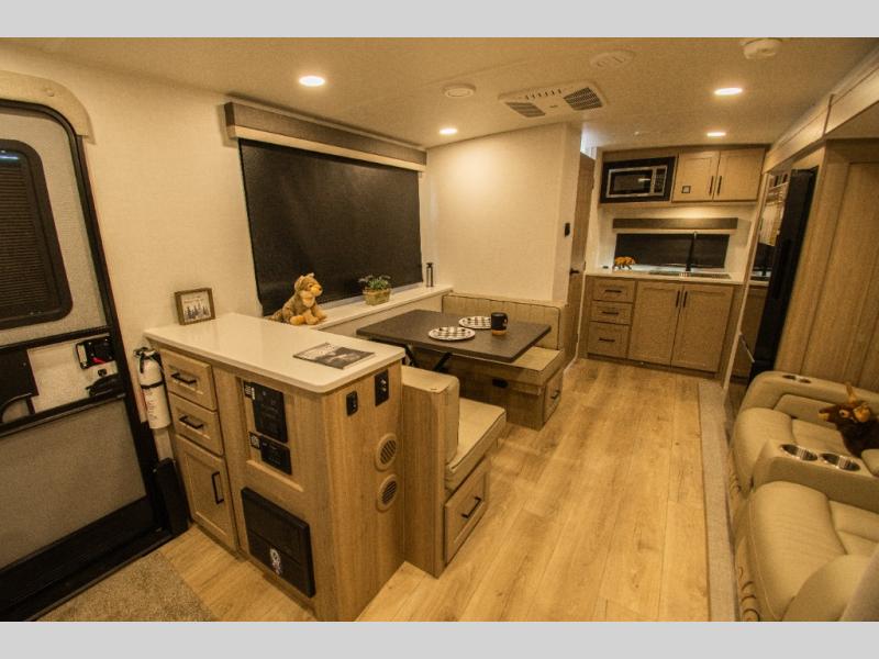 This stunning travel trailer is designed to provide the ultimate in comfort, convenience on the open road. The full bathroom is a haven for relaxation and refreshment, while the kitchen is equipped with a microwave, overhead cabinets, a three-burner cooktop, and a 12V refrigerator, making meal prep and dining the easiest task. The kitchen pantry provides ample storage for your favorite ingredients. Further, the booth dinette is a cozy spot for meals or socializing, and the theater seating is perfect for relaxing and enjoying your favorite shows or movies on the 12V Smart TV. Plus, the front bedroom is a serene retreat, featuring a spacious queen bed and convenient wardrobe, providing the perfect spot to rest and recharge after a day of adventure.