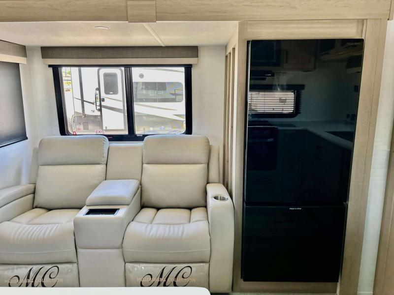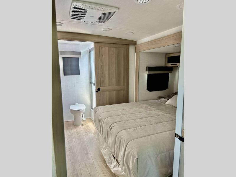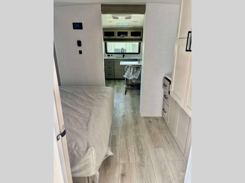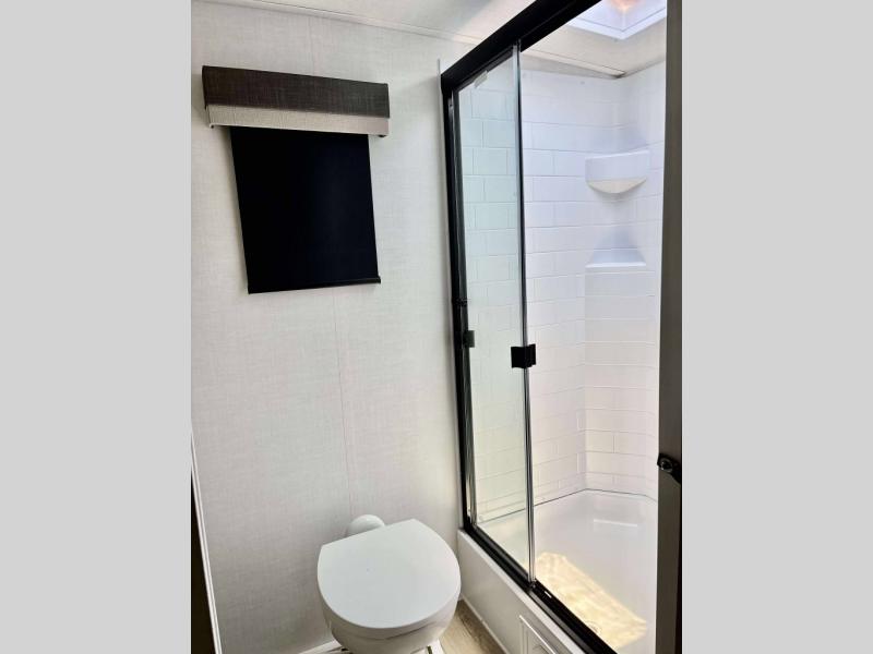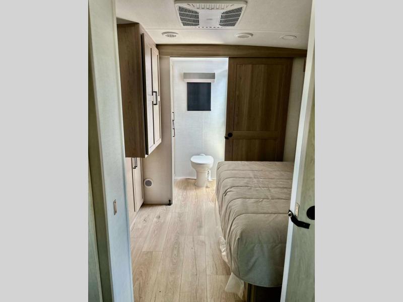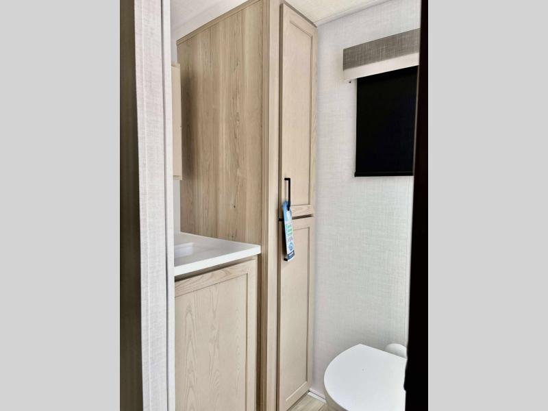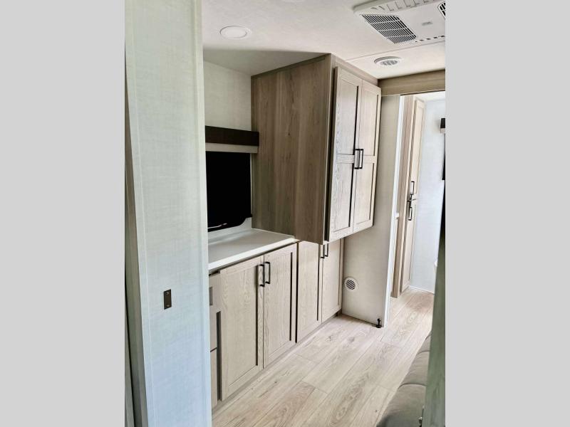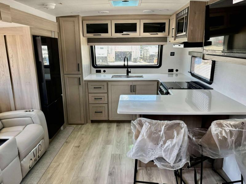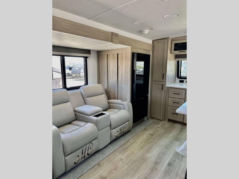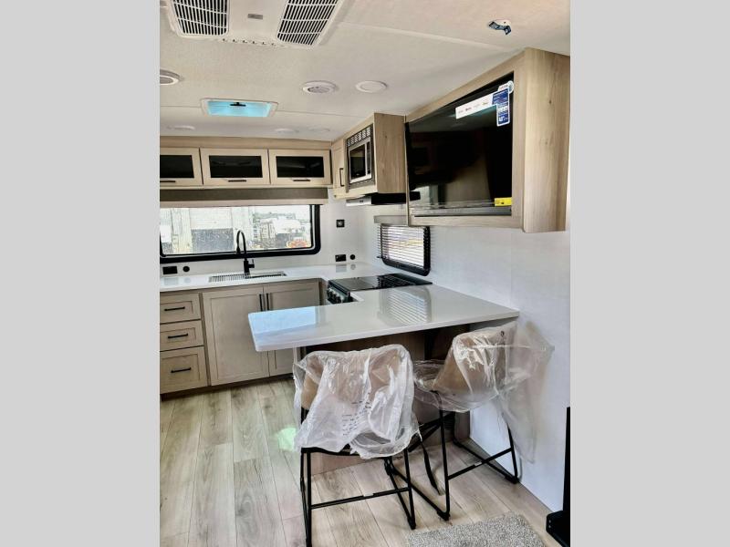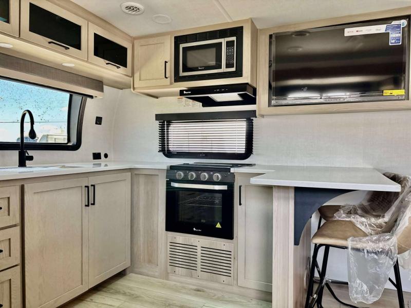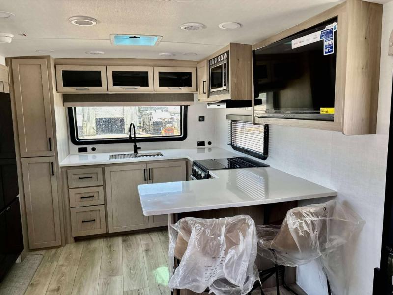 This travel trailer is the best option for you and your partner! The lavish full rear bathroom features a spacious layout and a convenient linen closet, perfect for relaxation and refreshment. The elegant bedroom boasts a plush queen bed, ample wardrobe space, and stylish dresser, creating a serene retreat. The spacious living room and kitchen combined area is the heart of the trailer, featuring plush theater seating for cozy movie nights, a generous closet for storing essentials, and a 12V Smart TV for entertainment on the go. Plus, the expansive countertop with chairs provides a perfect spot for gourmet meals or socializing, while the premium three-burner cooktop, well-stocked kitchen pantry, and high-performance microwave make meal prep and cooking a true delight.