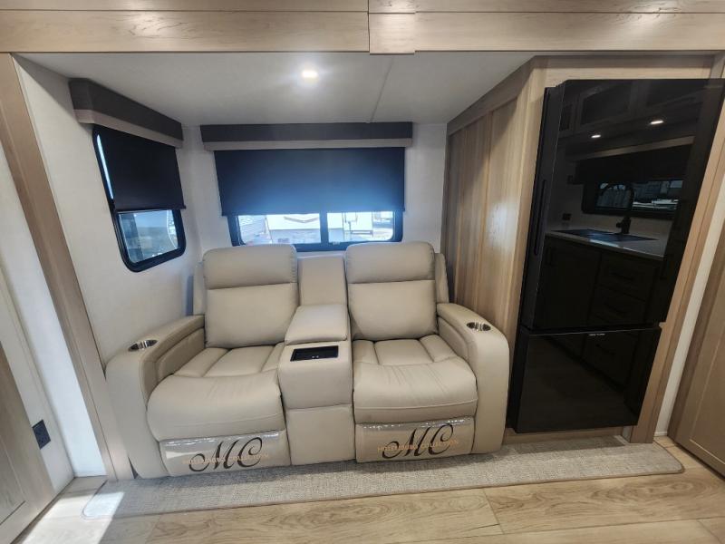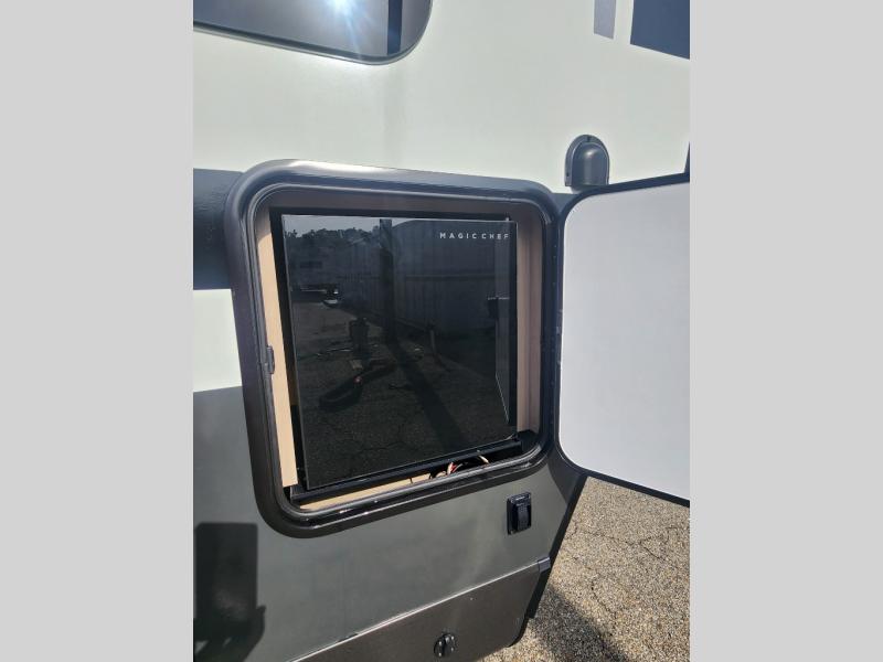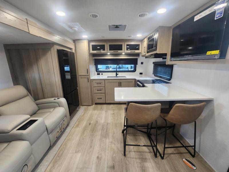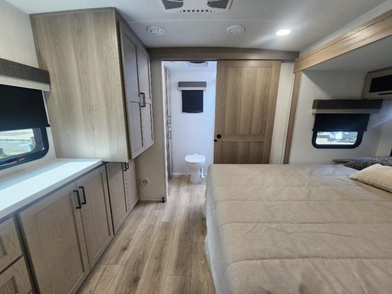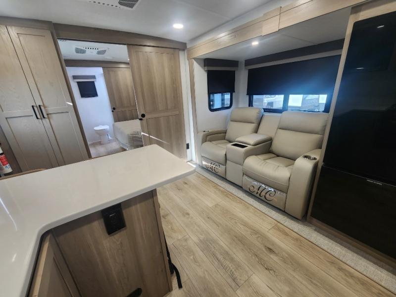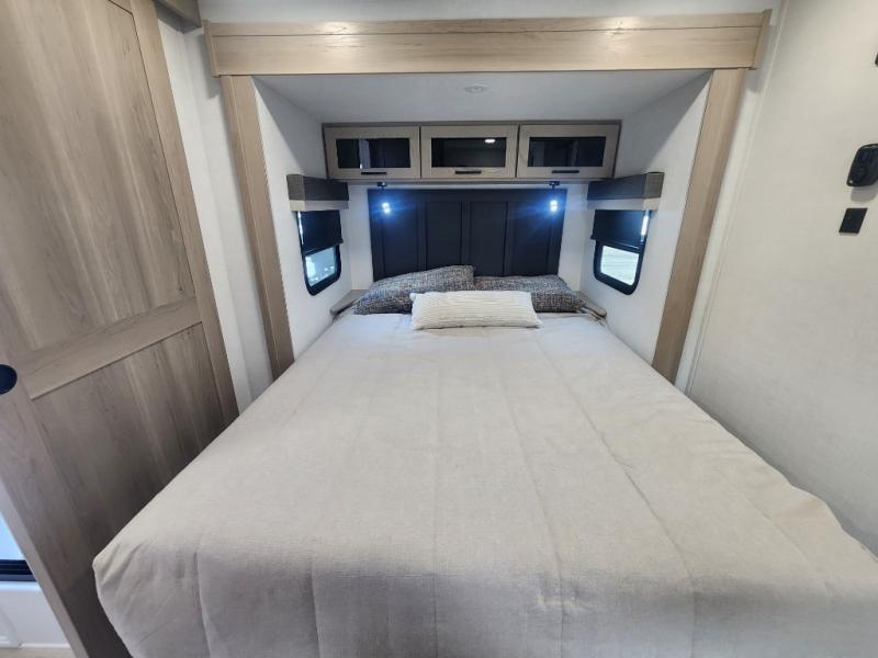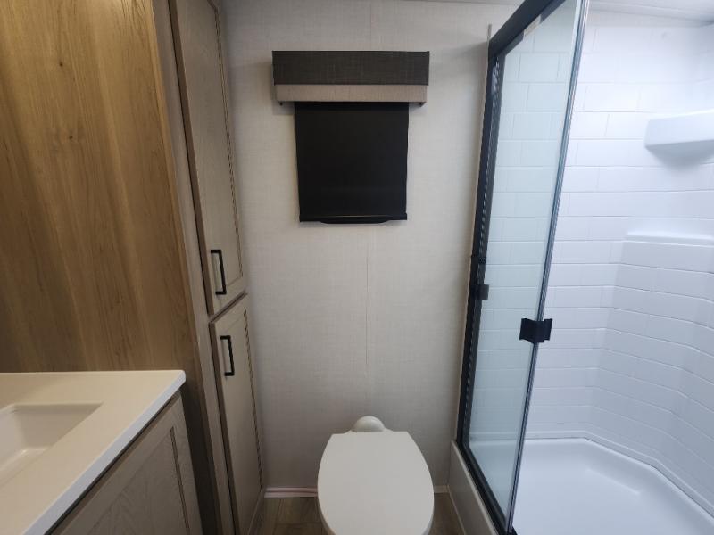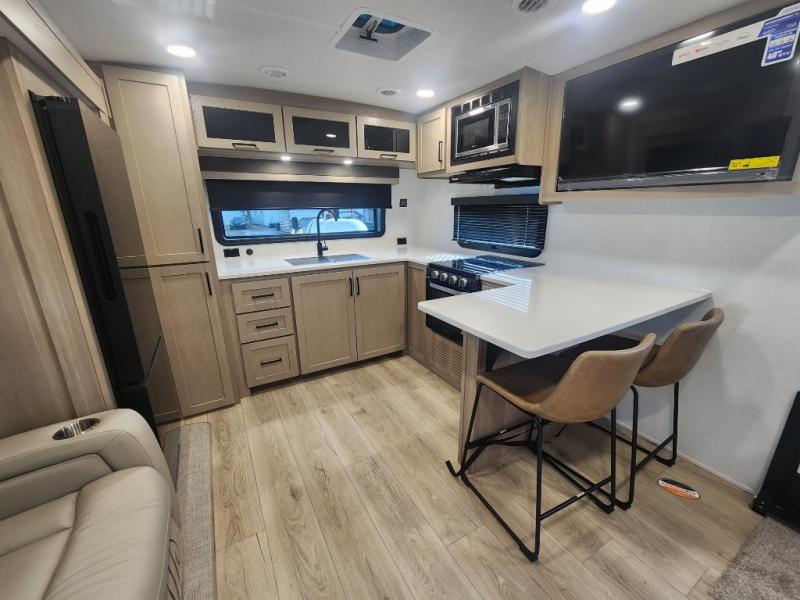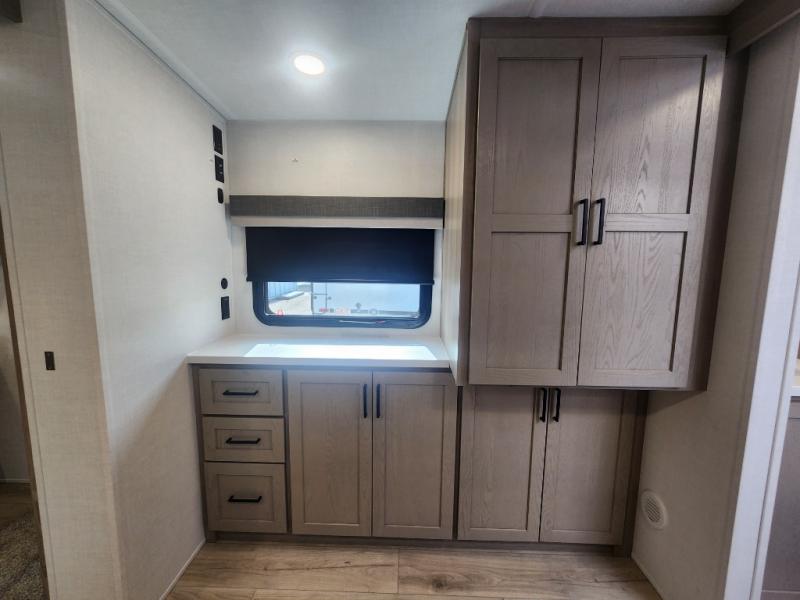 This travel trailer is the best option for you and your partner! The lavish full rear bathroom features a spacious layout and a convenient linen closet, perfect for relaxation and refreshment. The elegant bedroom boasts a plush queen bed, ample wardrobe space, and stylish dresser, creating a serene retreat. The spacious living room and kitchen combined area is the heart of the trailer, featuring plush theater seating for cozy movie nights, a generous closet for storing essentials, and a 12V Smart TV for entertainment on the go. Plus, the expansive countertop with chairs provides a perfect spot for gourmet meals or socializing, while the premium three-burner cooktop, well-stocked kitchen pantry, and high-performance microwave make meal prep and cooking a true delight.