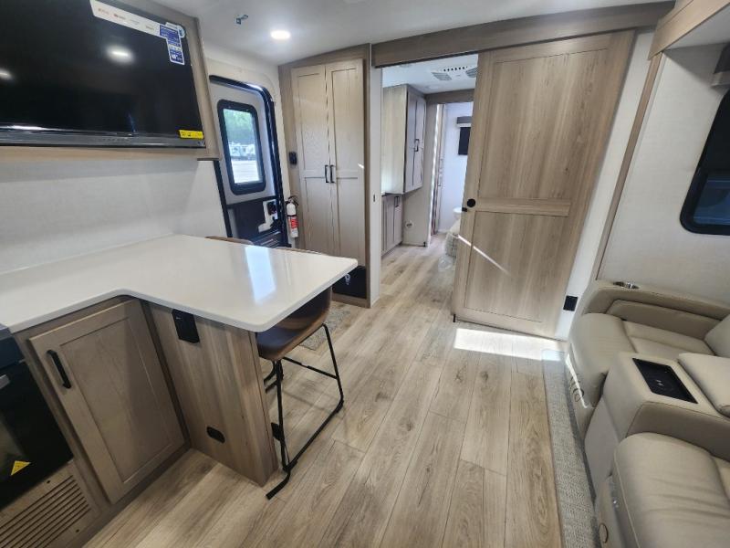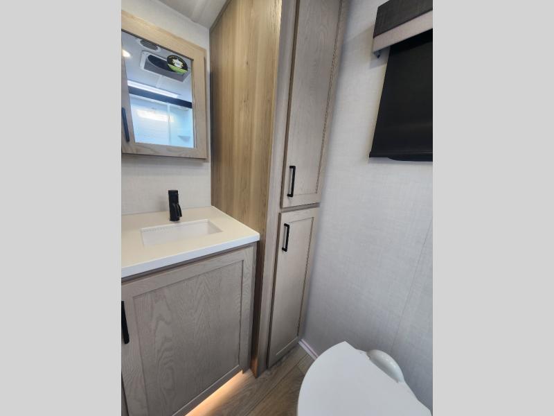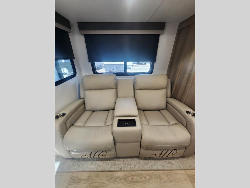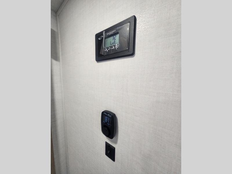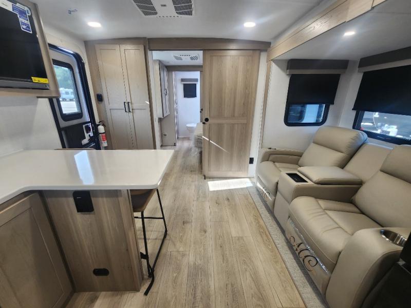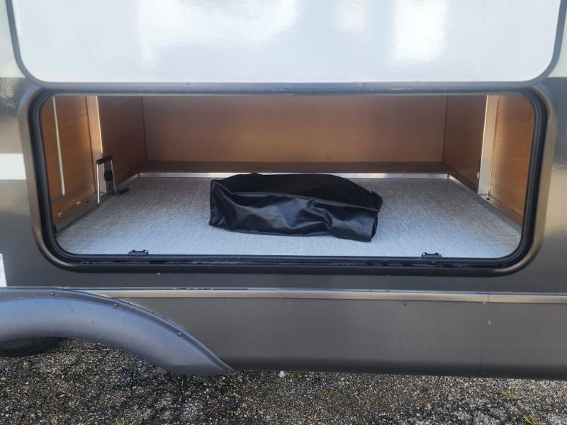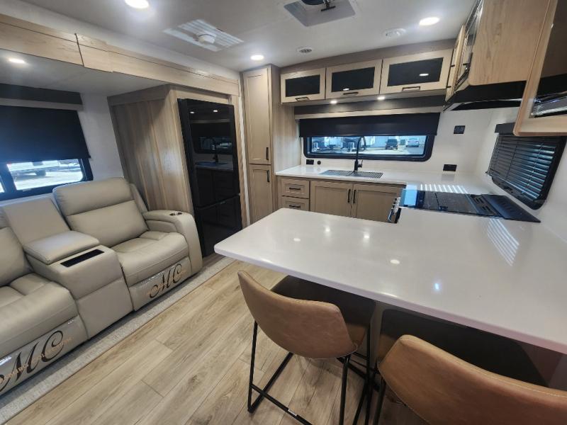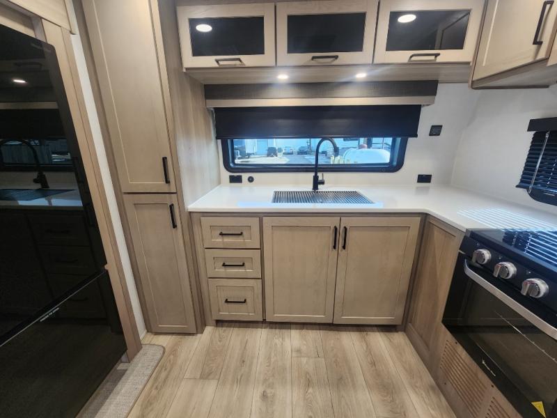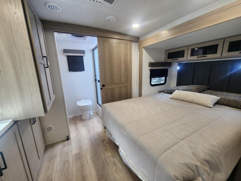 This travel trailer is the best option for you and your partner! The lavish full rear bathroom features a spacious layout and a convenient linen closet, perfect for relaxation and refreshment. The elegant bedroom boasts a plush queen bed, ample wardrobe space, and stylish dresser, creating a serene retreat. The spacious living room and kitchen combined area is the heart of the trailer, featuring plush theater seating for cozy movie nights, a generous closet for storing essentials, and a 12V Smart TV for entertainment on the go. Plus, the expansive countertop with chairs provides a perfect spot for gourmet meals or socializing, while the premium three-burner cooktop, well-stocked kitchen pantry, and high-performance microwave make meal prep and cooking a true delight.