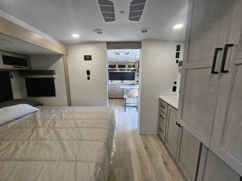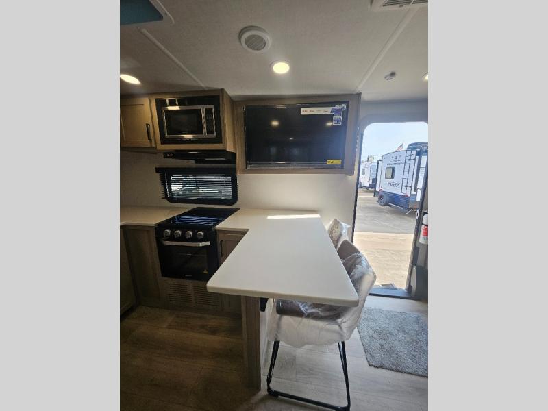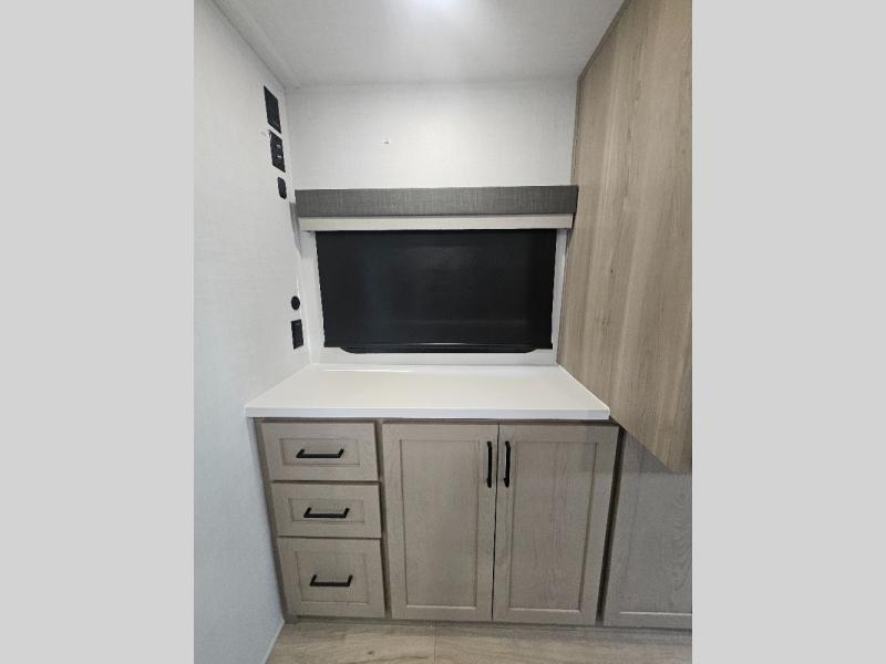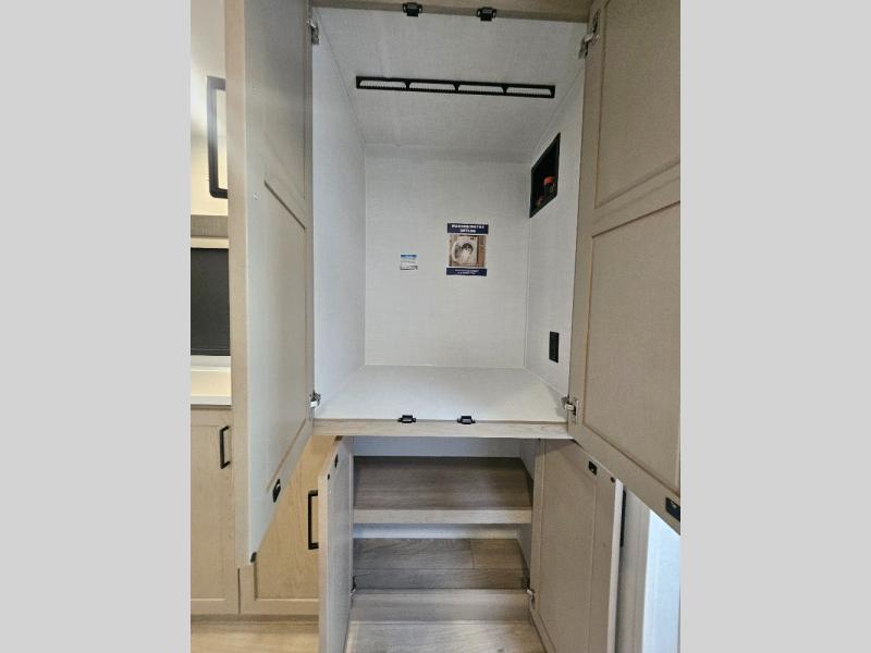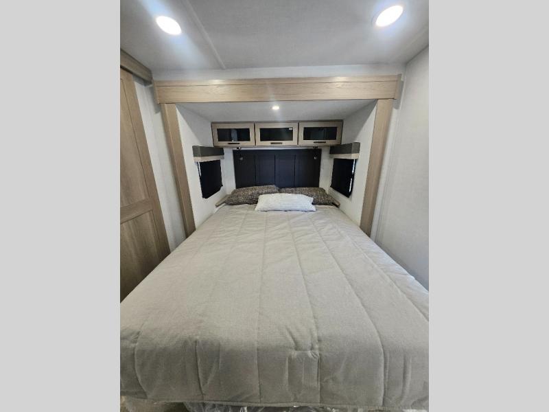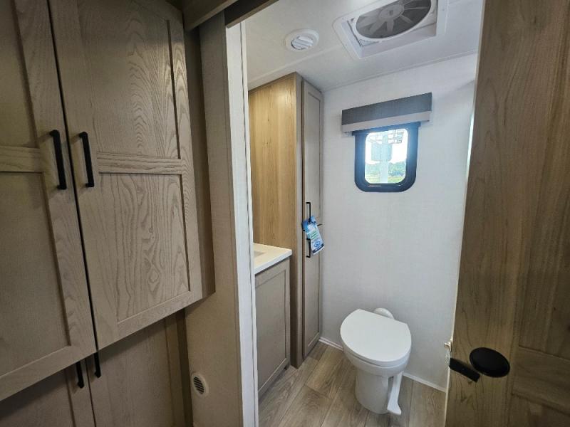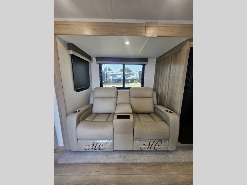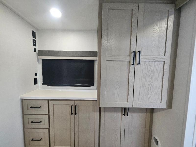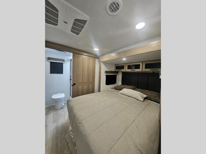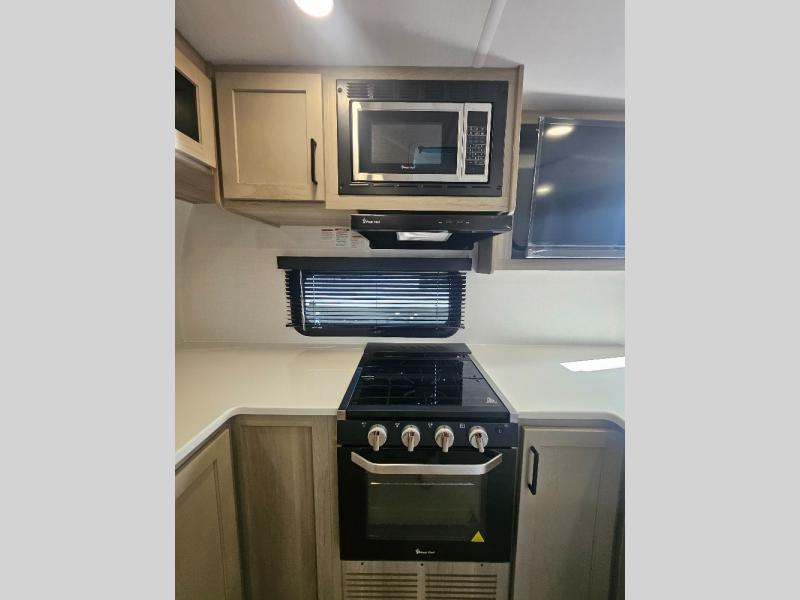 This travel trailer is the best option for you and your partner! The lavish full rear bathroom features a spacious layout and a convenient linen closet, perfect for relaxation and refreshment. The elegant bedroom boasts a plush queen bed, ample wardrobe space, and stylish dresser, creating a serene retreat. The spacious living room and kitchen combined area is the heart of the trailer, featuring plush theater seating for cozy movie nights, a generous closet for storing essentials, and a 12V Smart TV for entertainment on the go. Plus, the expansive countertop with chairs provides a perfect spot for gourmet meals or socializing, while the premium three-burner cooktop, well-stocked kitchen pantry, and high-performance microwave make meal prep and cooking a true delight.