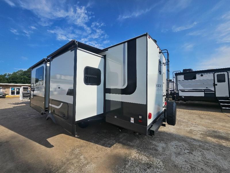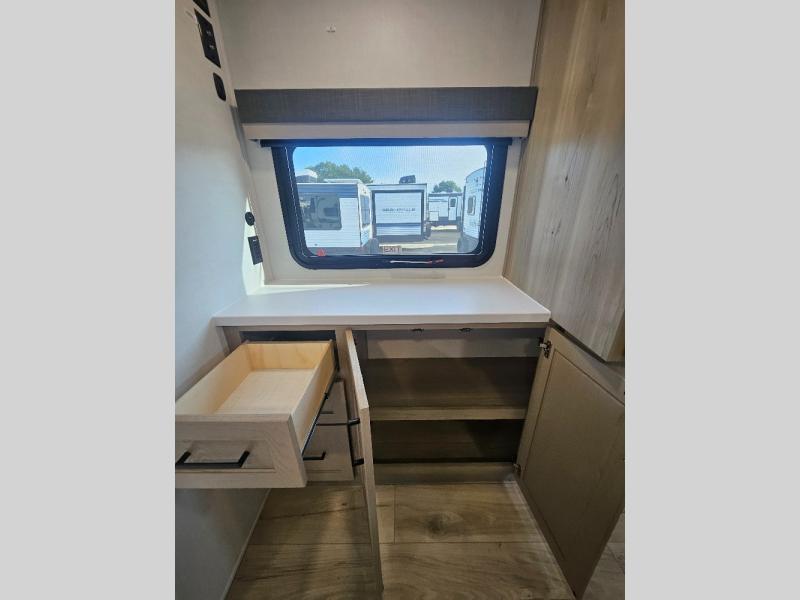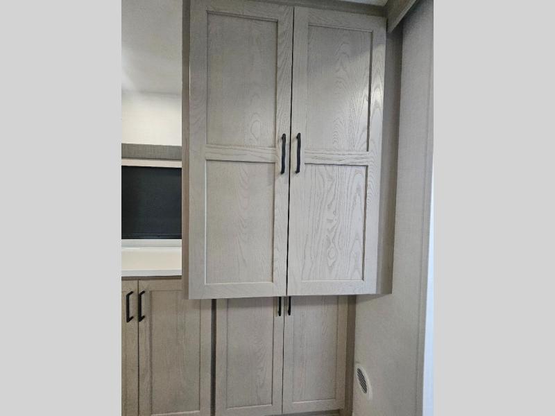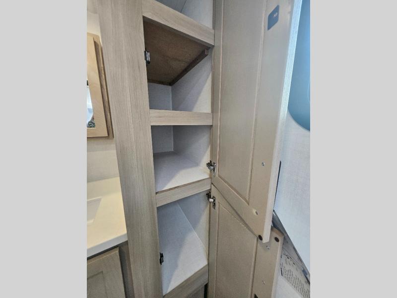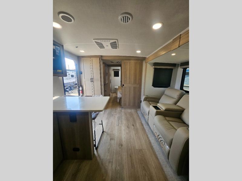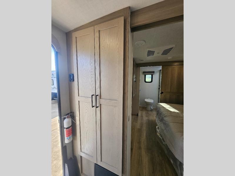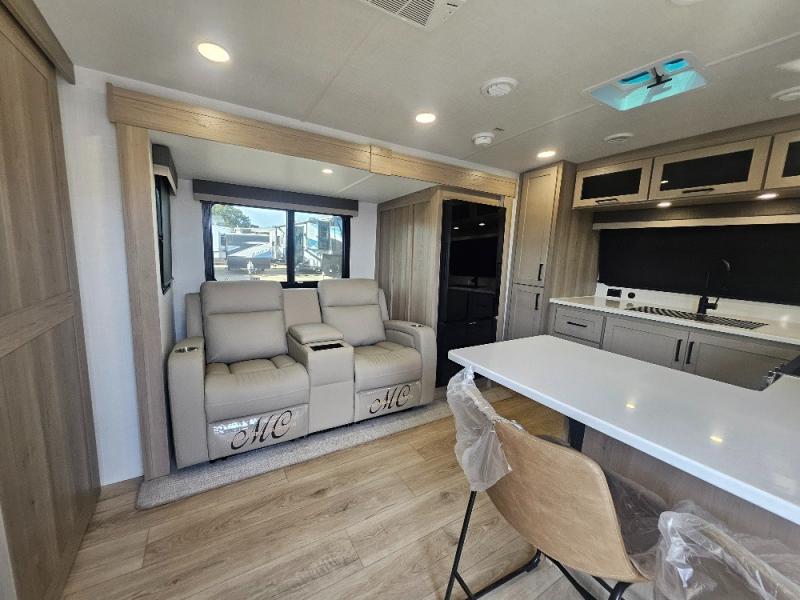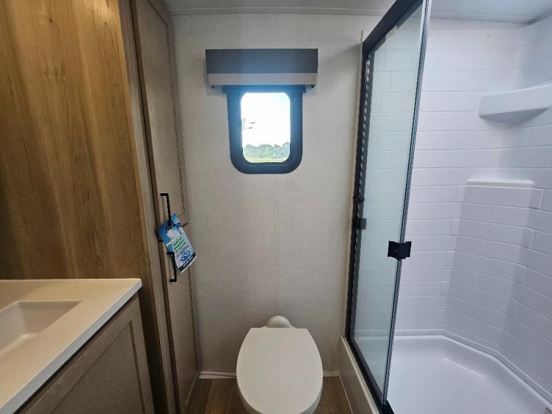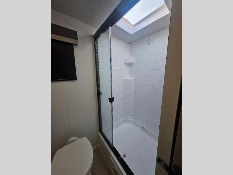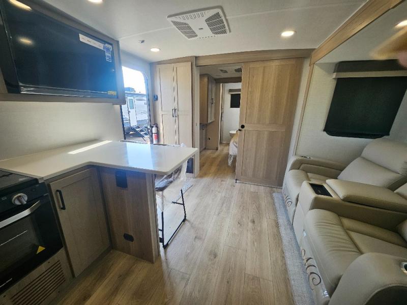 This travel trailer is the best option for you and your partner! The lavish full rear bathroom features a spacious layout and a convenient linen closet, perfect for relaxation and refreshment. The elegant bedroom boasts a plush queen bed, ample wardrobe space, and stylish dresser, creating a serene retreat. The spacious living room and kitchen combined area is the heart of the trailer, featuring plush theater seating for cozy movie nights, a generous closet for storing essentials, and a 12V Smart TV for entertainment on the go. Plus, the expansive countertop with chairs provides a perfect spot for gourmet meals or socializing, while the premium three-burner cooktop, well-stocked kitchen pantry, and high-performance microwave make meal prep and cooking a true delight.