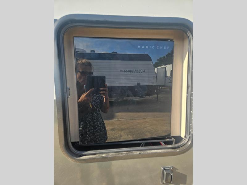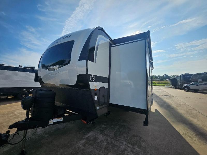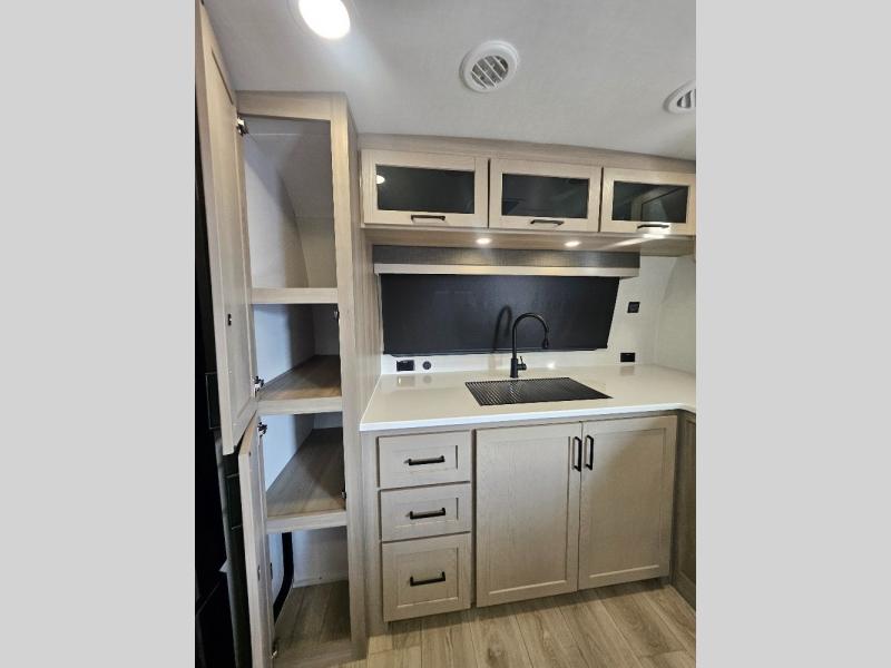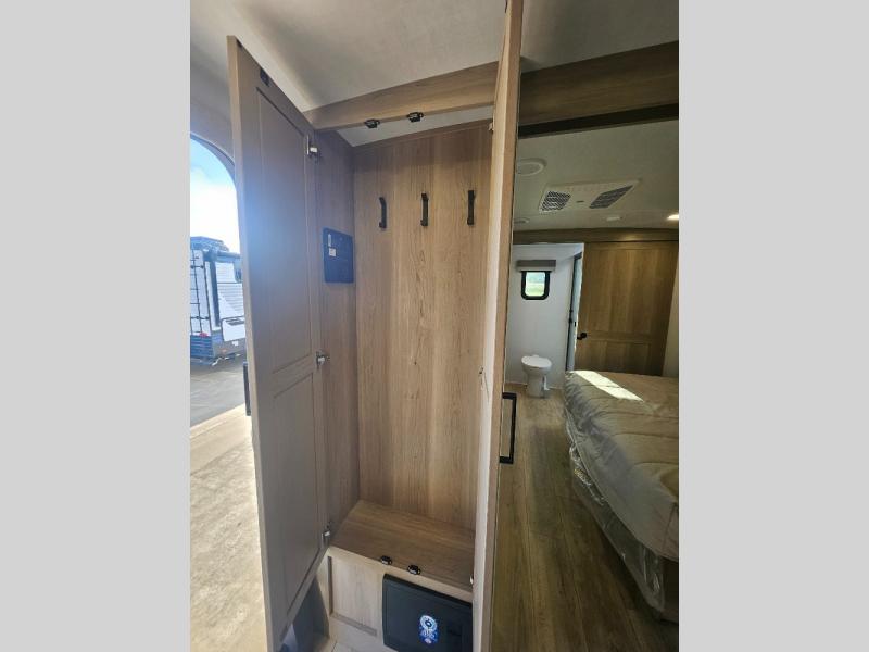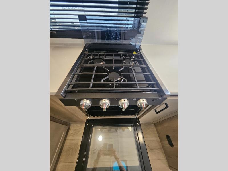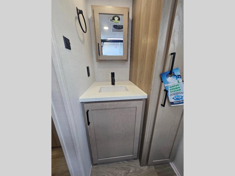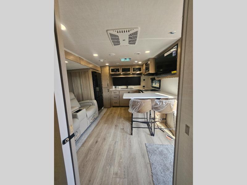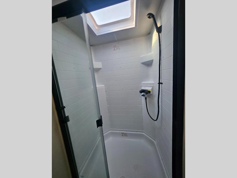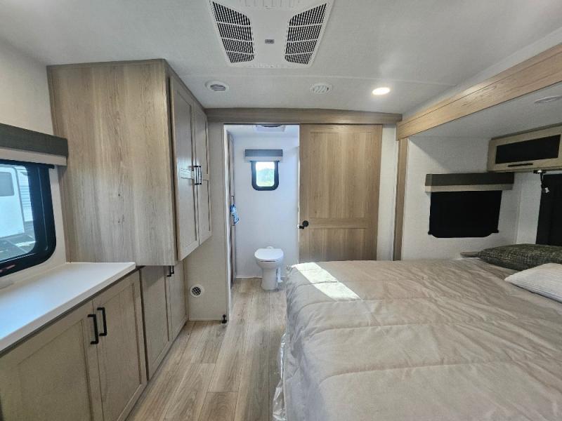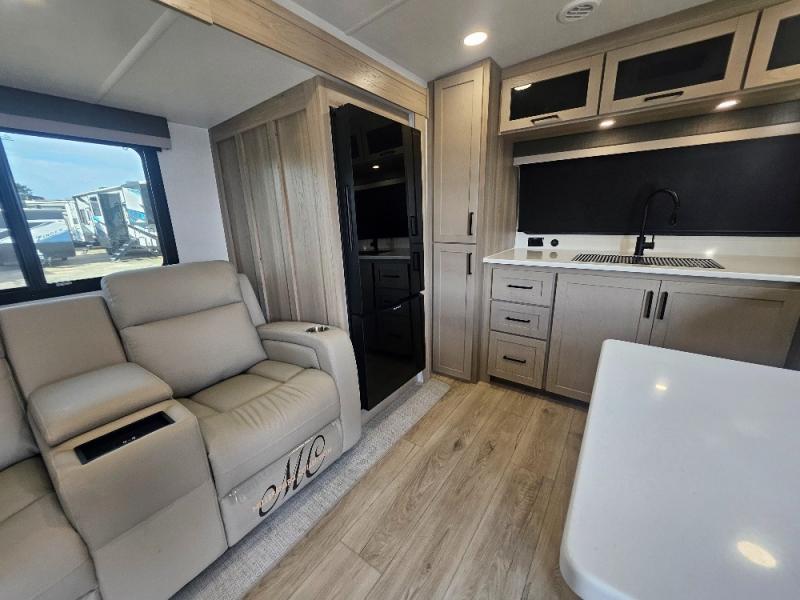 This travel trailer is the best option for you and your partner! The lavish full rear bathroom features a spacious layout and a convenient linen closet, perfect for relaxation and refreshment. The elegant bedroom boasts a plush queen bed, ample wardrobe space, and stylish dresser, creating a serene retreat. The spacious living room and kitchen combined area is the heart of the trailer, featuring plush theater seating for cozy movie nights, a generous closet for storing essentials, and a 12V Smart TV for entertainment on the go. Plus, the expansive countertop with chairs provides a perfect spot for gourmet meals or socializing, while the premium three-burner cooktop, well-stocked kitchen pantry, and high-performance microwave make meal prep and cooking a true delight.