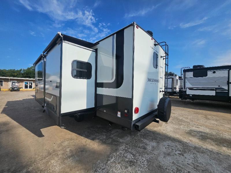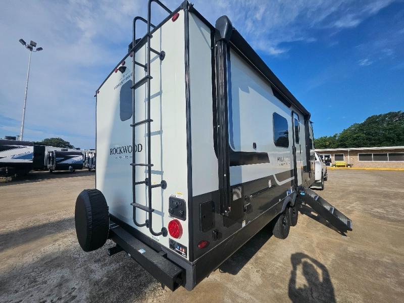 Each Rockwood Mini Lite travel trailer by Forest River is constructed with a fully laminated one-piece walkable roof, sleek frameless windows, and a six-sided full aluminum frame for strength and durability. The 12V thermostatically controlled heated tanks, plus radiant foil in the underbelly will allow you to camp well into the colder months, and the 200W roof solar panel will be perfect for a little off-gridding. Each model includes solid surface kitchen countertops, hidden hinge cabinet doors, roller shades, plus many more interior features. Having an AIR 360+ omnidirectional antenna with WiFi prep on board gives you the option to get some work done if it's needed, and the power tongue jack provides hassle-free set up, so you can enjoy more time relaxing!