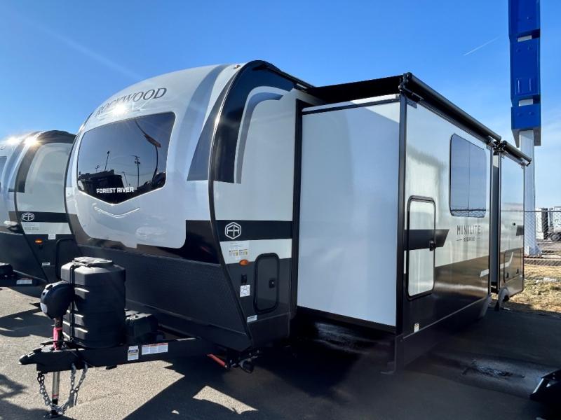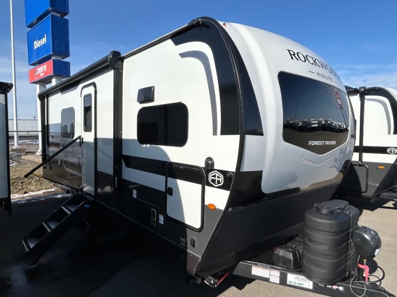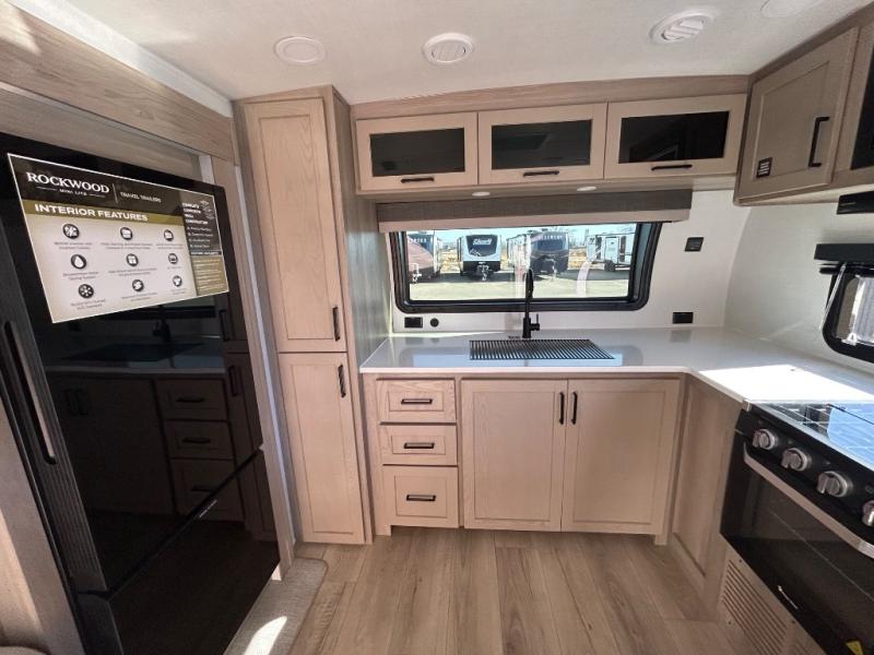 Each Rockwood Mini Lite travel trailer by Forest River is constructed with a fully laminated one-piece walkable roof, sleek frameless windows, and a six-sided full aluminum frame for strength and durability. The 12V thermostatically controlled heated tanks, plus radiant foil in the underbelly will allow you to camp well into the colder months, and the 200W roof solar panel will be perfect for a little off-gridding. Each model includes solid surface kitchen countertops, hidden hinge cabinet doors, roller shades, plus many more interior features. Having an AIR 360+ omnidirectional antenna with WiFi prep on board gives you the option to get some work done if it's needed, and the power tongue jack provides hassle-free set up, so you can enjoy more time relaxing!
