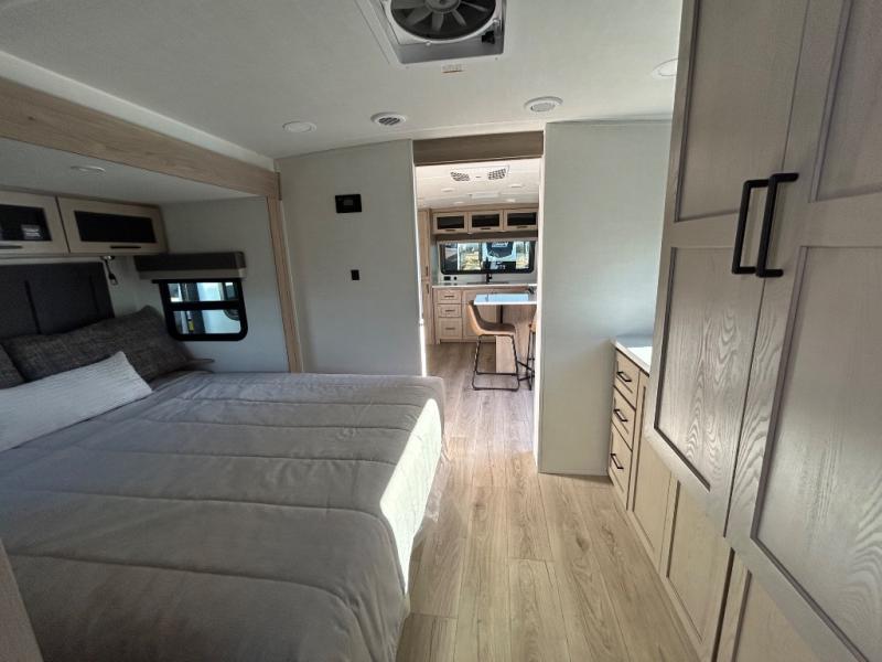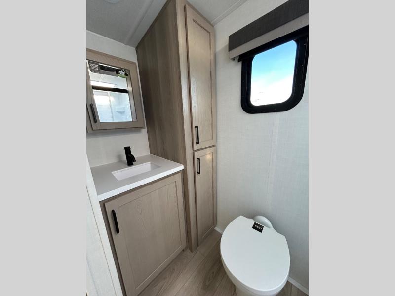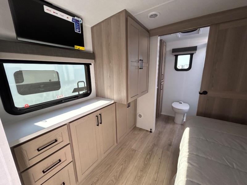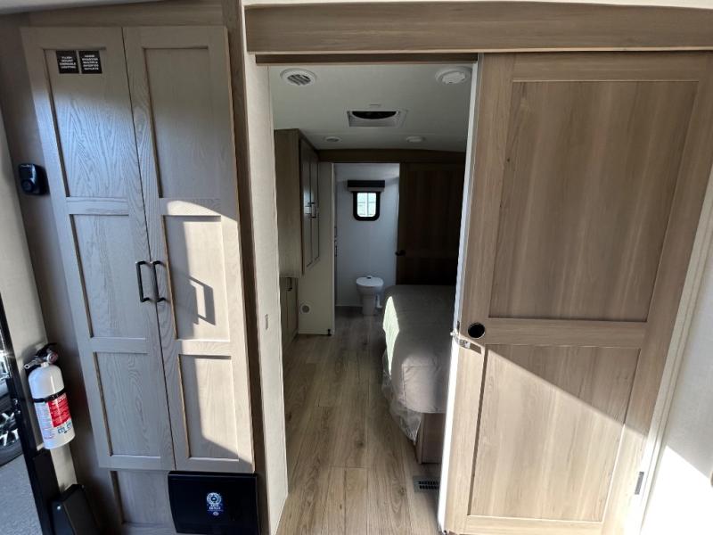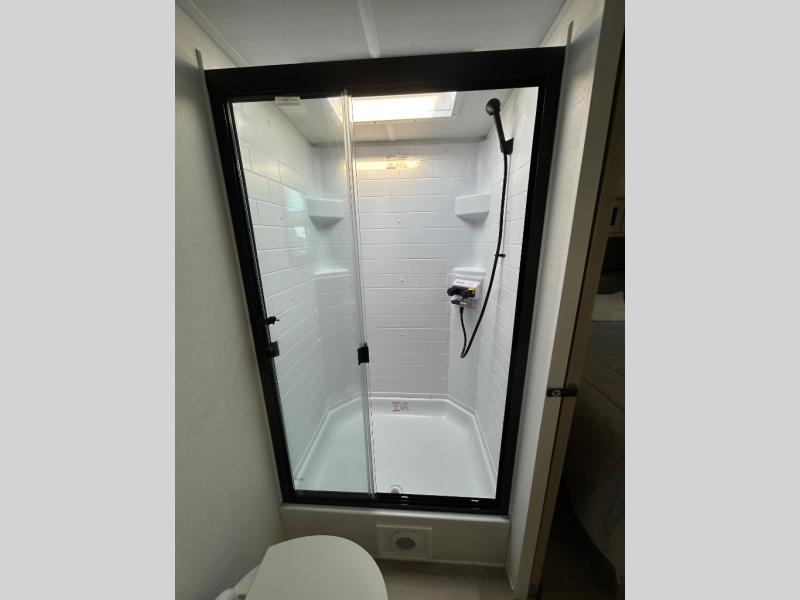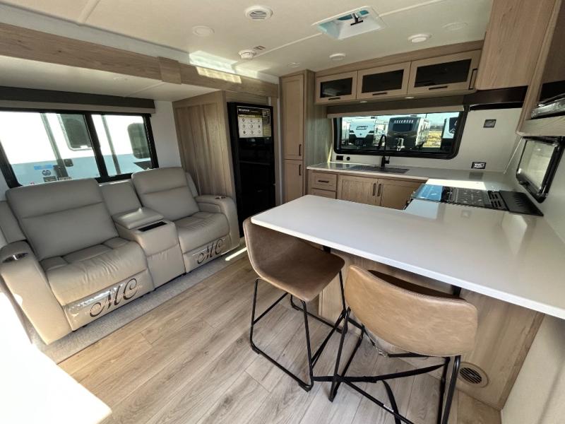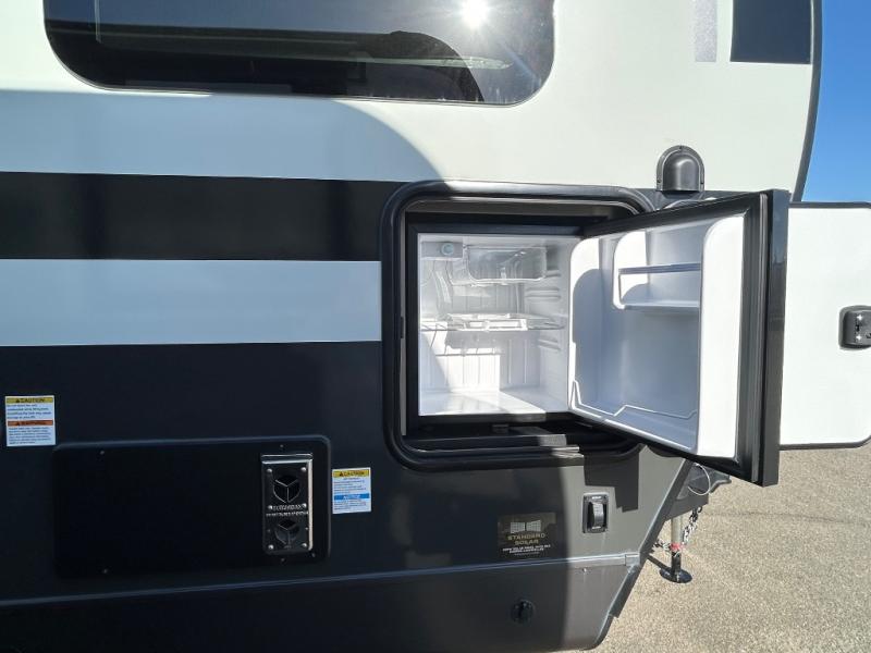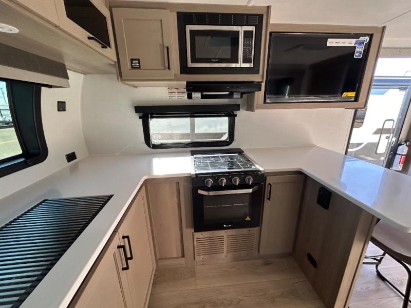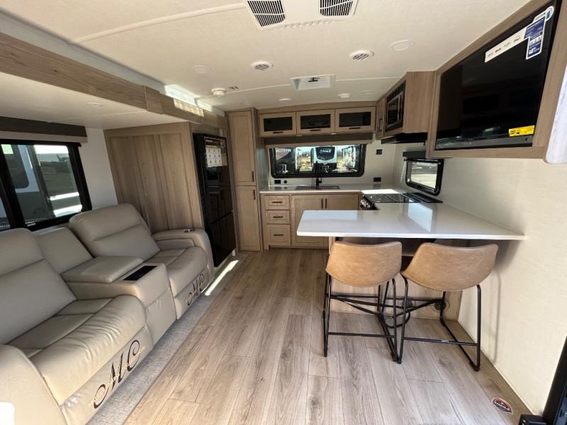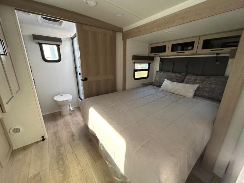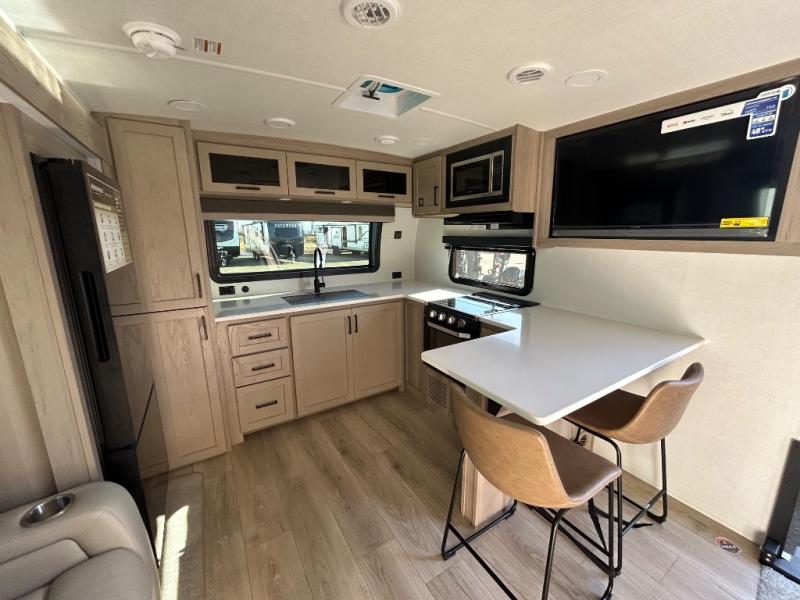 This travel trailer is the best option for you and your partner! The lavish full rear bathroom features a spacious layout and a convenient linen closet, perfect for relaxation and refreshment. The elegant bedroom boasts a plush queen bed, ample wardrobe space, and stylish dresser, creating a serene retreat. The spacious living room and kitchen combined area is the heart of the trailer, featuring plush theater seating for cozy movie nights, a generous closet for storing essentials, and a 12V Smart TV for entertainment on the go. Plus, the expansive countertop with chairs provides a perfect spot for gourmet meals or socializing, while the premium three-burner cooktop, well-stocked kitchen pantry, and high-performance microwave make meal prep and cooking a true delight.