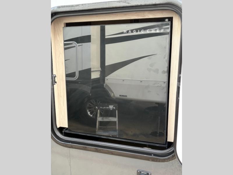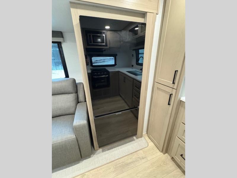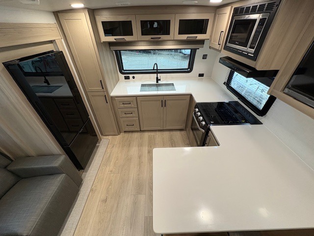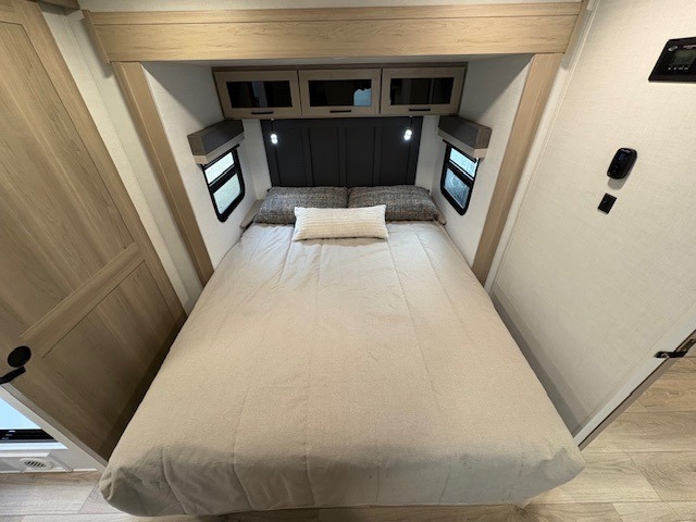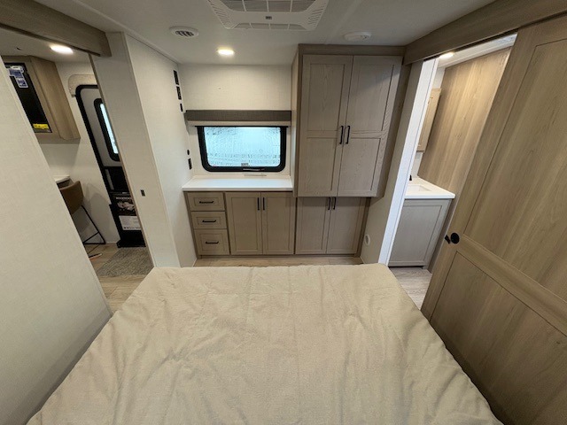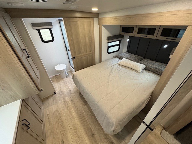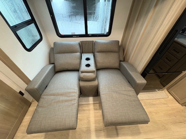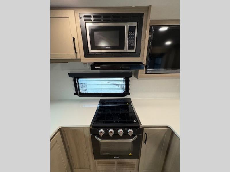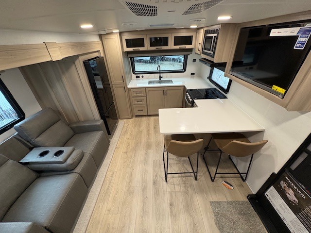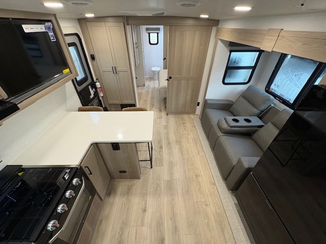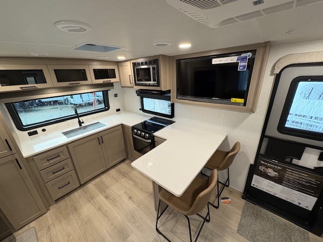 This travel trailer is the best option for you and your partner! The lavish full rear bathroom features a spacious layout and a convenient linen closet, perfect for relaxation and refreshment. The elegant bedroom boasts a plush queen bed, ample wardrobe space, and stylish dresser, creating a serene retreat. The spacious living room and kitchen combined area is the heart of the trailer, featuring plush theater seating for cozy movie nights, a generous closet for storing essentials, and a 12V Smart TV for entertainment on the go. Plus, the expansive countertop with chairs provides a perfect spot for gourmet meals or socializing, while the premium three-burner cooktop, well-stocked kitchen pantry, and high-performance microwave make meal prep and cooking a true delight.