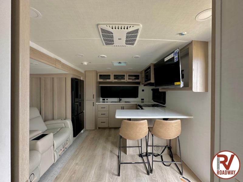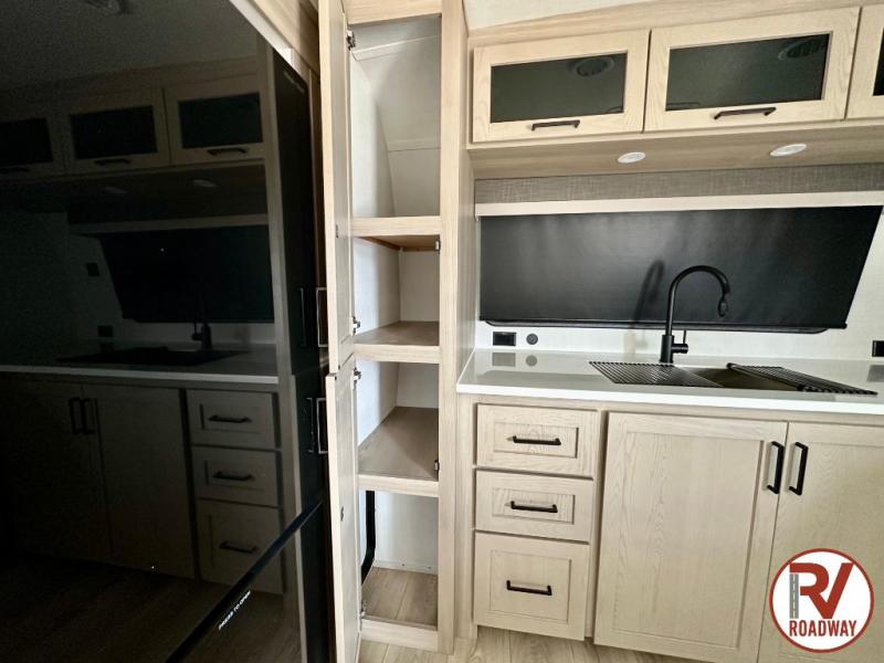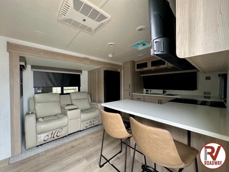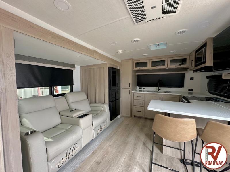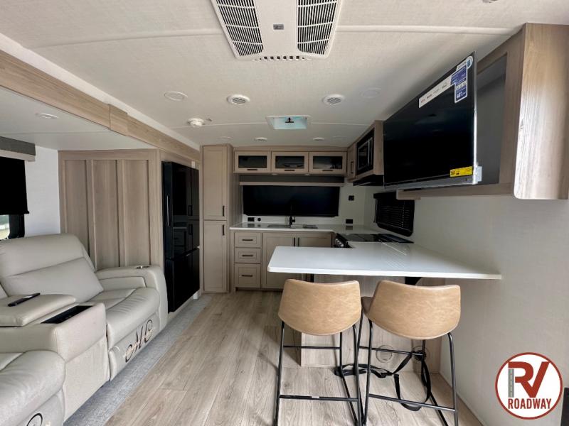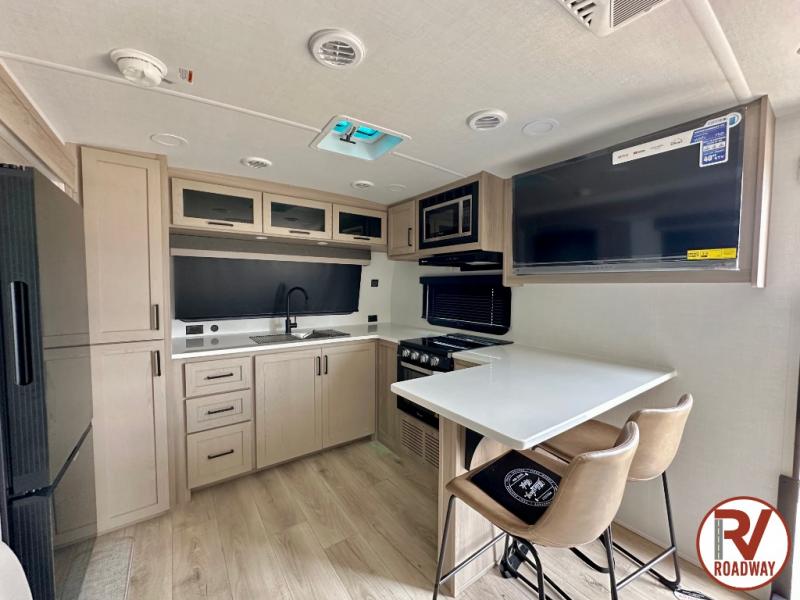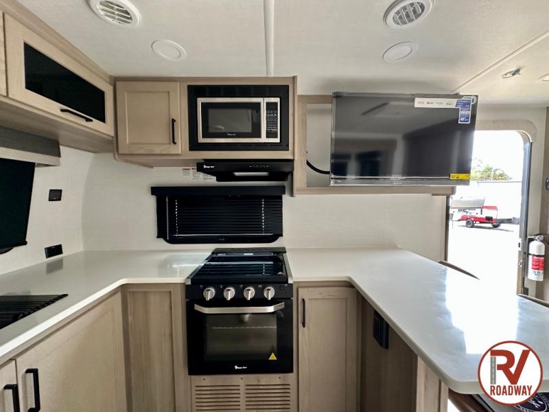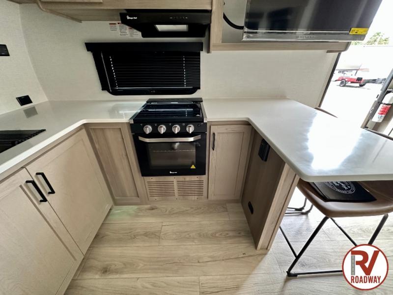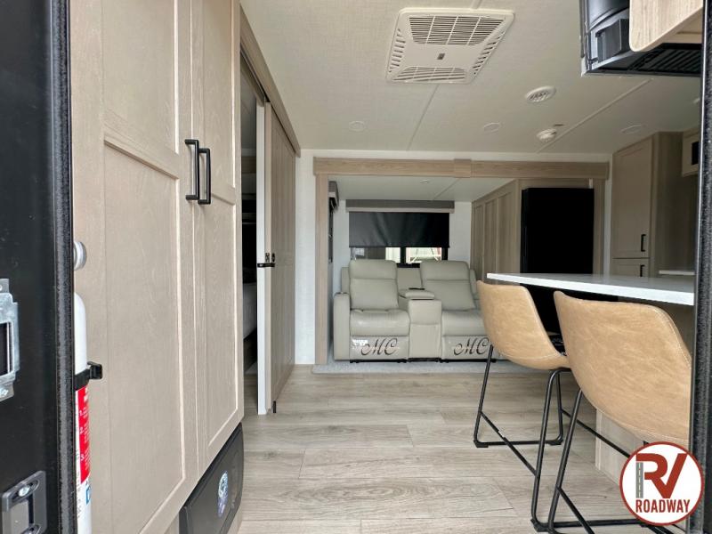 This travel trailer is the best option for you and your partner! The lavish full rear bathroom features a spacious layout and a convenient linen closet, perfect for relaxation and refreshment. The elegant bedroom boasts a plush queen bed, ample wardrobe space, and stylish dresser, creating a serene retreat. The spacious living room and kitchen combined area is the heart of the trailer, featuring plush theater seating for cozy movie nights, a generous closet for storing essentials, and a 12V Smart TV for entertainment on the go. Plus, the expansive countertop with chairs provides a perfect spot for gourmet meals or socializing, while the premium three-burner cooktop, well-stocked kitchen pantry, and high-performance microwave make meal prep and cooking a true delight.