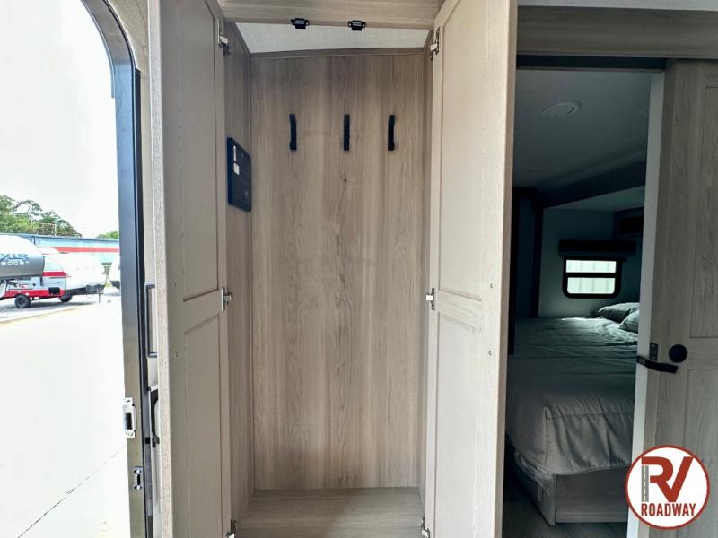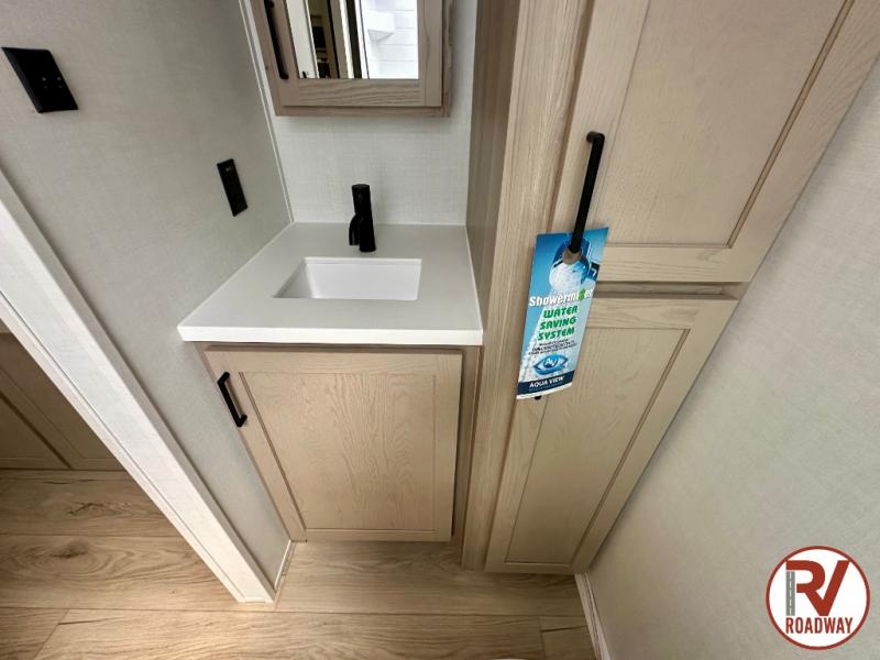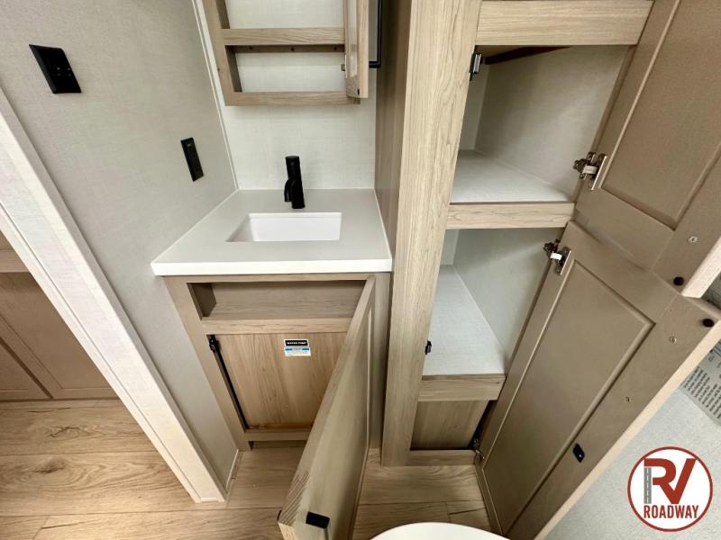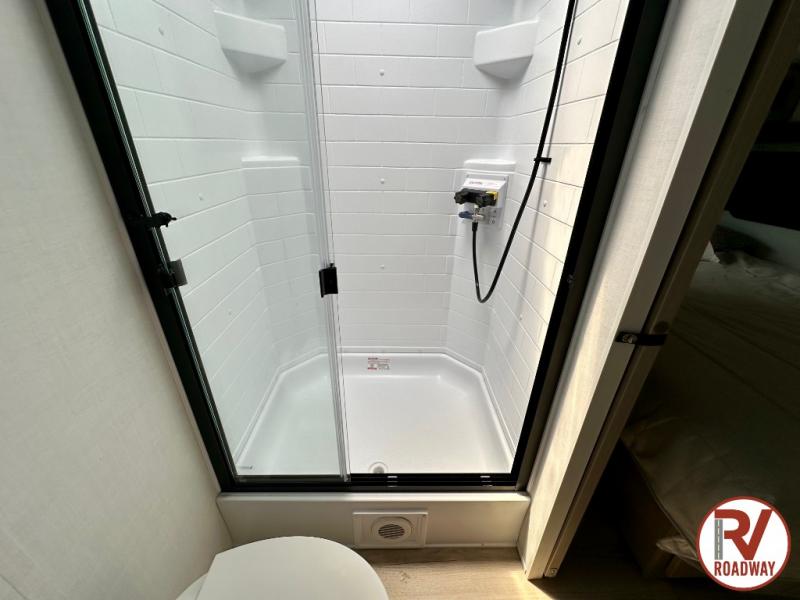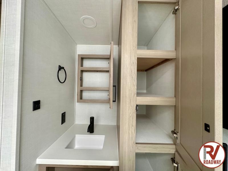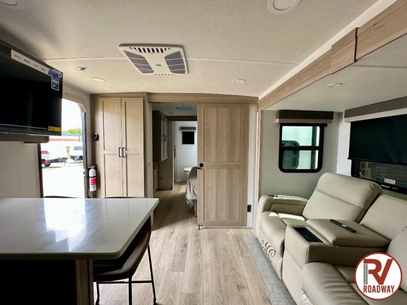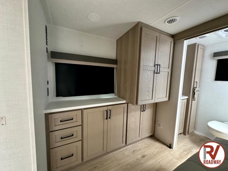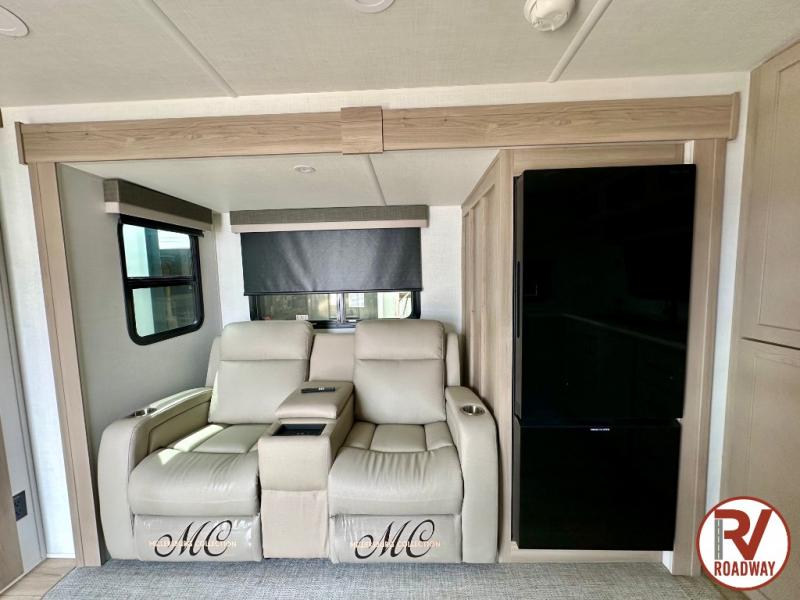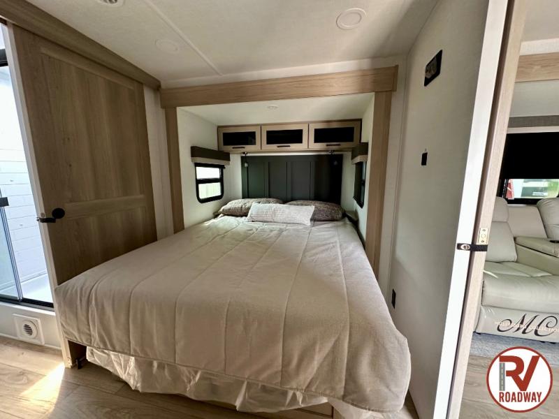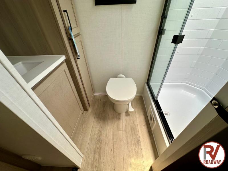 This travel trailer is the best option for you and your partner! The lavish full rear bathroom features a spacious layout and a convenient linen closet, perfect for relaxation and refreshment. The elegant bedroom boasts a plush queen bed, ample wardrobe space, and stylish dresser, creating a serene retreat. The spacious living room and kitchen combined area is the heart of the trailer, featuring plush theater seating for cozy movie nights, a generous closet for storing essentials, and a 12V Smart TV for entertainment on the go. Plus, the expansive countertop with chairs provides a perfect spot for gourmet meals or socializing, while the premium three-burner cooktop, well-stocked kitchen pantry, and high-performance microwave make meal prep and cooking a true delight.