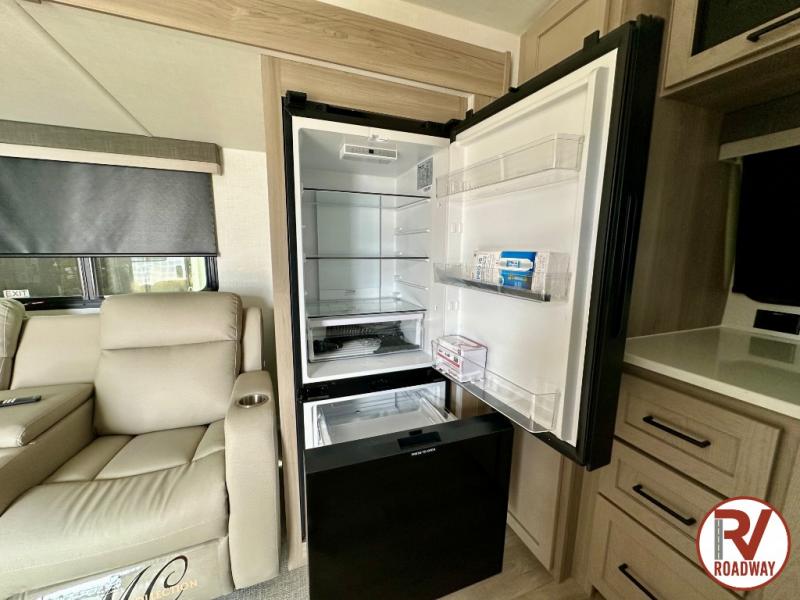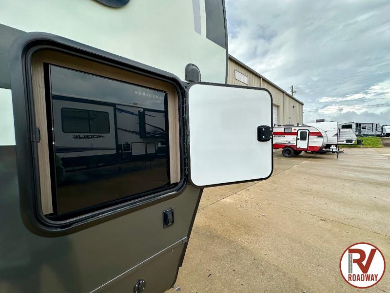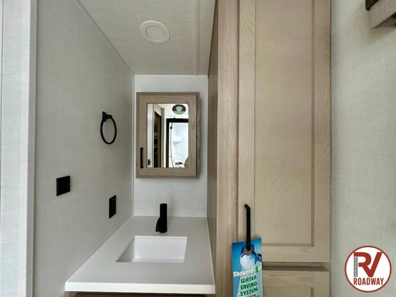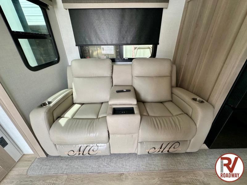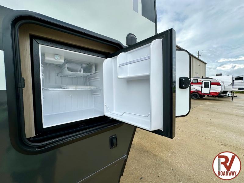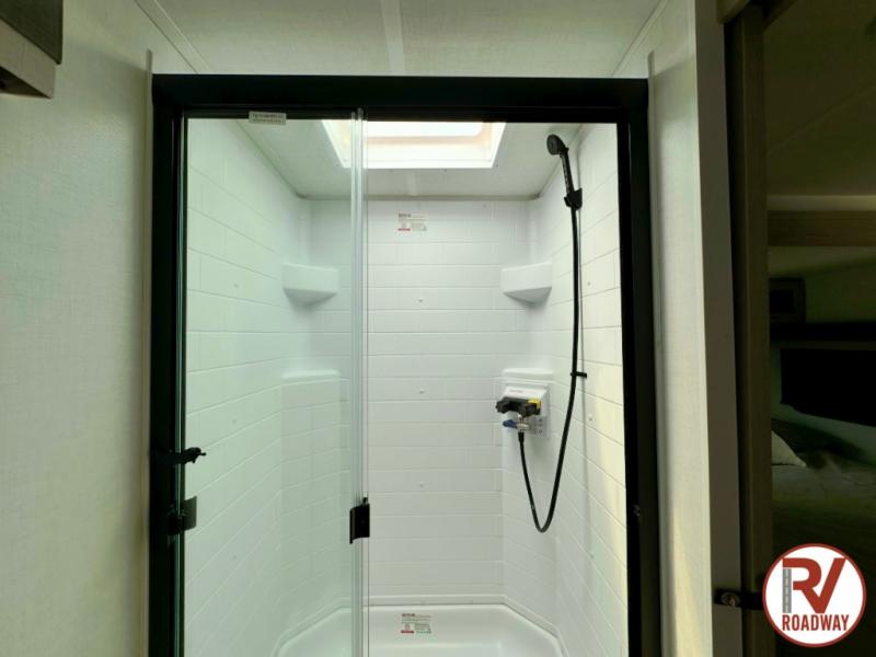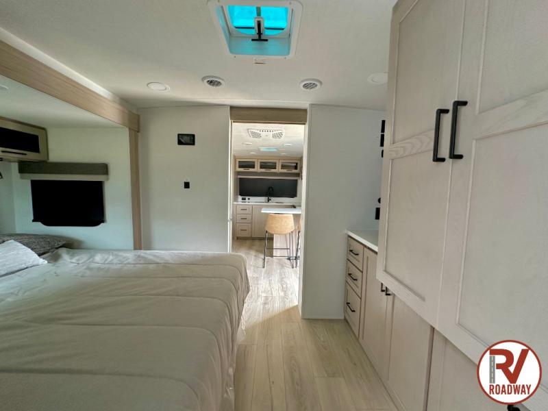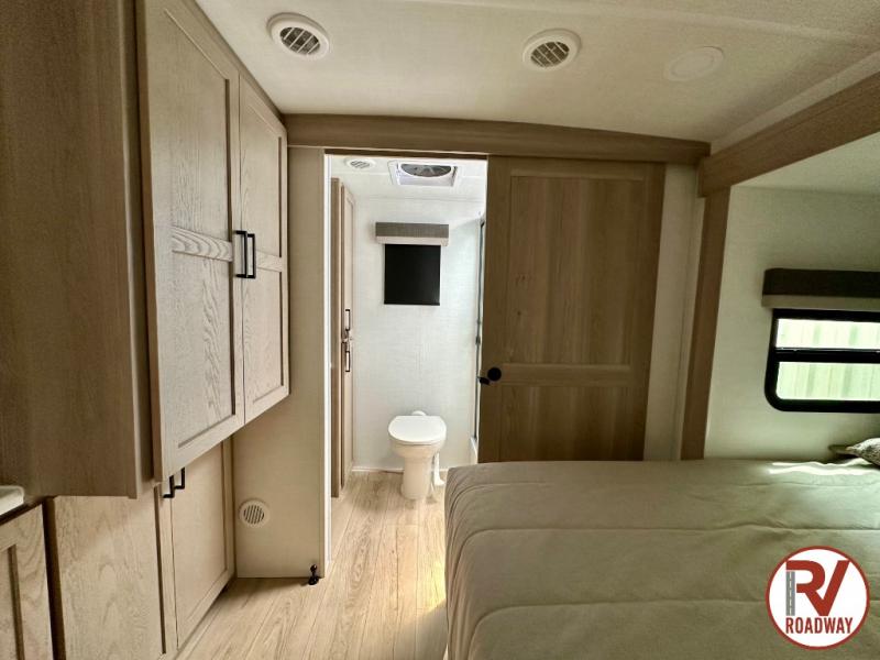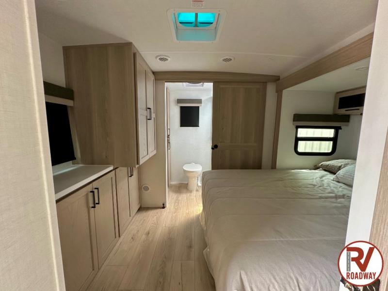 This travel trailer is the best option for you and your partner! The lavish full rear bathroom features a spacious layout and a convenient linen closet, perfect for relaxation and refreshment. The elegant bedroom boasts a plush queen bed, ample wardrobe space, and stylish dresser, creating a serene retreat. The spacious living room and kitchen combined area is the heart of the trailer, featuring plush theater seating for cozy movie nights, a generous closet for storing essentials, and a 12V Smart TV for entertainment on the go. Plus, the expansive countertop with chairs provides a perfect spot for gourmet meals or socializing, while the premium three-burner cooktop, well-stocked kitchen pantry, and high-performance microwave make meal prep and cooking a true delight.